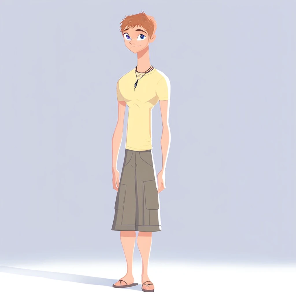 sandals, shorts, jewelry, necklace, yellow shirt, shirt, short sleeves,