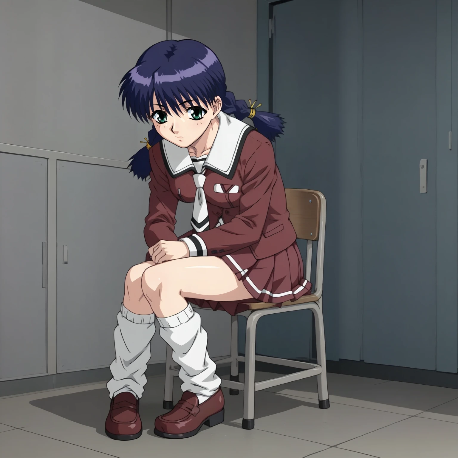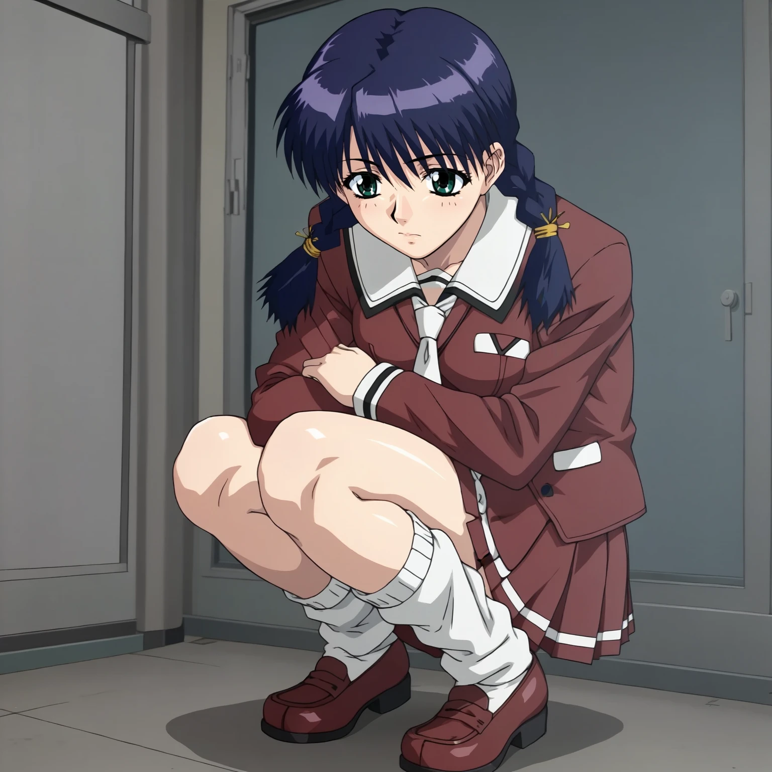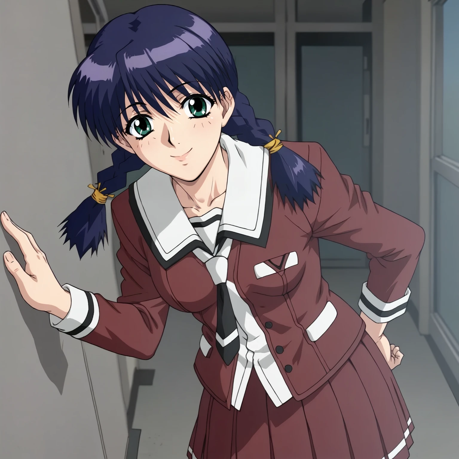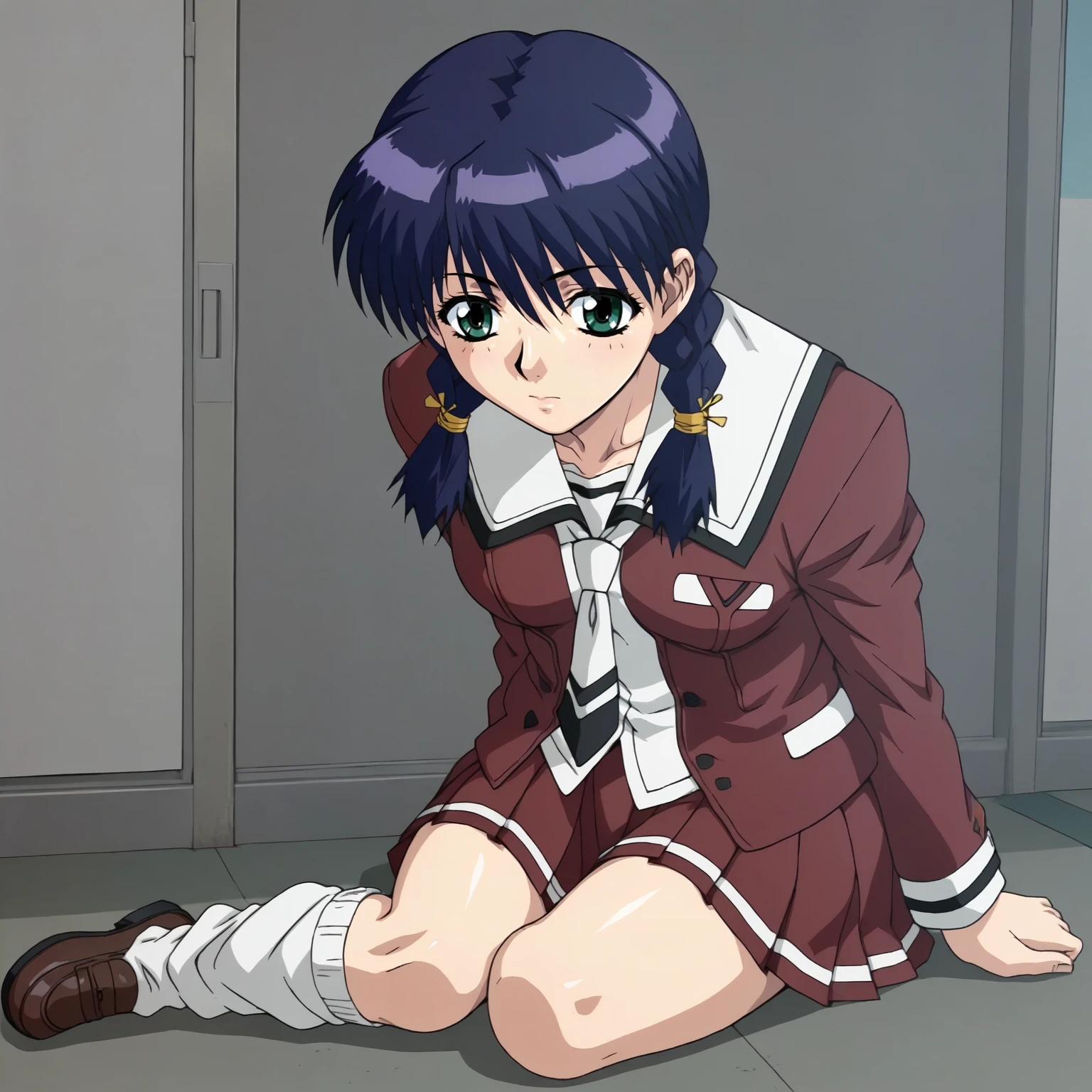 HozumiSakatsu,1girl,blue hair,twin braids,green eyes,