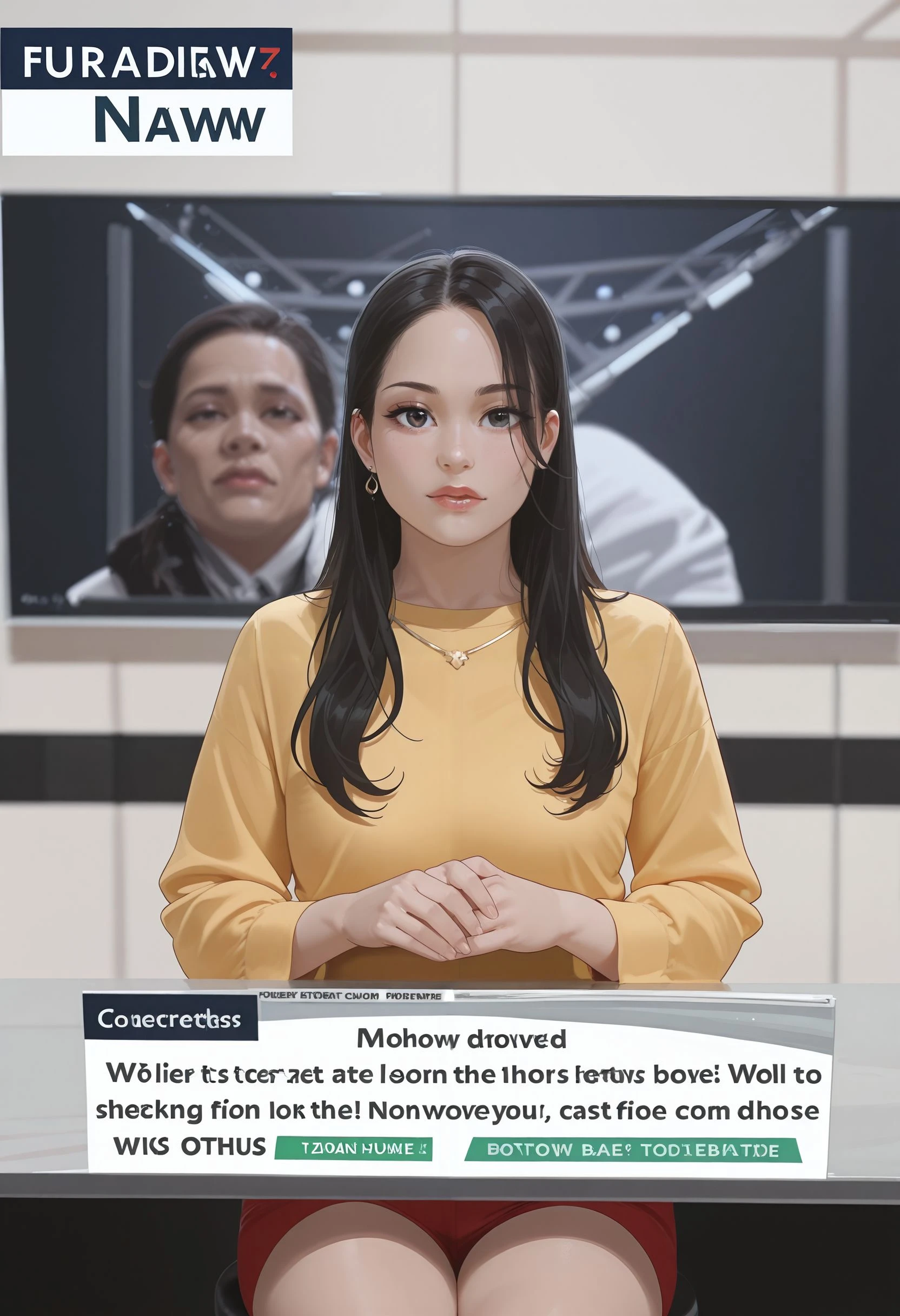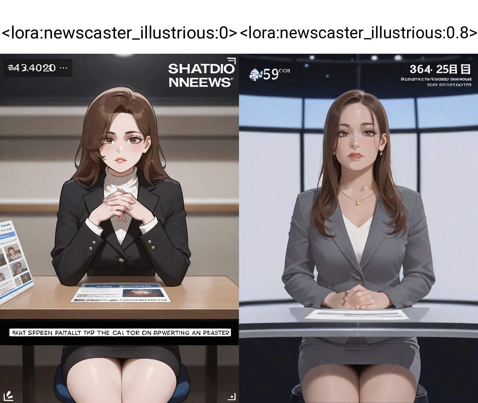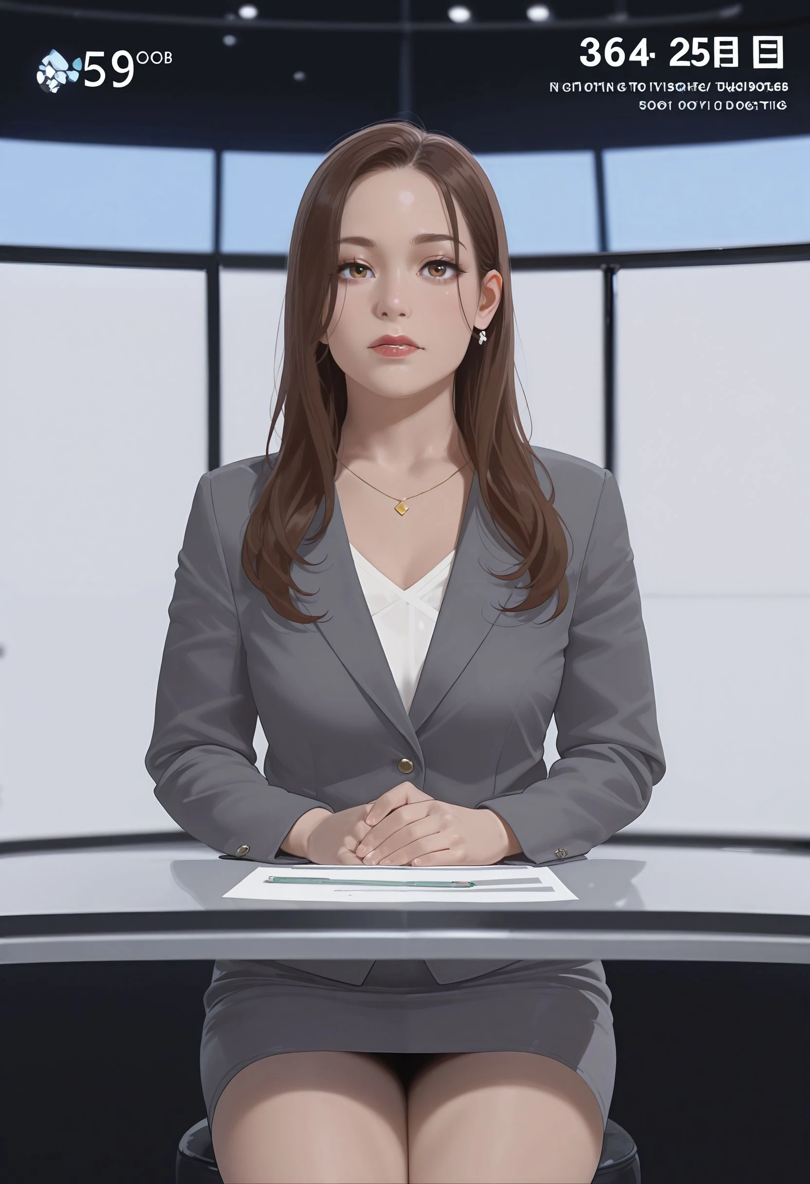 nwscstr, newscaster, announcer, female announcer, news, breaking news, studio, <lora:newscaster_illustrious:0.8>
