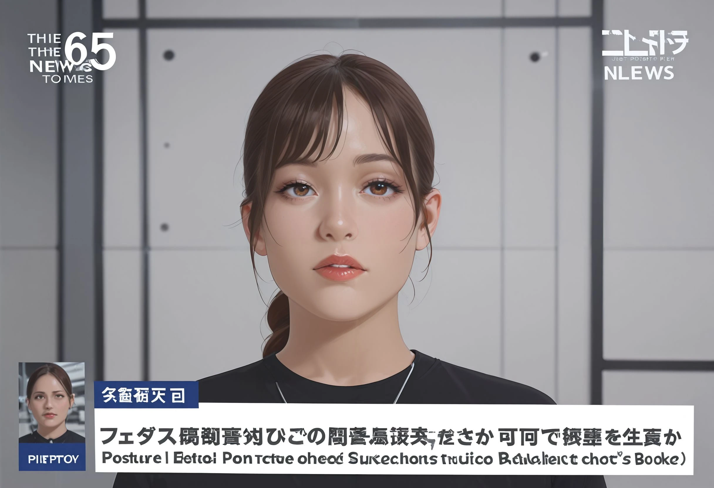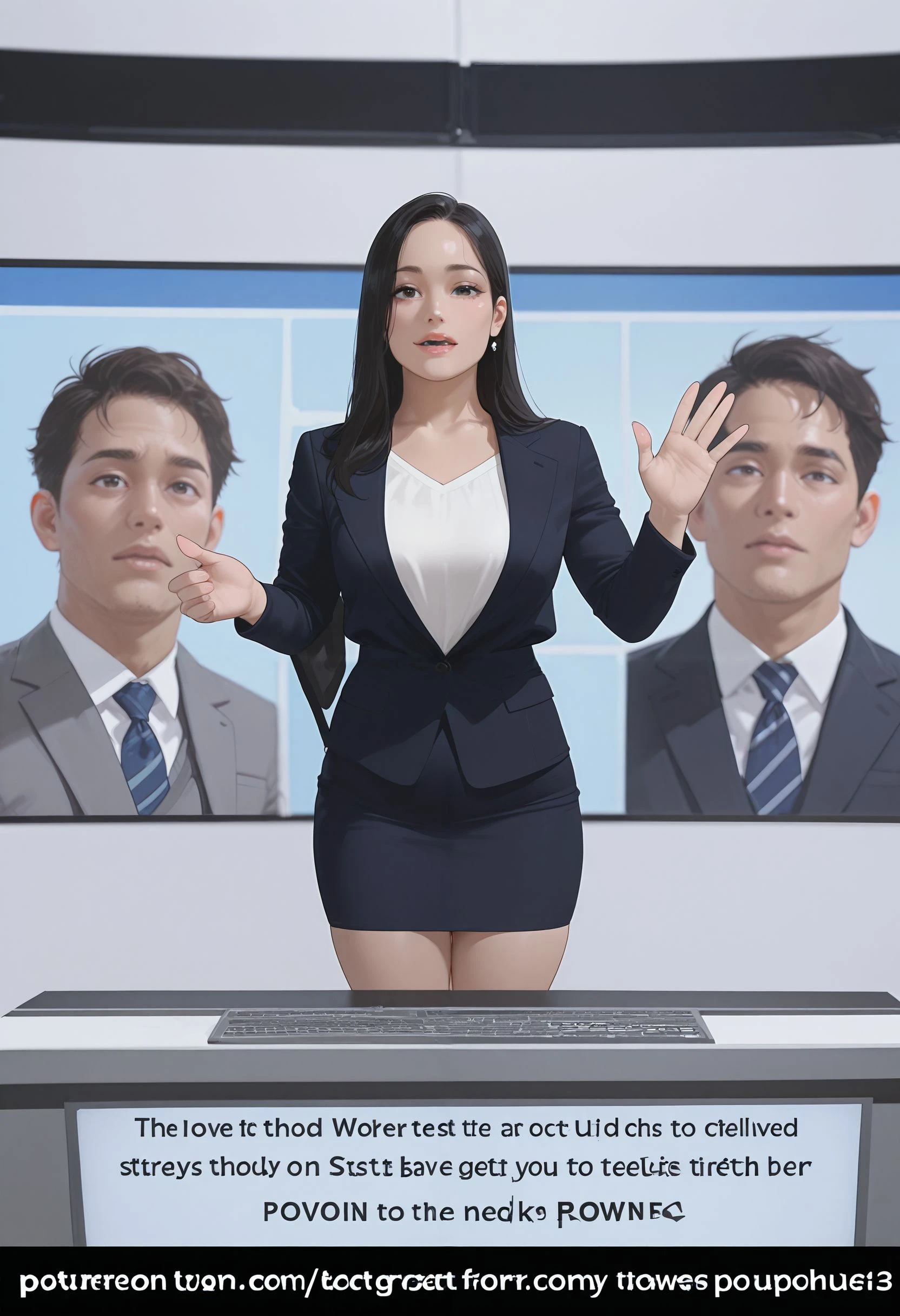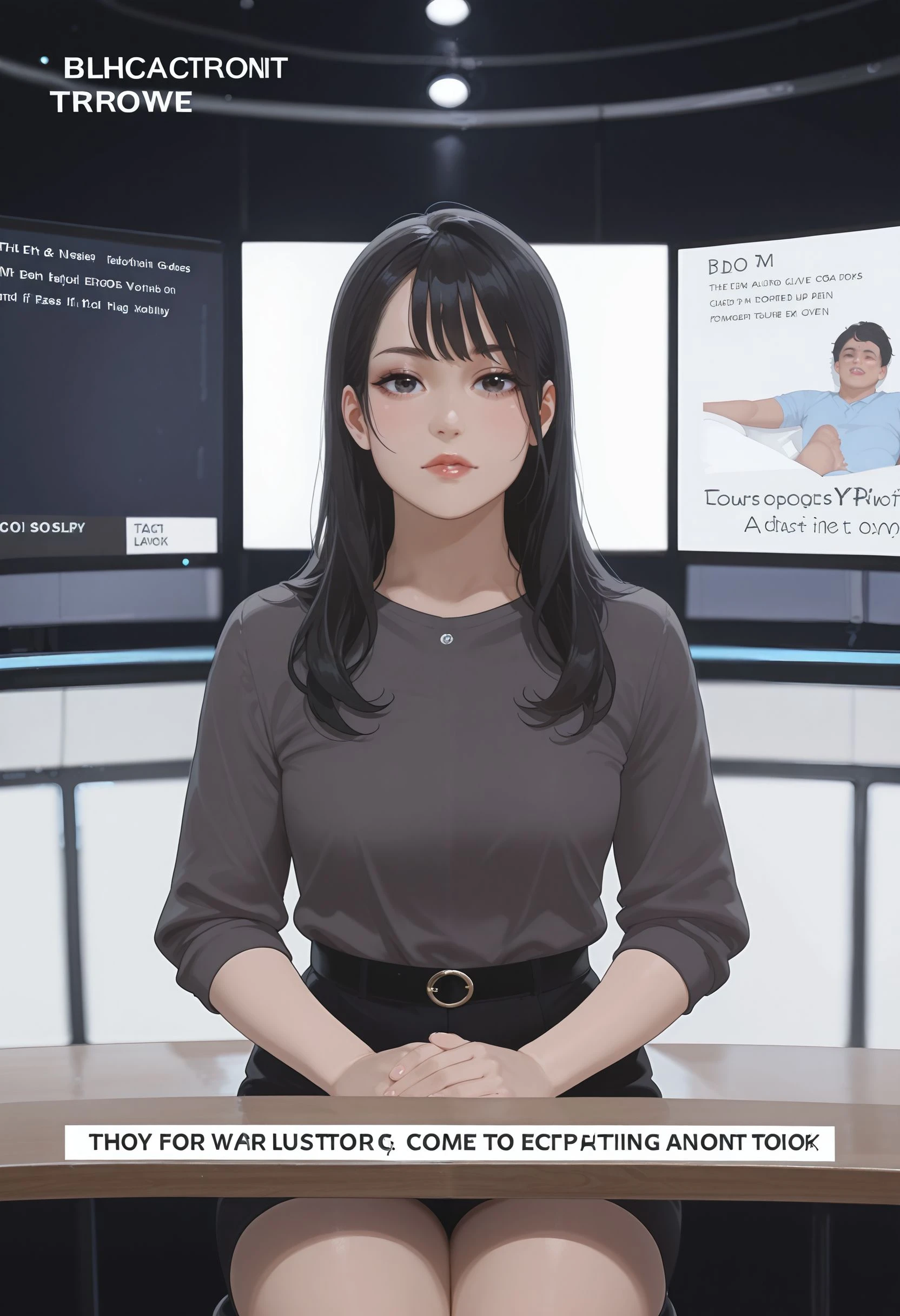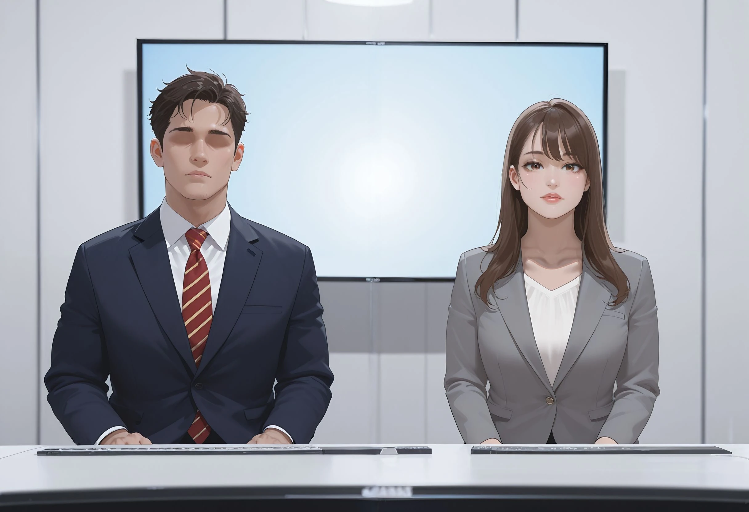 nwscstr, newscaster, announcer, female announcer, news, breaking news, studio, <lora:newscaster_illustrious:0.8>