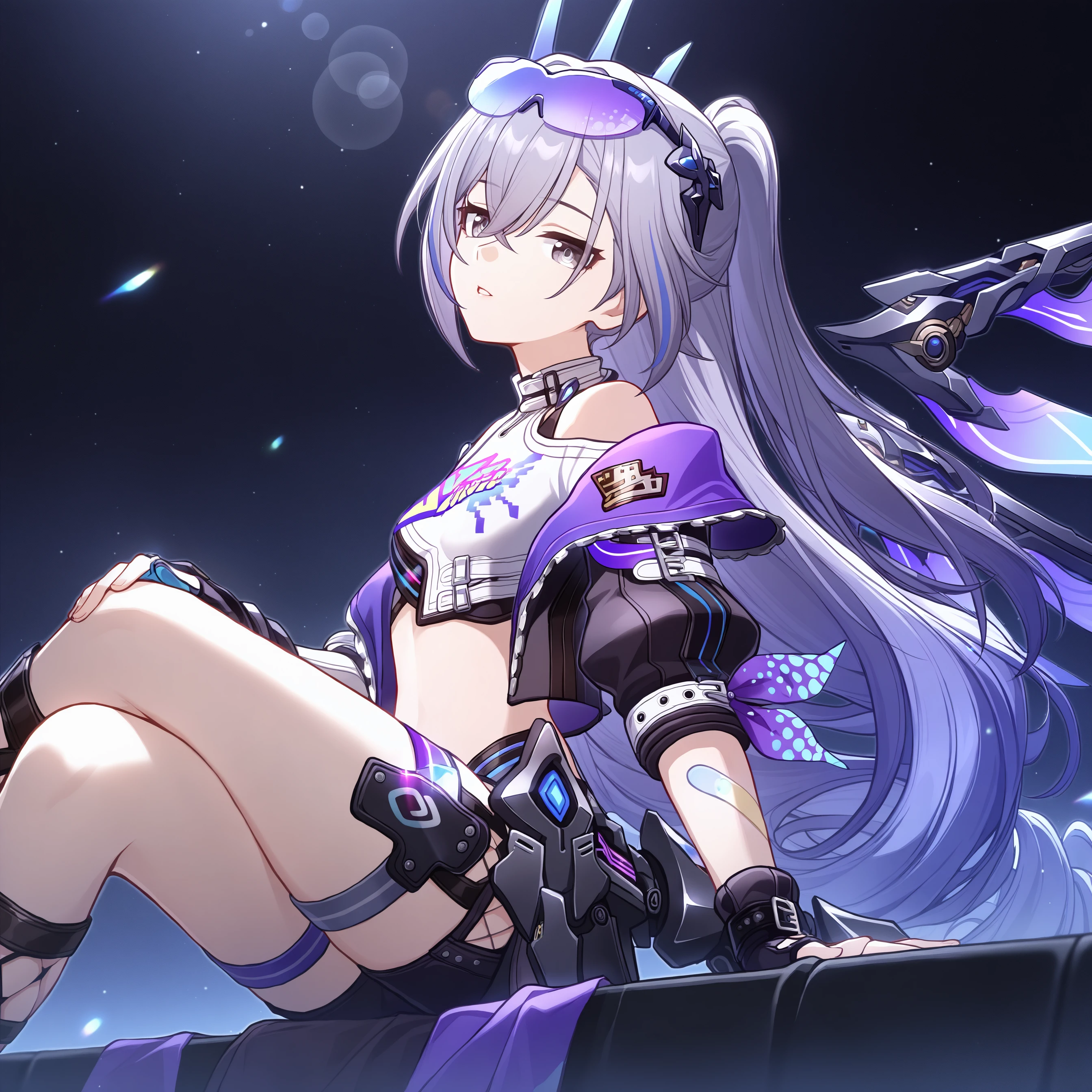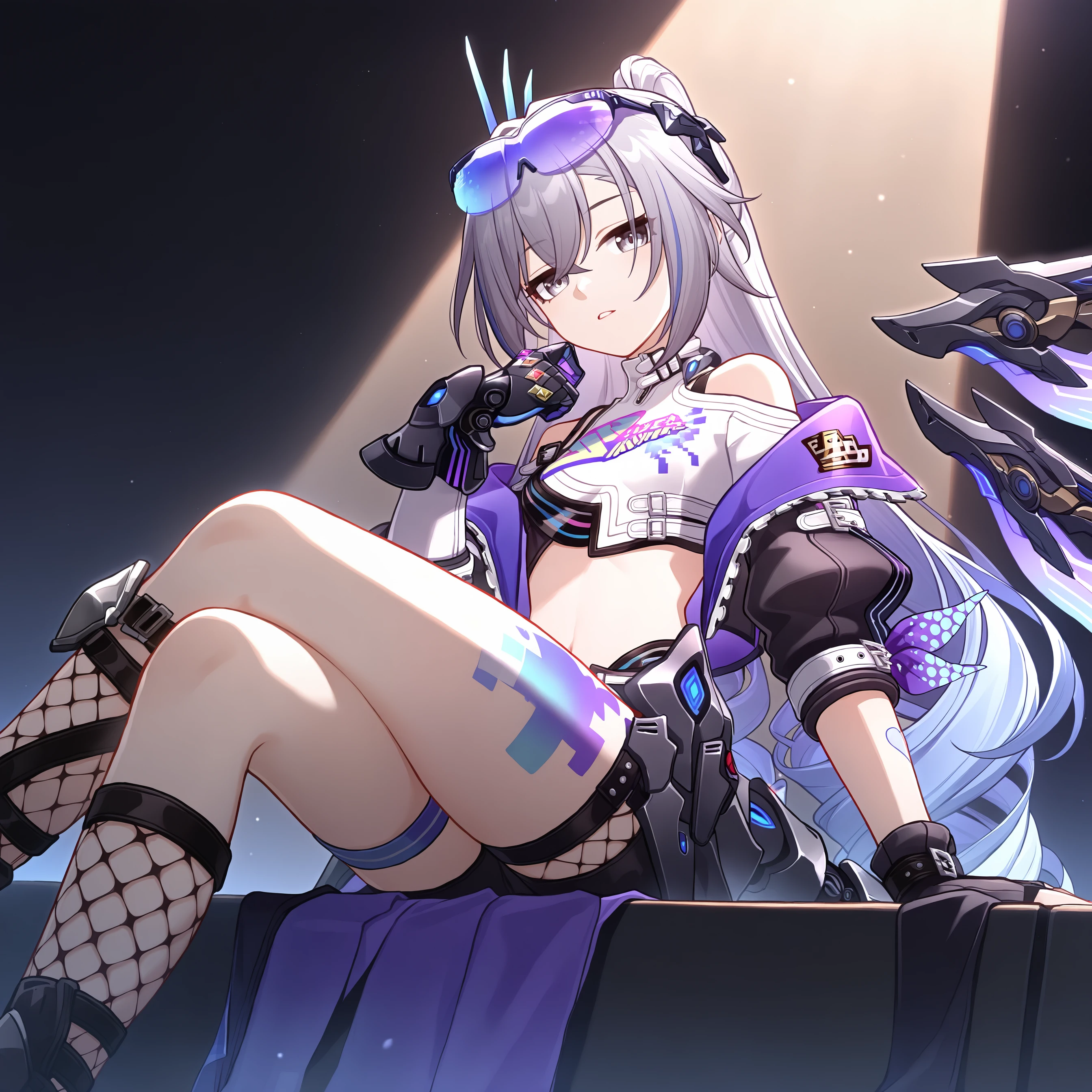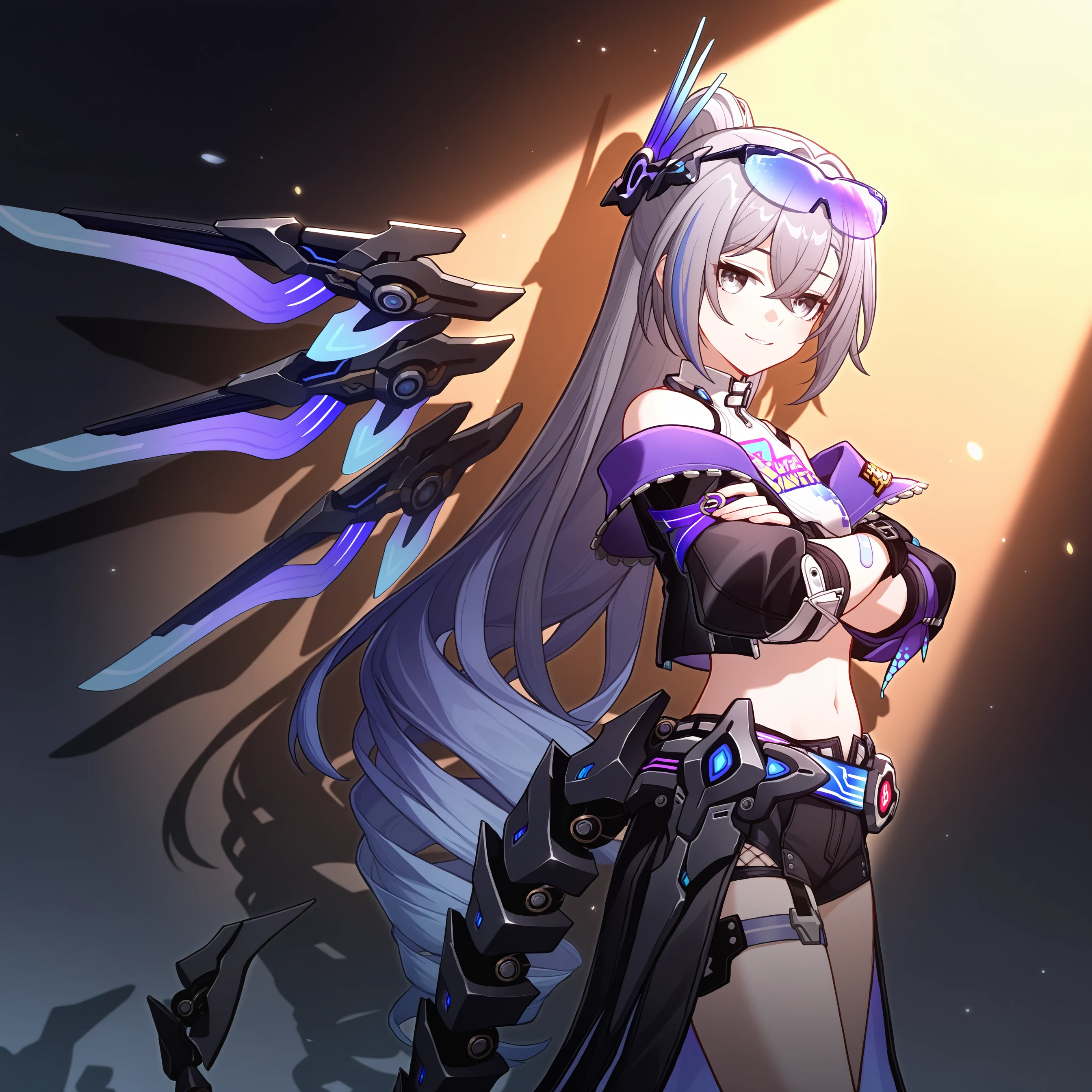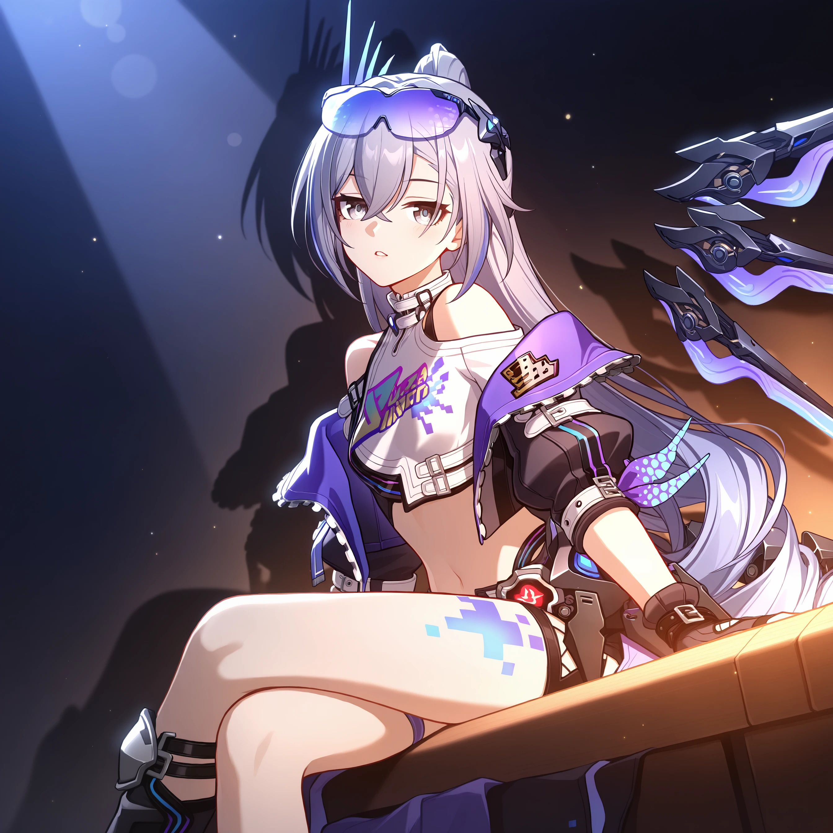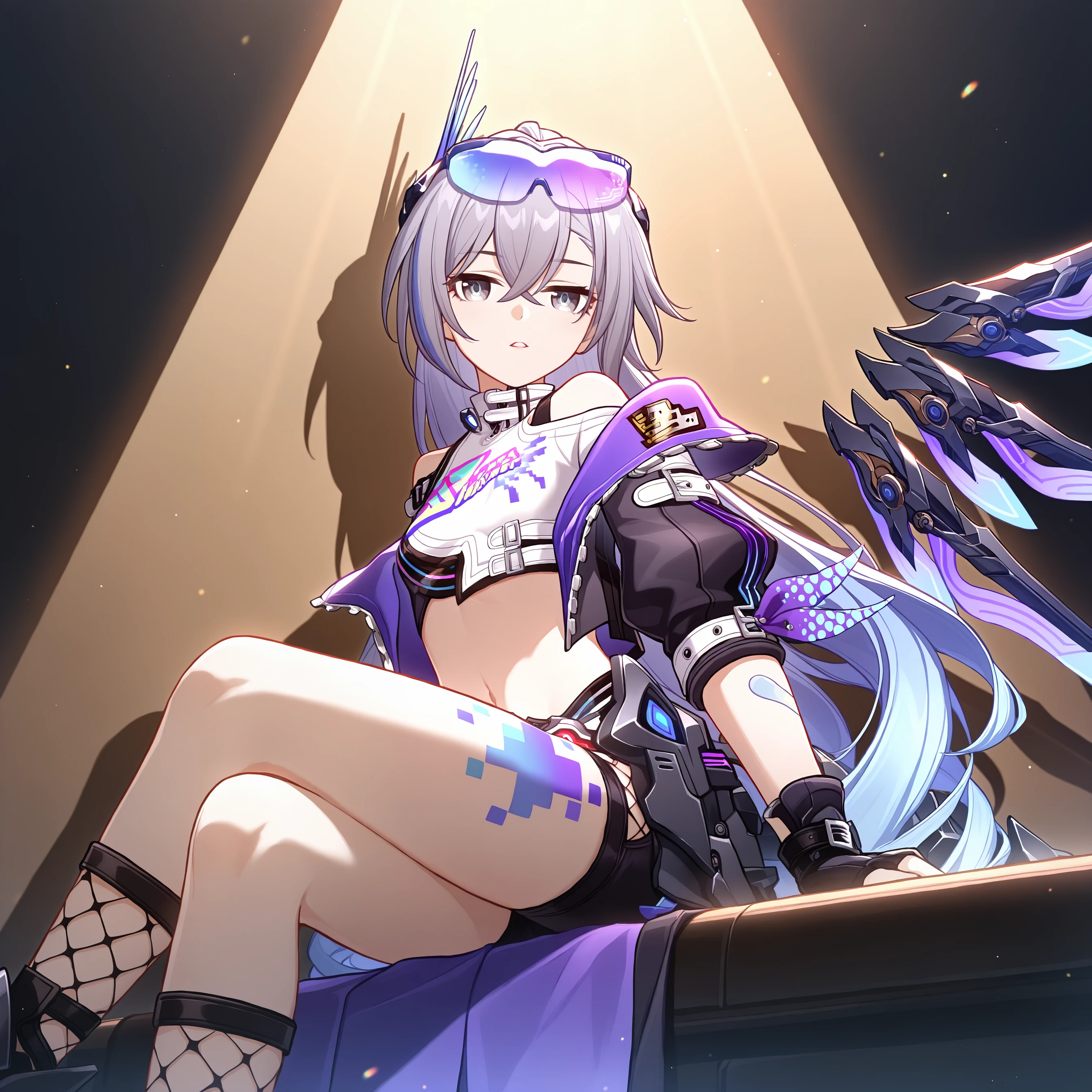 masterpiece, best quality, very aesthetic, newest, hires, Silver Wolf LV.999, 1girl, solo, looking at viewer, jacket, black shorts, crop top, gloves, belt, sitting, sunglasses, mechanical wings, mechanical tail, crossed legs, cute, playful, detailed light, spotlight, shadow, simple background,mechanical wings, mechanical tail are detachable.