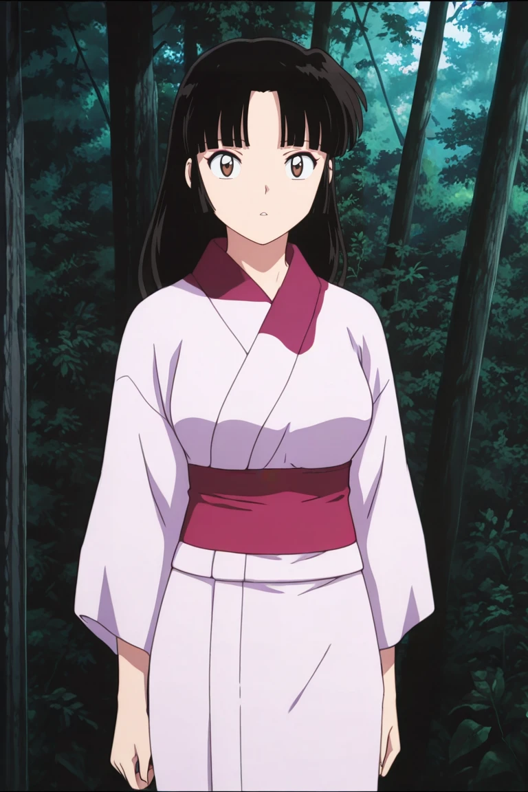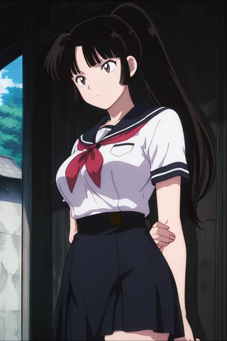 1girl, solo, Sango, long hair, black hair, brown eyes, ponytail, armor, bodysuit, ninja, mask, official_style, anime_coloring