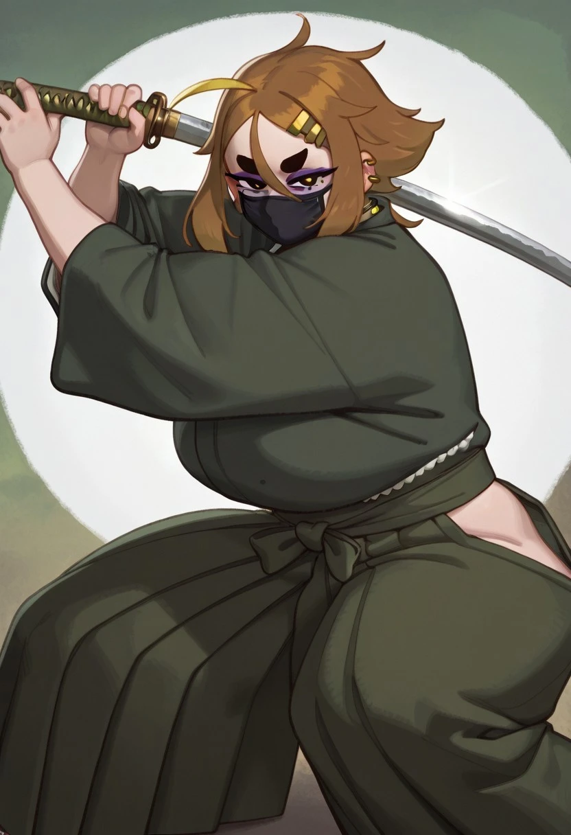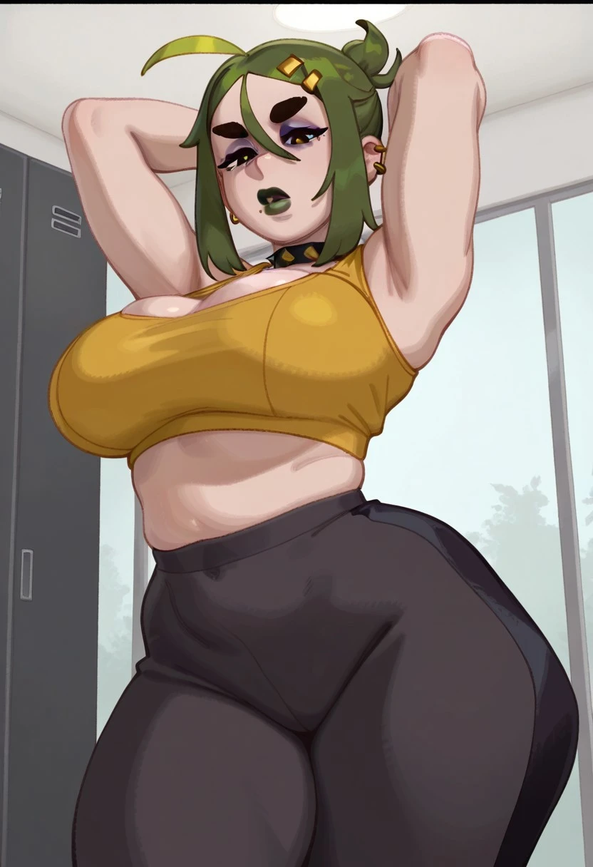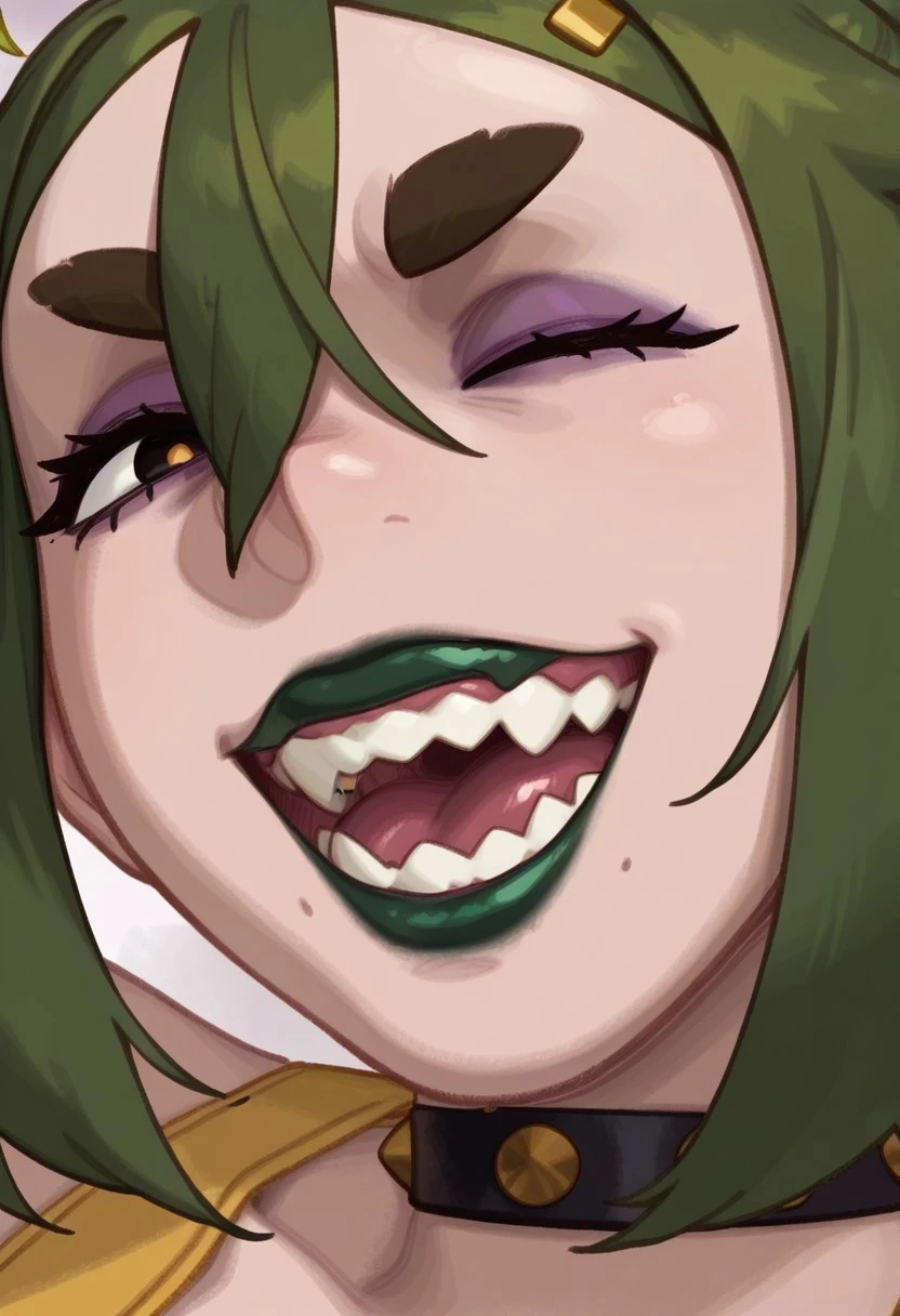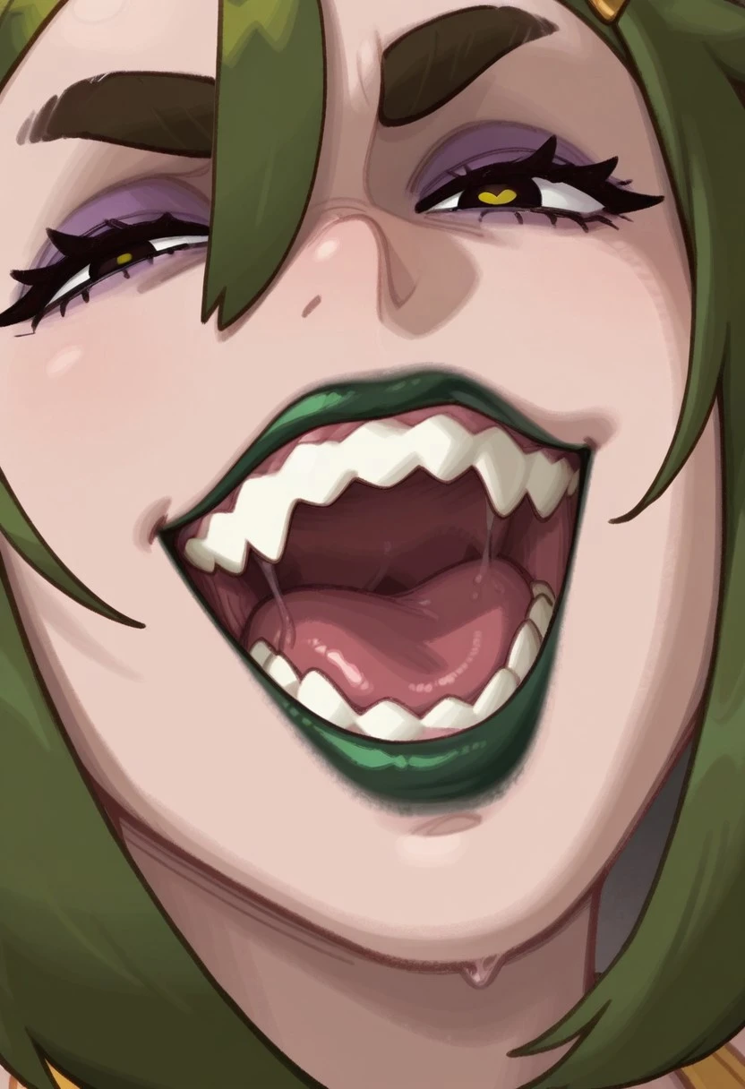 MidoriRiz,dark eyes,yellow pupils,purple eyeshadow,thick eyebrows,short eyebrows,green lips,lipstick