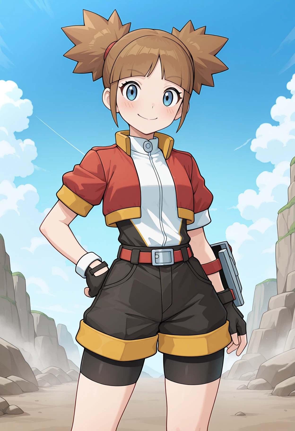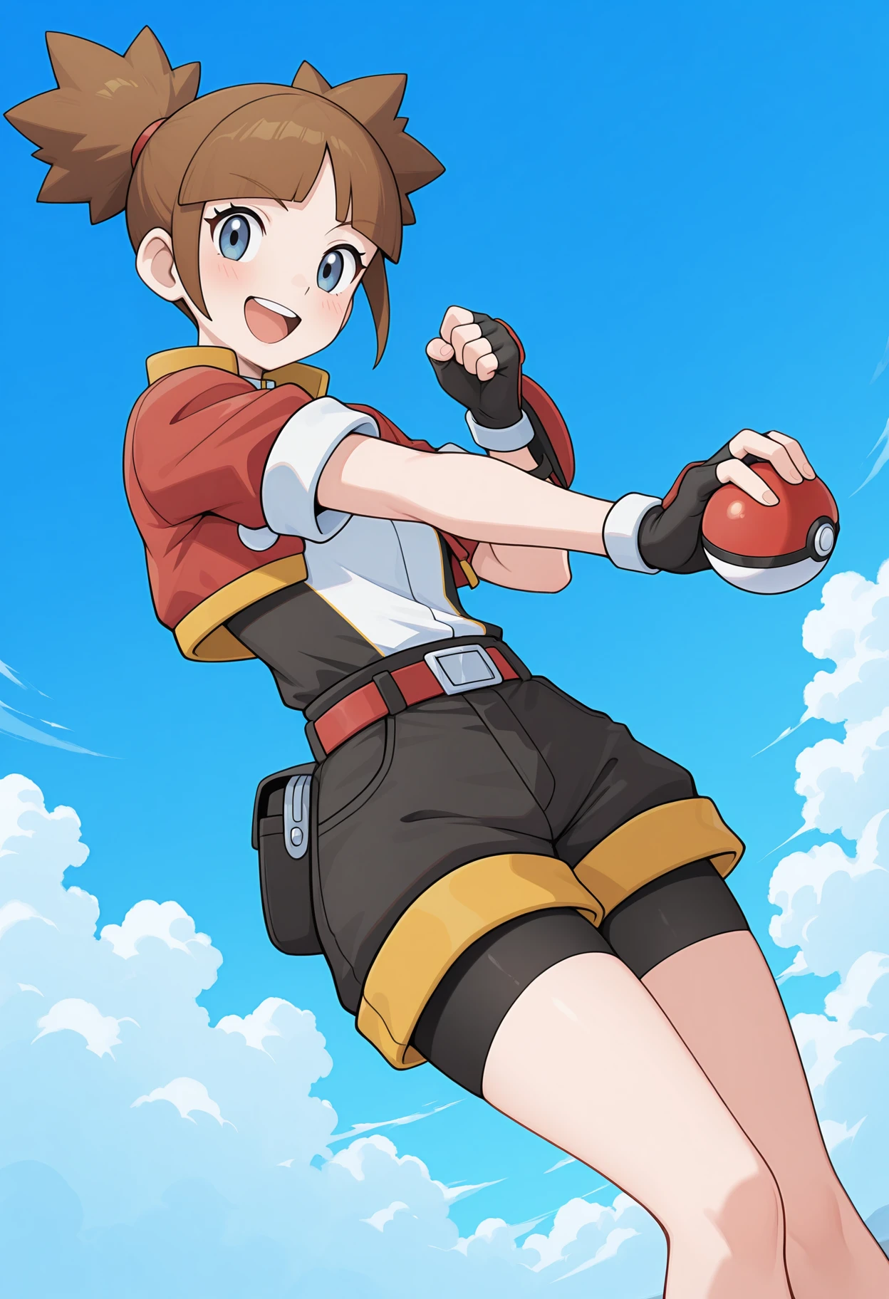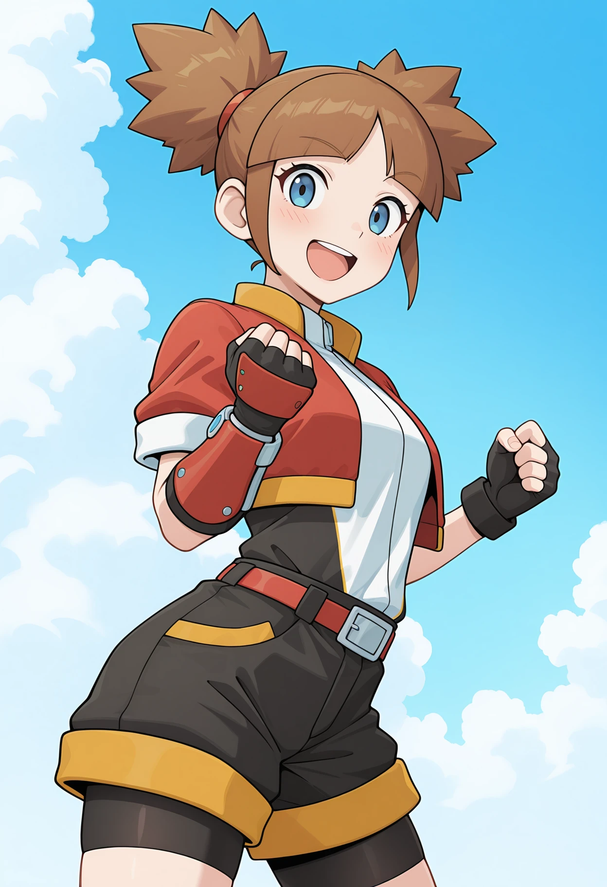 red jacket, cropped jacket, yellow trim, short sleeves, two-tone shirt, black shirt, white shirt, belt, buckle, shorts under shorts, black shorts, bike shorts, black gloves, fingerless gloves, single vambrace, yellow socks, sneakers,