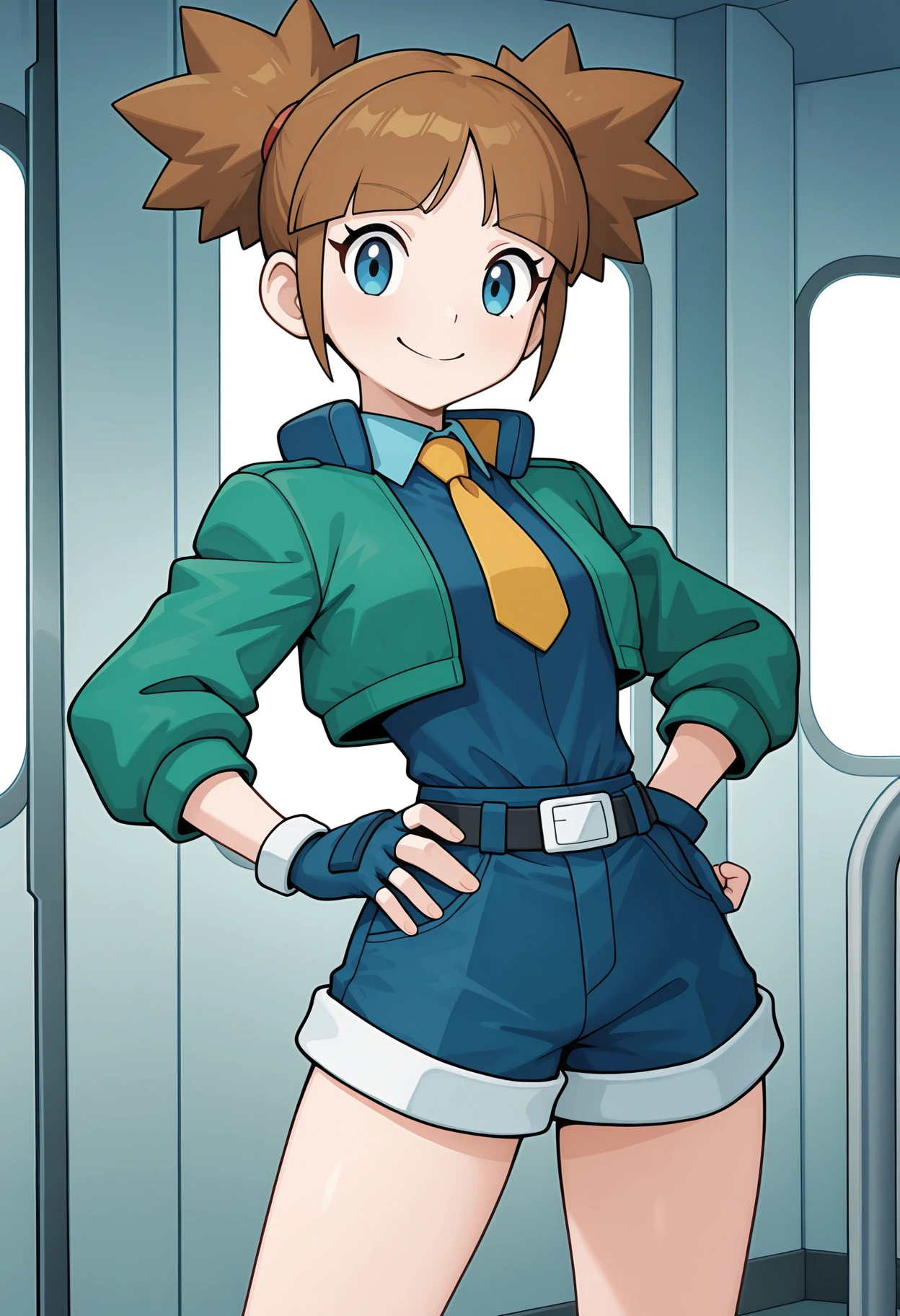 green jacket, cropped jacket, blue shirt, collared shirt, yellow necktie, blue shorts, fingerless gloves, blue gloves, boots,