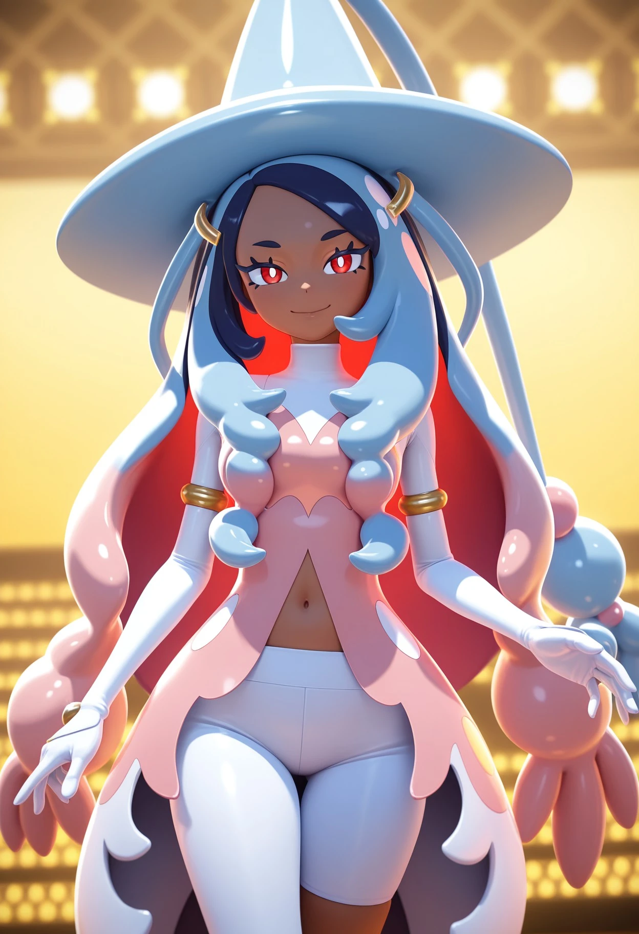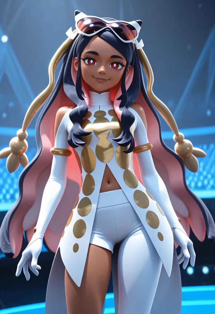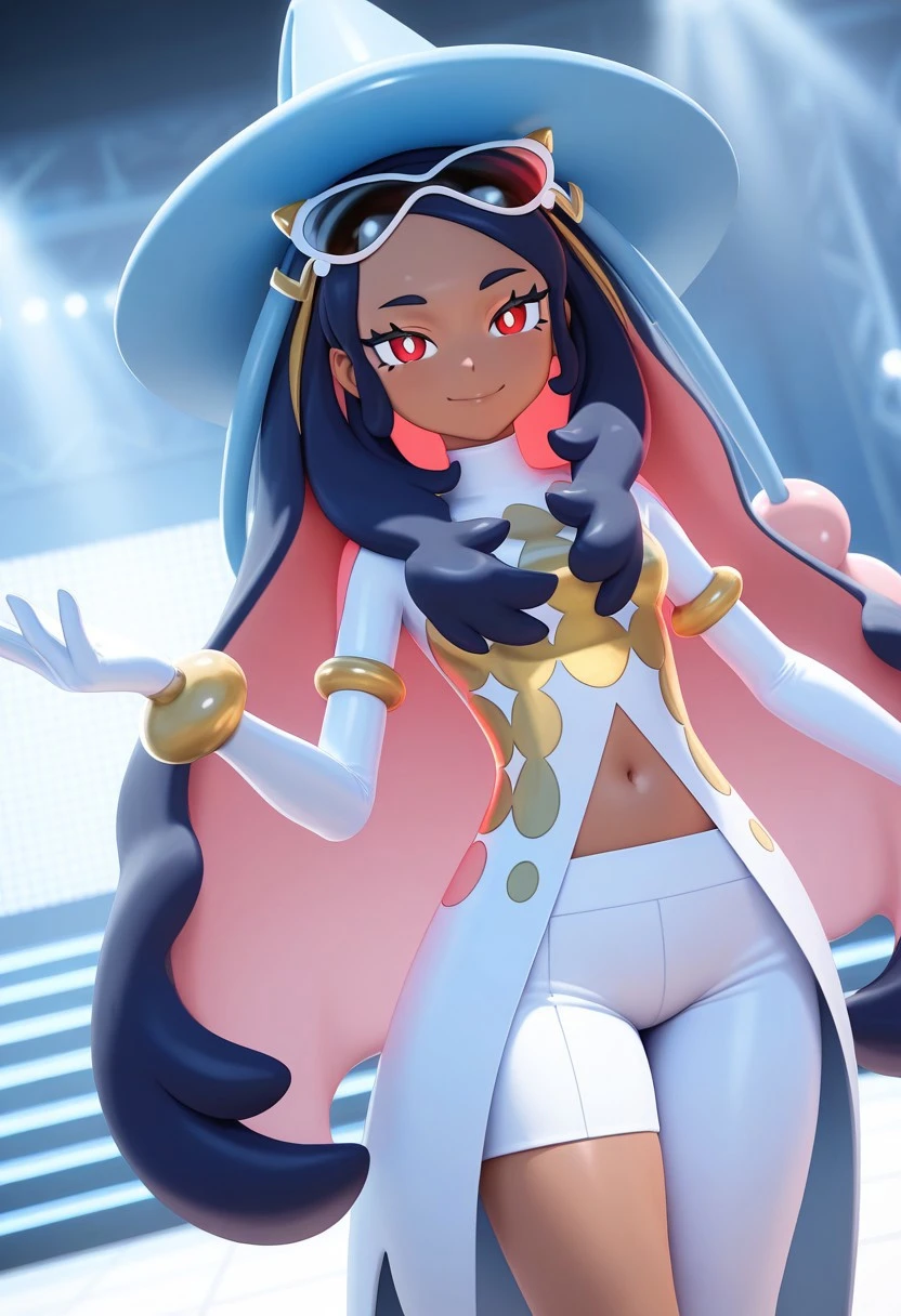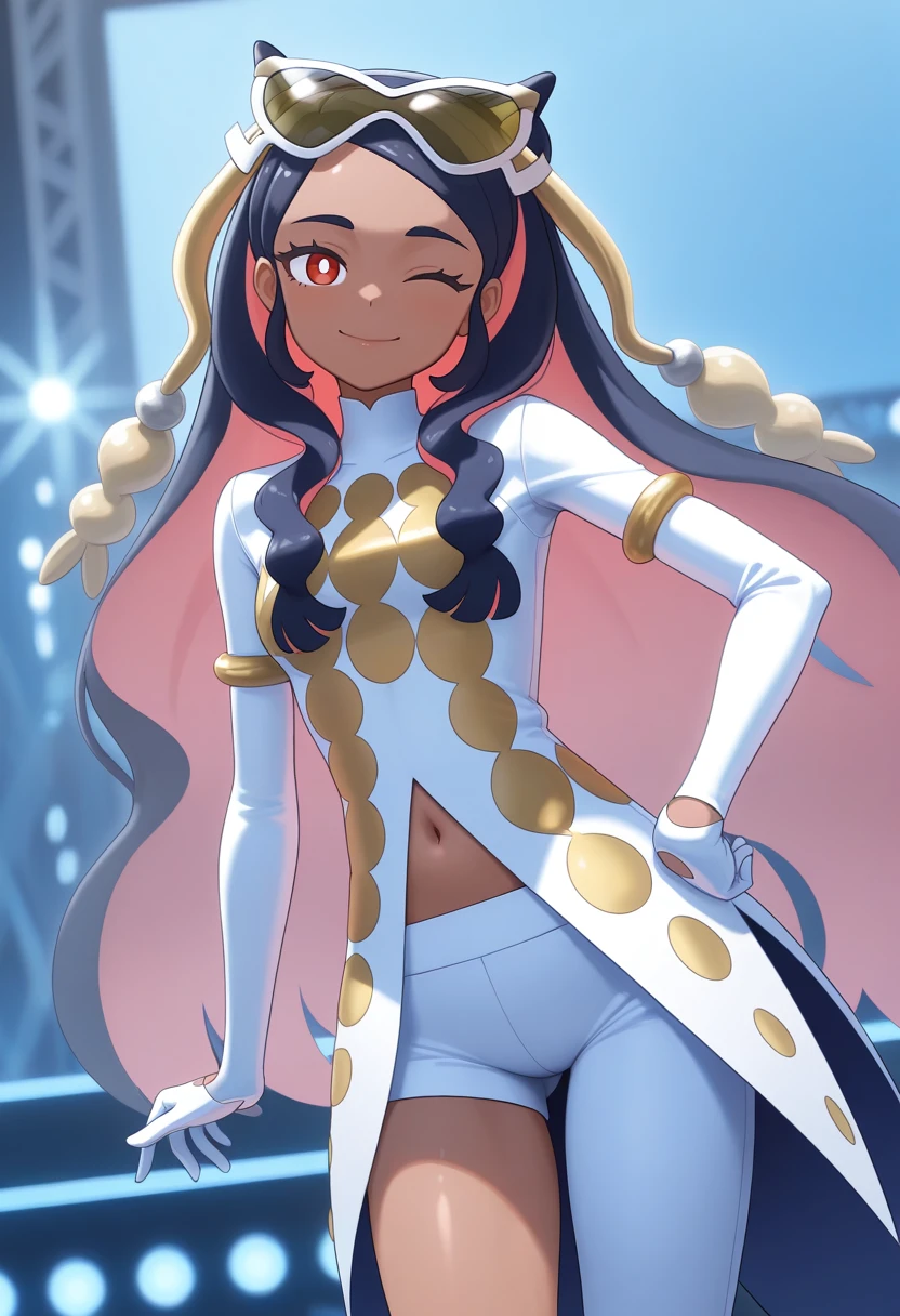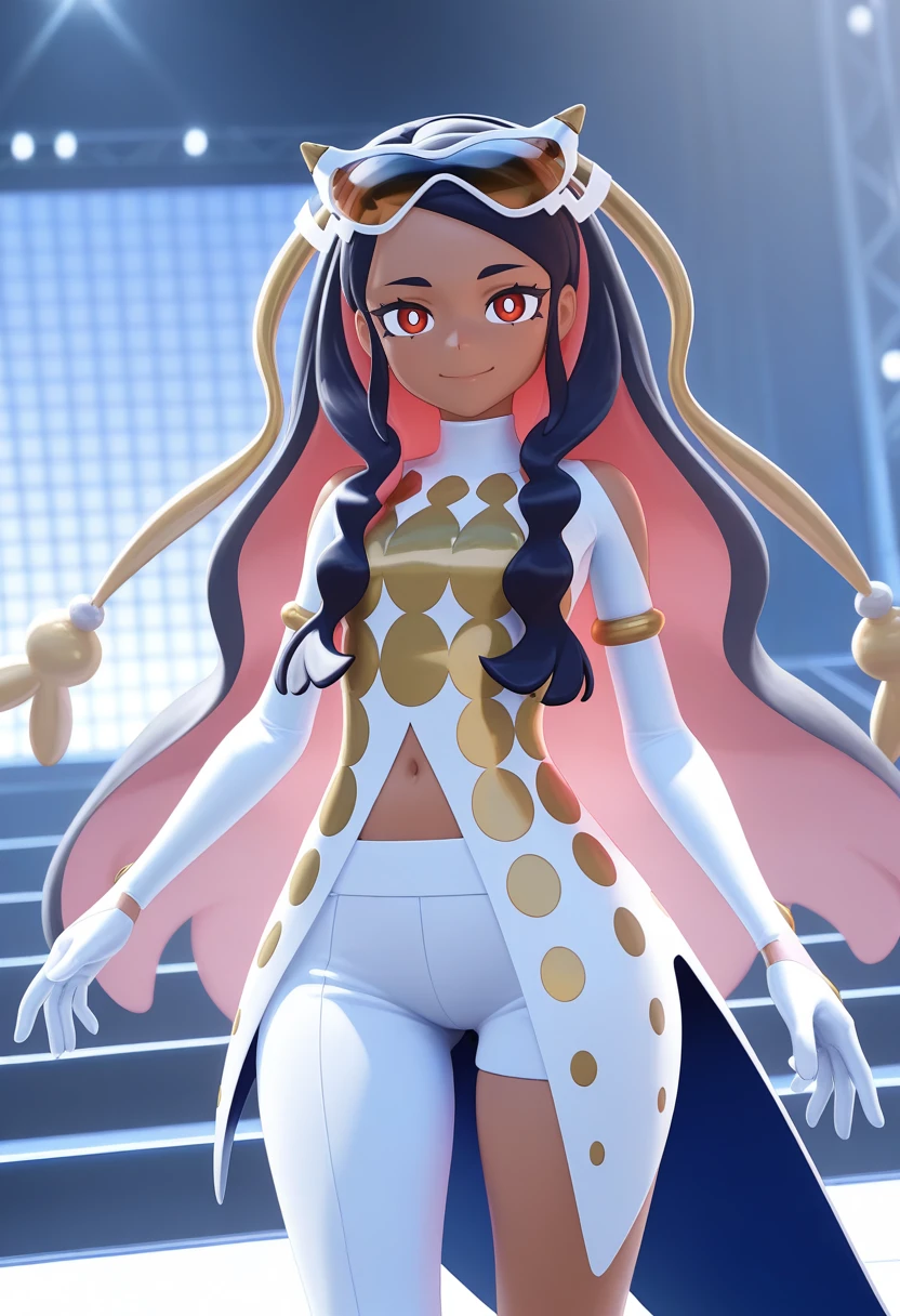 arawaypc, 1girl, solo, clothing cutout, coattails, colored inner hair, dark-skinned female, eyewear on head, gloves, long hair, multicolored hair, navel cutout, red eyes, single pantsleg, tailcoat, tinted eyewear, two-tone hair, white pants, white pupils, hair ornament, long sleeves, gold armlet,