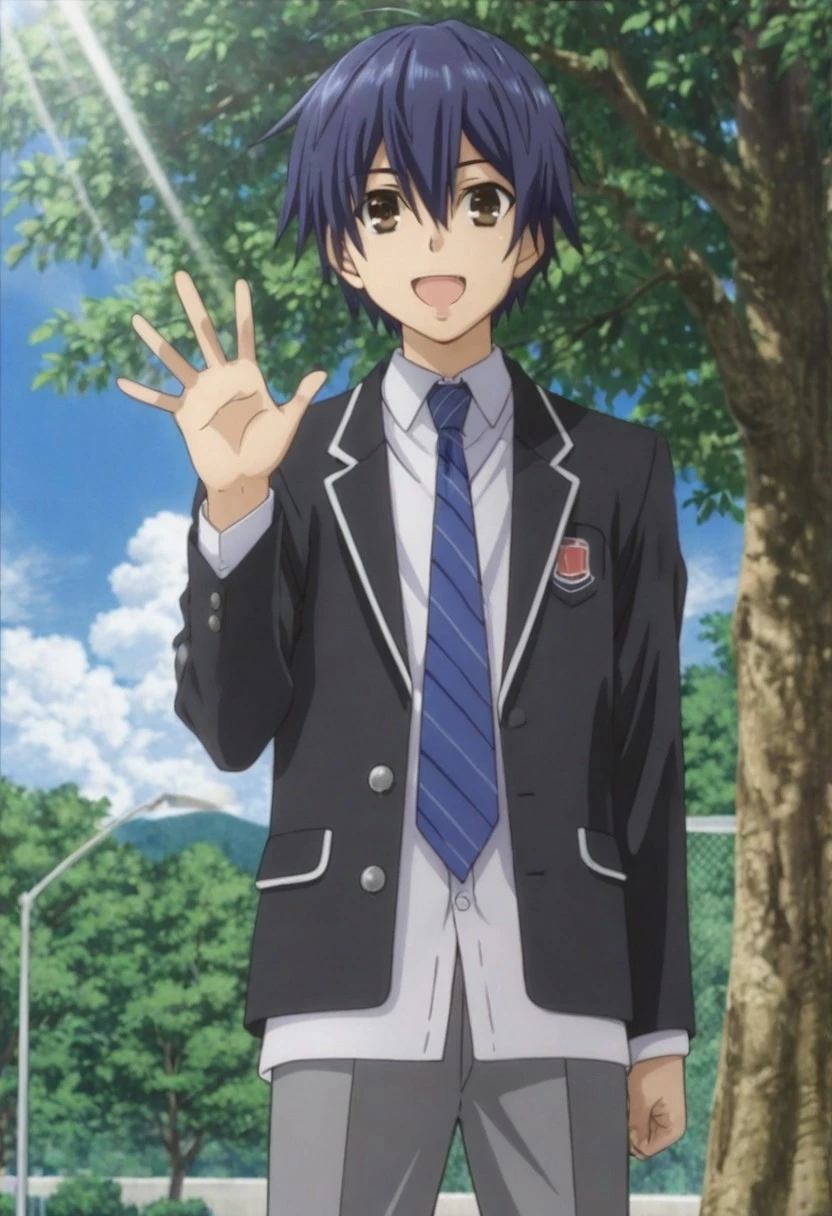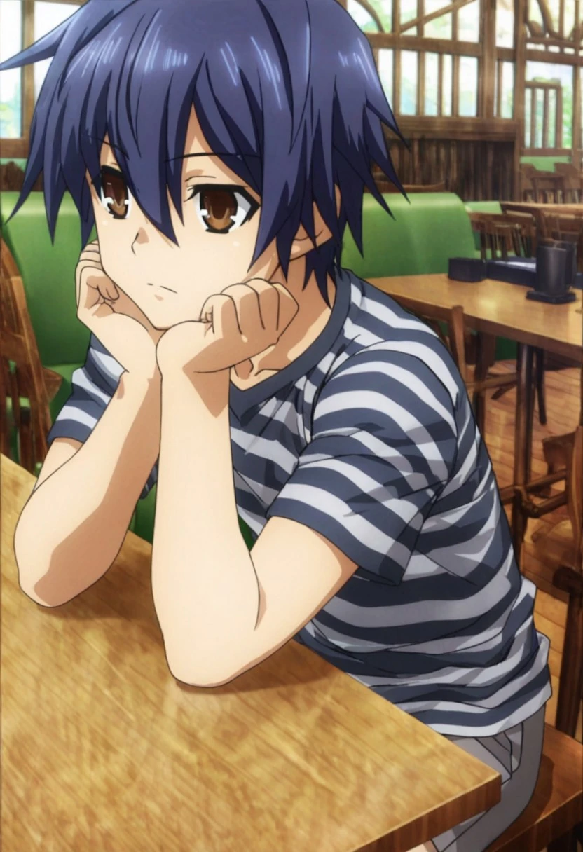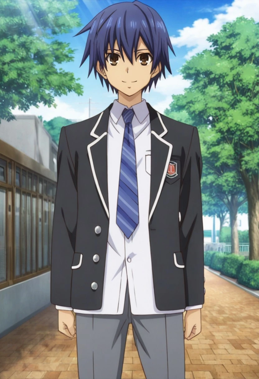 Shido Itsuka, dark blue hair, brown eyes, black open blazer, white accents, white collared undershirt, blue striped necktie, gray pants