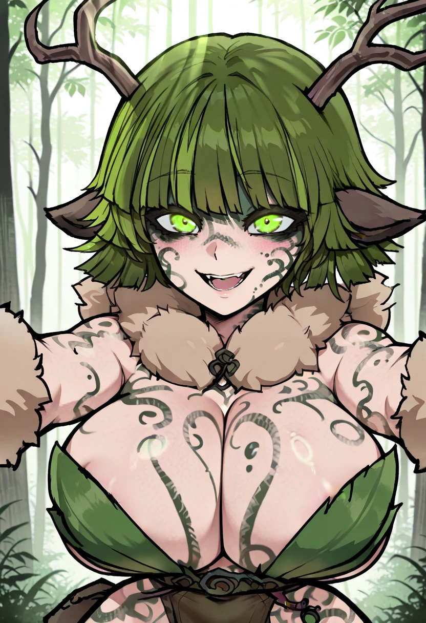 pladocdruid, green bodypaint, green facepaint, green hair, light green streaks, streaked hair, blunt bangs, breasts, green eyes, animal ears, large breasts, satyr,
