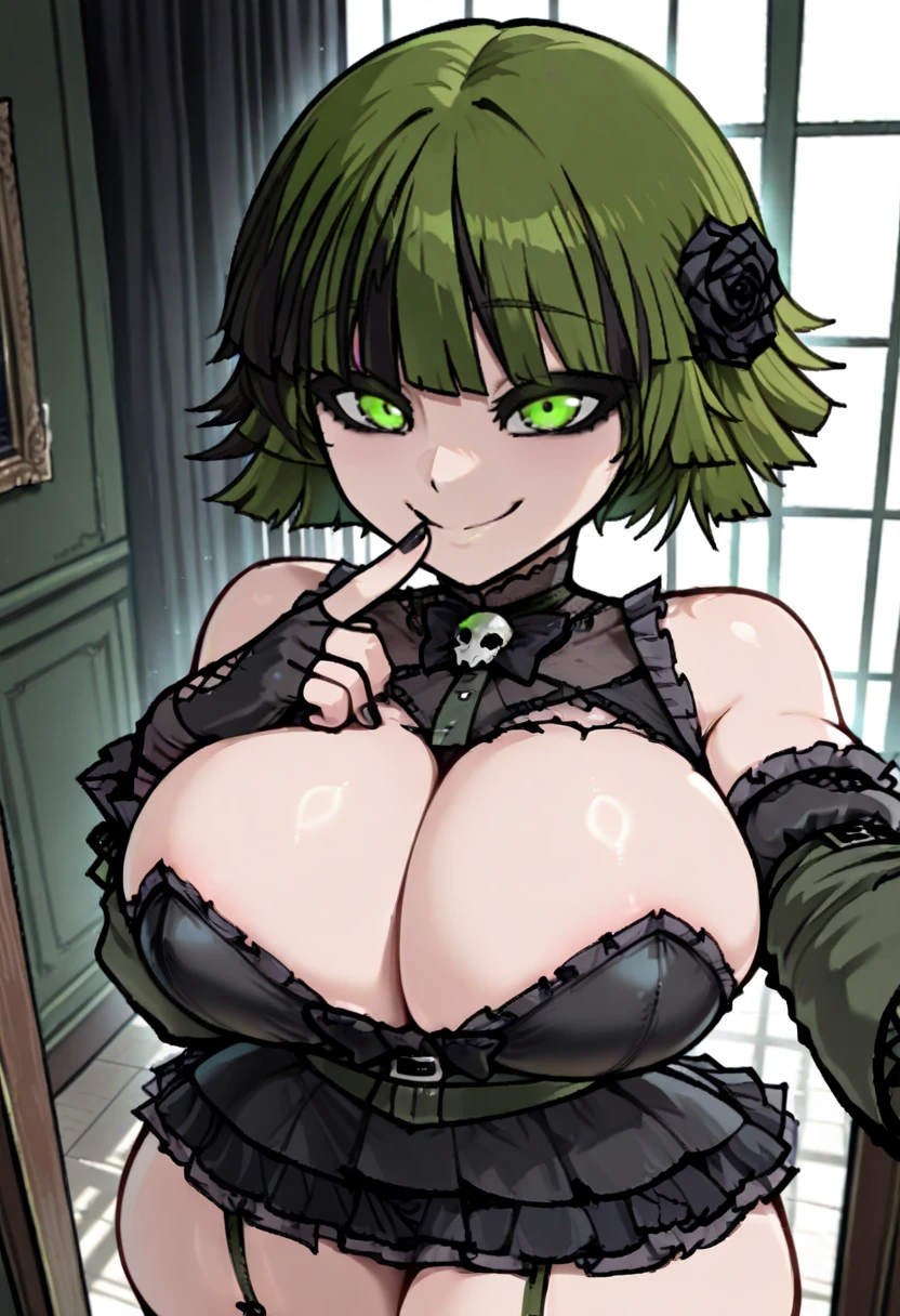 pladocgoth, black streaks, green eyes, green hair, large breasts, blunt bangs,streaked hair,