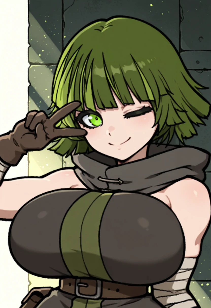 pladoc, green hair, light green streaks, streaked hair, green hair, blunt bangs, breasts, green eyes, green hair,large breasts