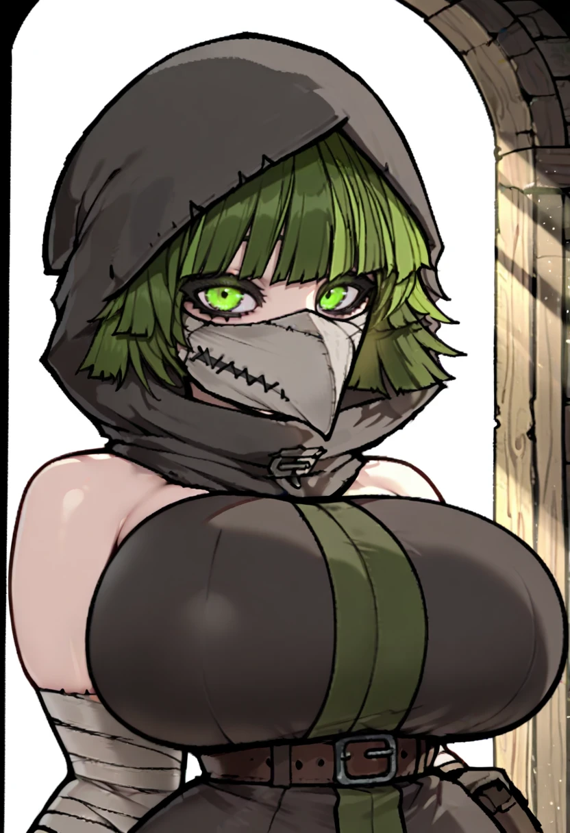 gloves, cloak, green trim,grey cloak, mask, hood up, bandaged arms, belt, gloves, bandaged legs, green panties, high heels, boots,