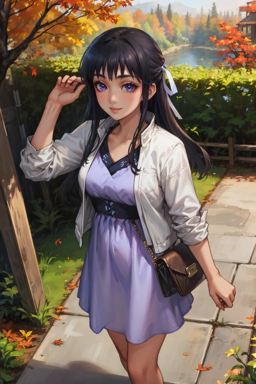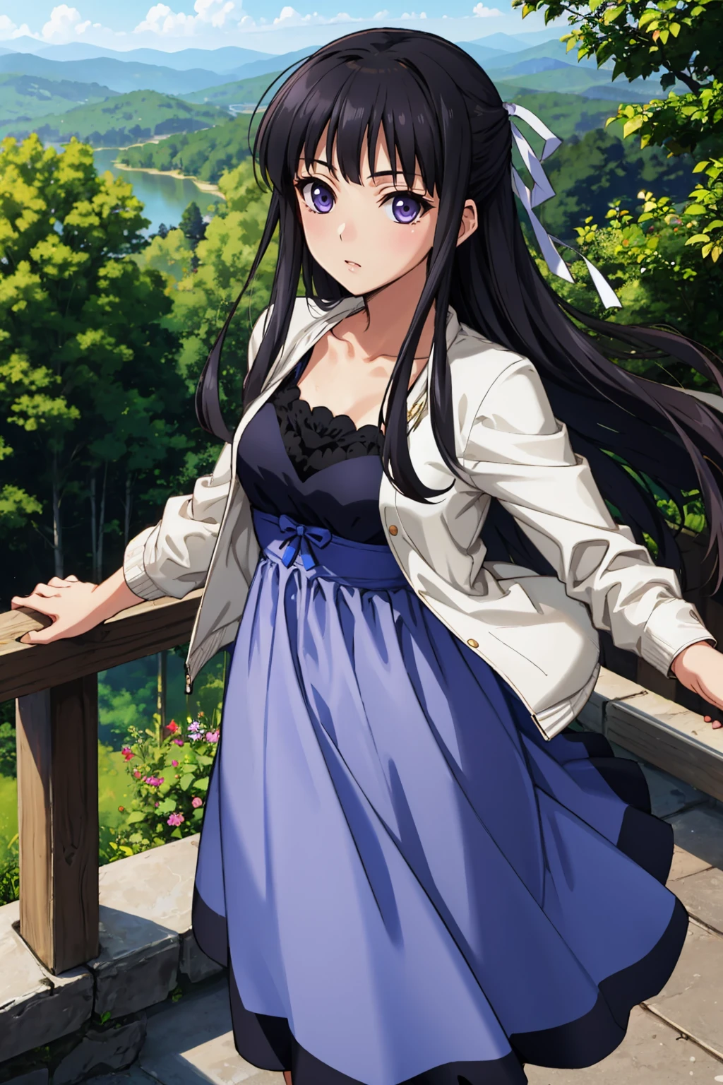 Add "hair ribbon, purple dress, white jacket" for her purple dress.