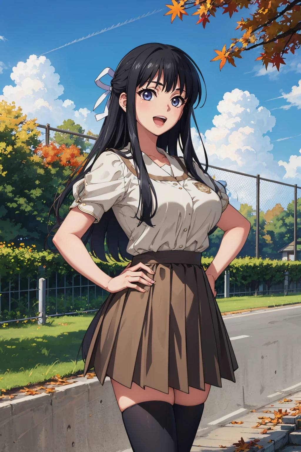 Add "hair ribbon, white shirt, short sleeves, plaid skirt, black thighhighs" for her school uniform.