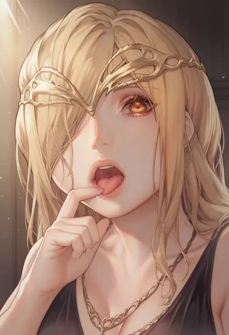AoinMarika, 1girl, long hair, blonde hair, hair over one eye, yellow eyes, circlet, large breasts,