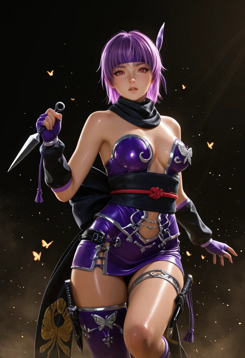 Use ngb2_aya, 1girl, ayane_(doa), purple hair, red eyes, short hair, headband, for her base features.
