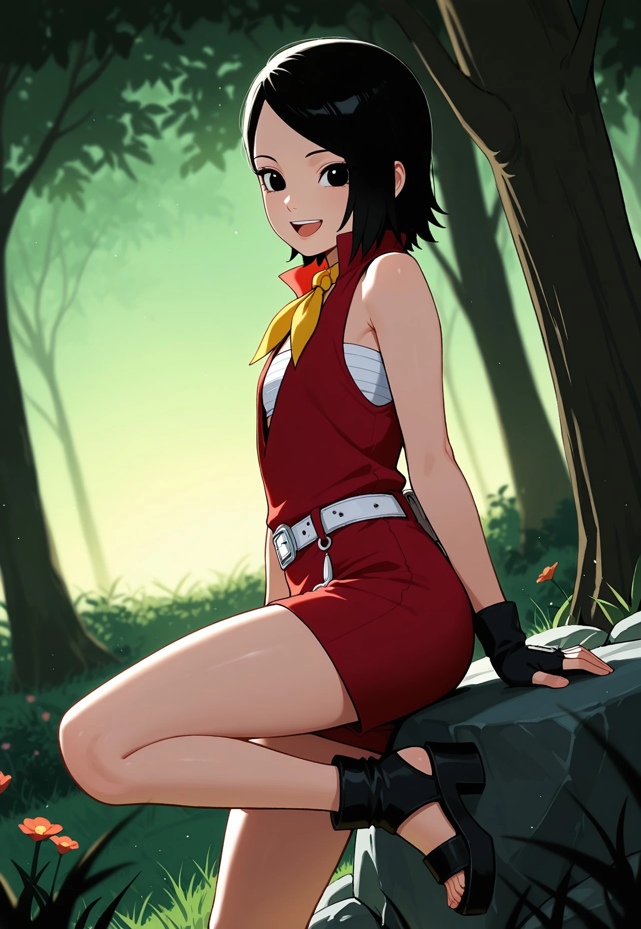 usbrou,red dress,sleeveless,sarashi,black fingerless gloves,yellow neckerchief,white belt,block heels,toeless footwear,