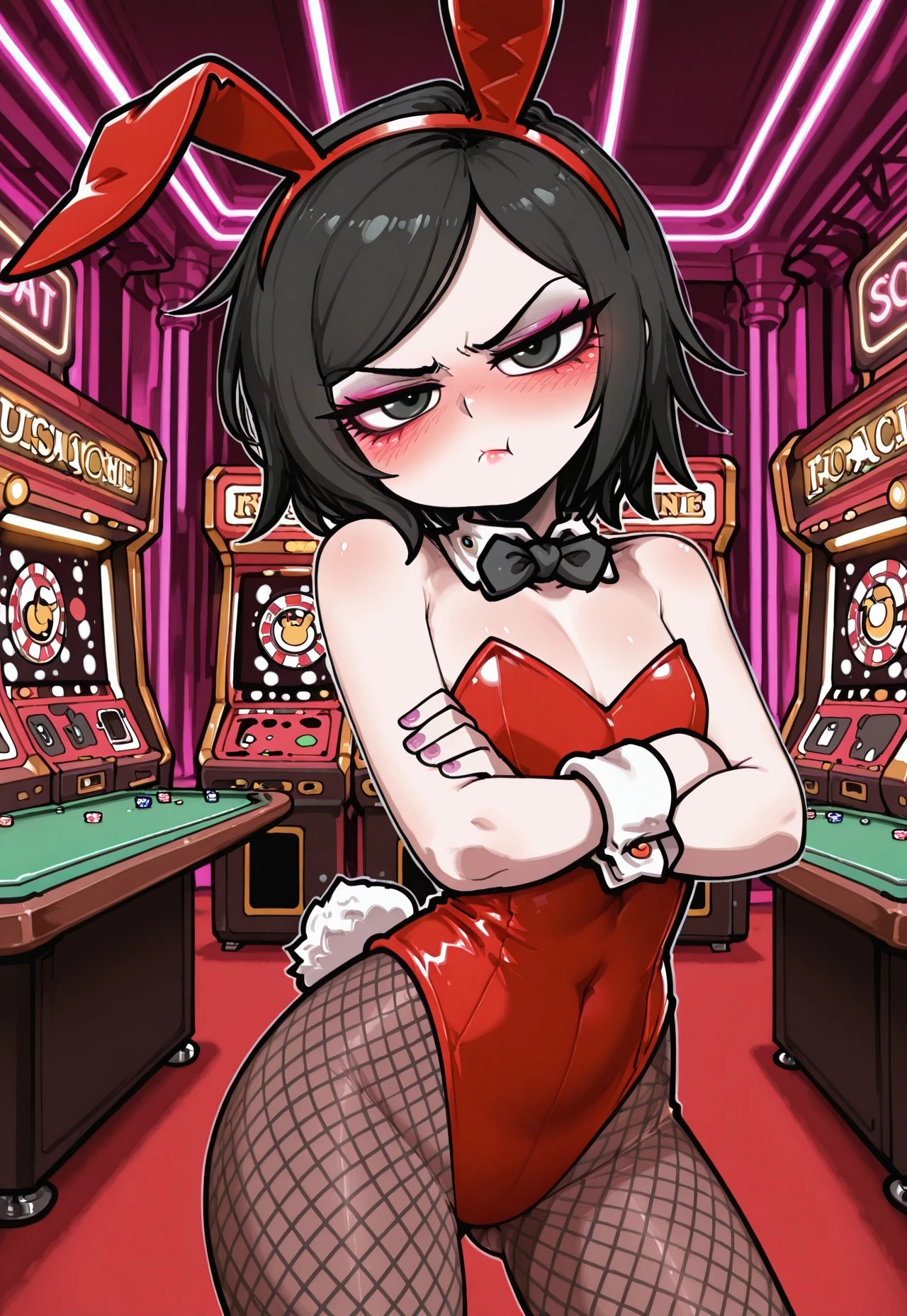 usbtbv,black jacket,two-tone jacket,open jacket,bare shoulder,black strapless shirt,black choker,black shorts,red belt,thigh holster,black loose socks,black block heels,sandals,Recommended settings: