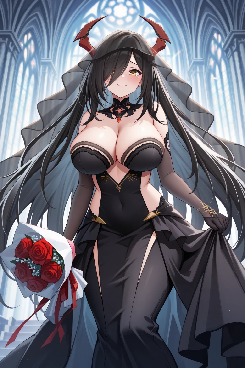Appearance : gr0ss3, large breasts, red mechanical horns, yellow eyes, black hair, hair over one eye, long hair