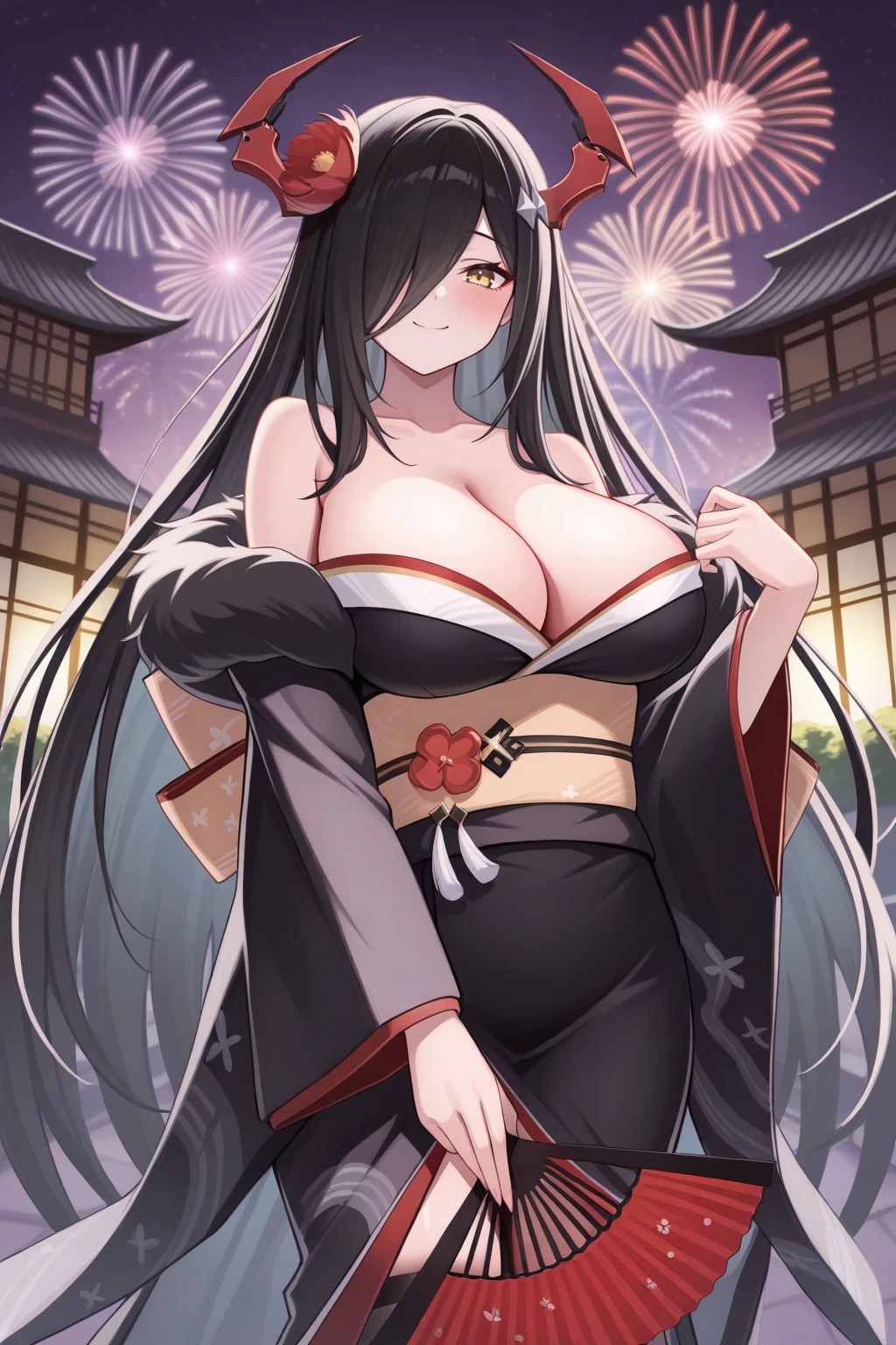 Outfit 2 : hair flower, hair ornament, black kimono, fur-trimmed kimono, off shoulder, black thighhighs