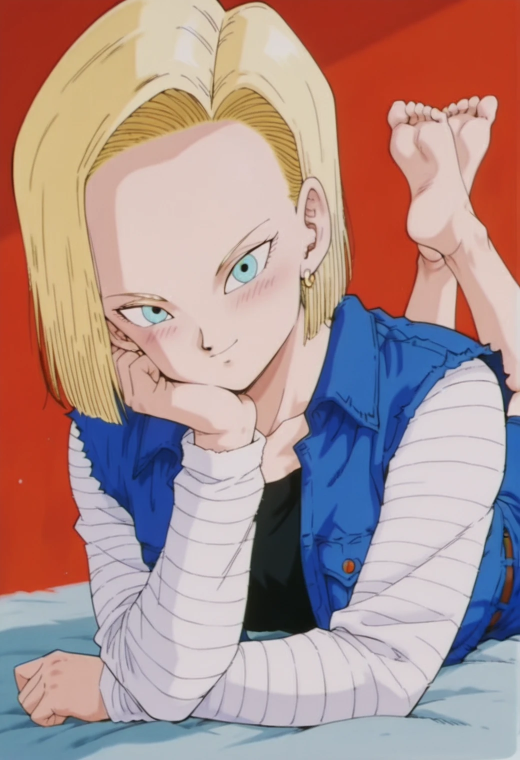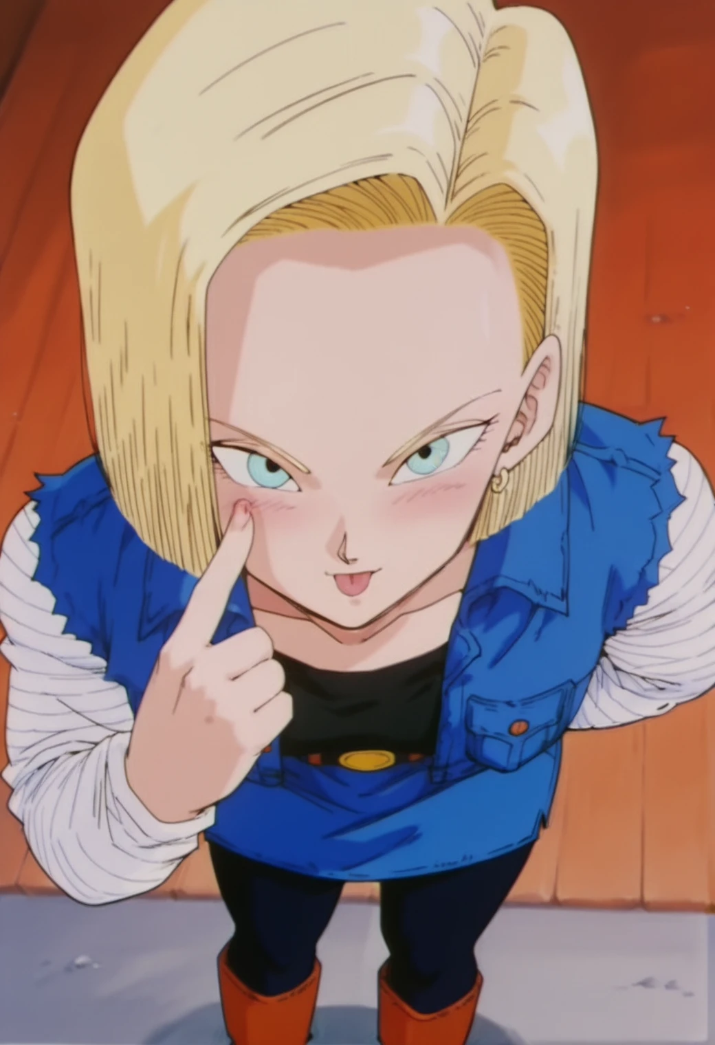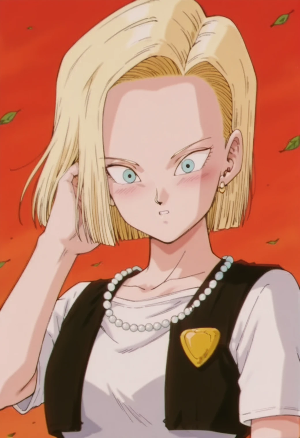android 18, blue eyes, blonde hair, short hair, hair behind ear,