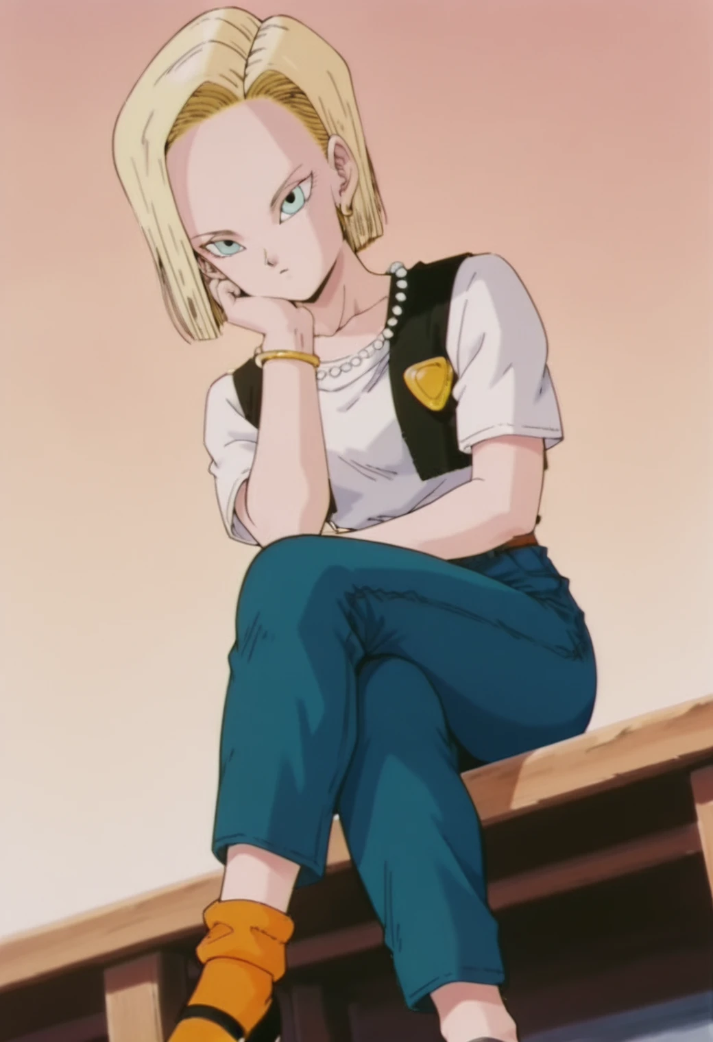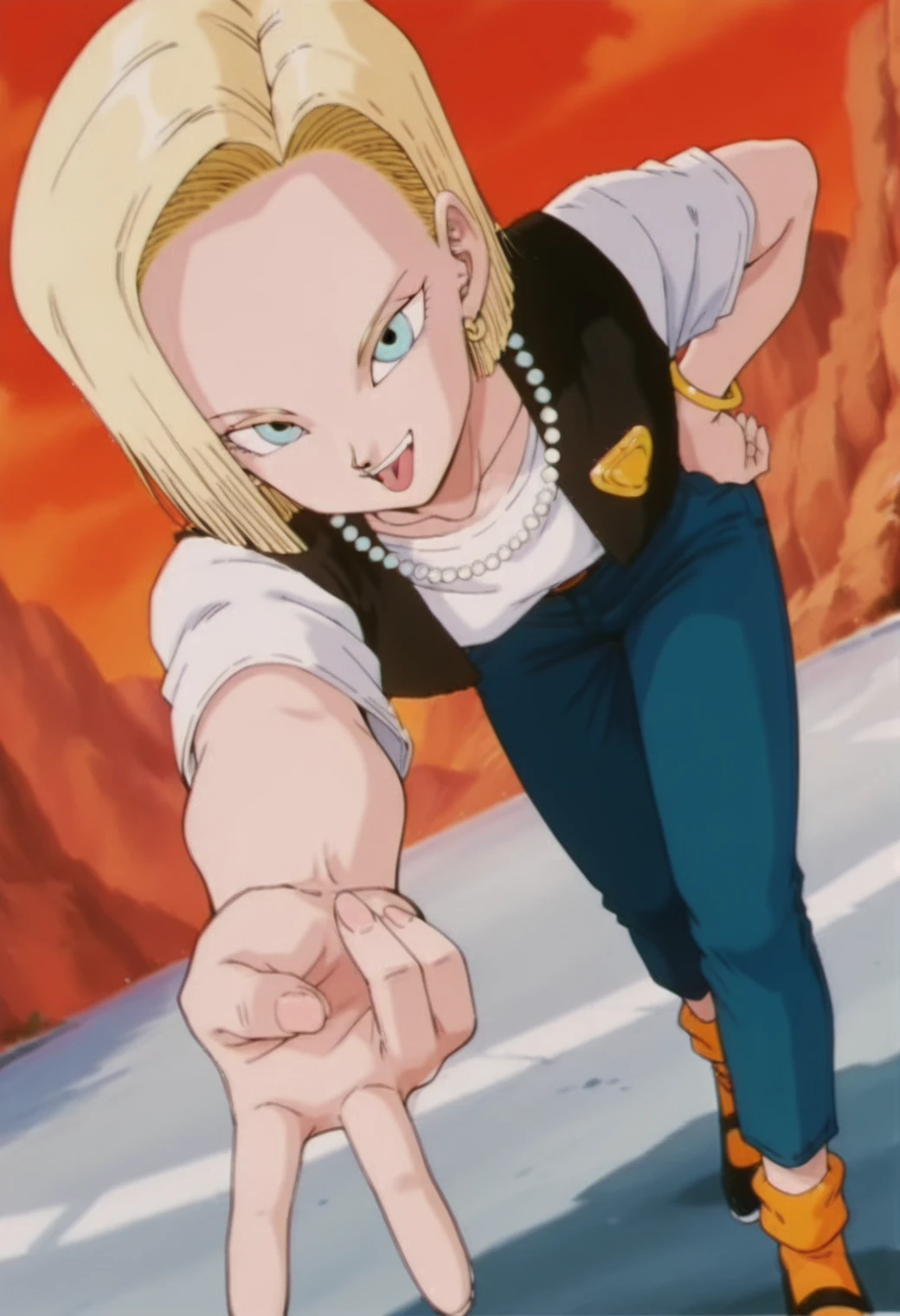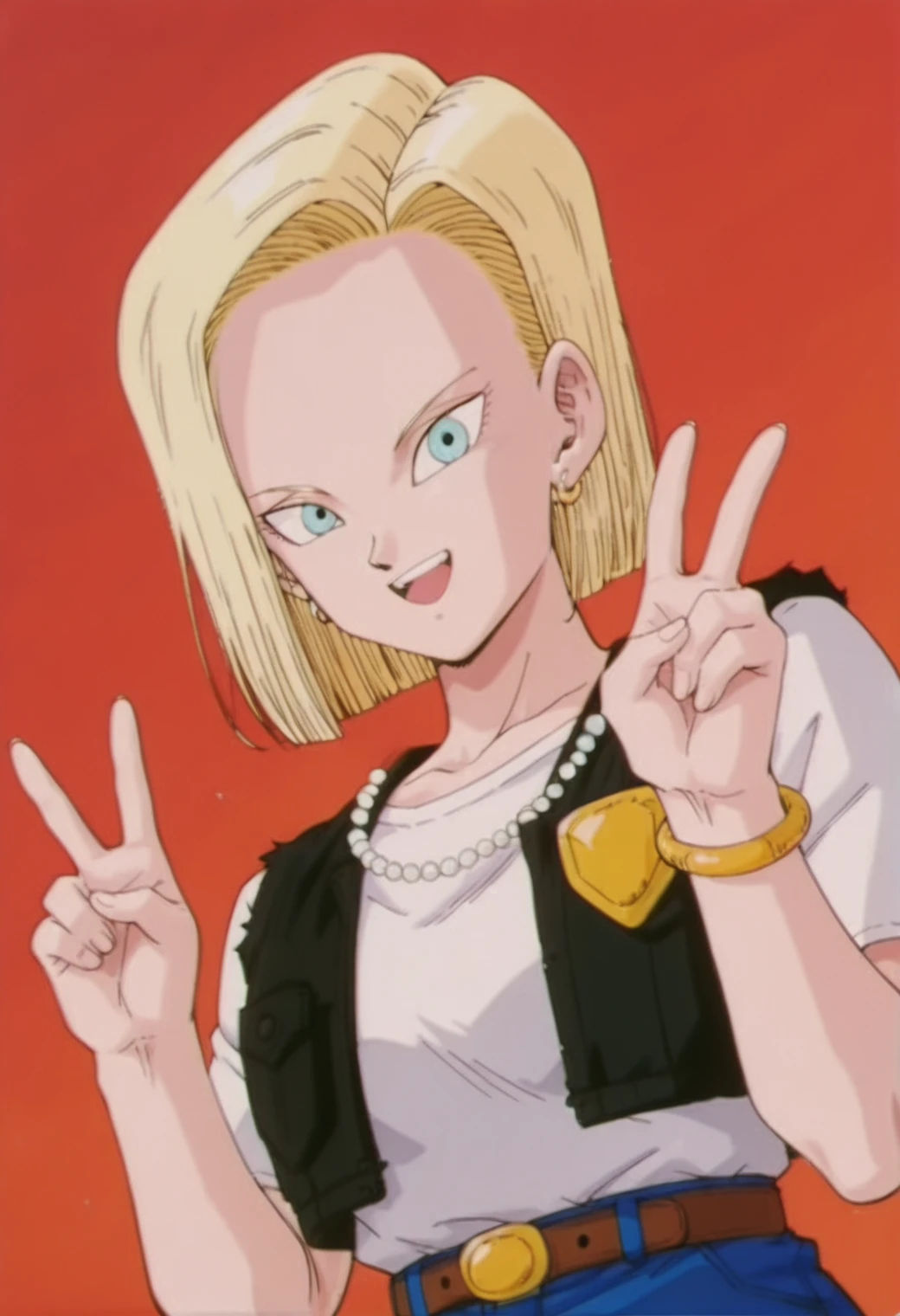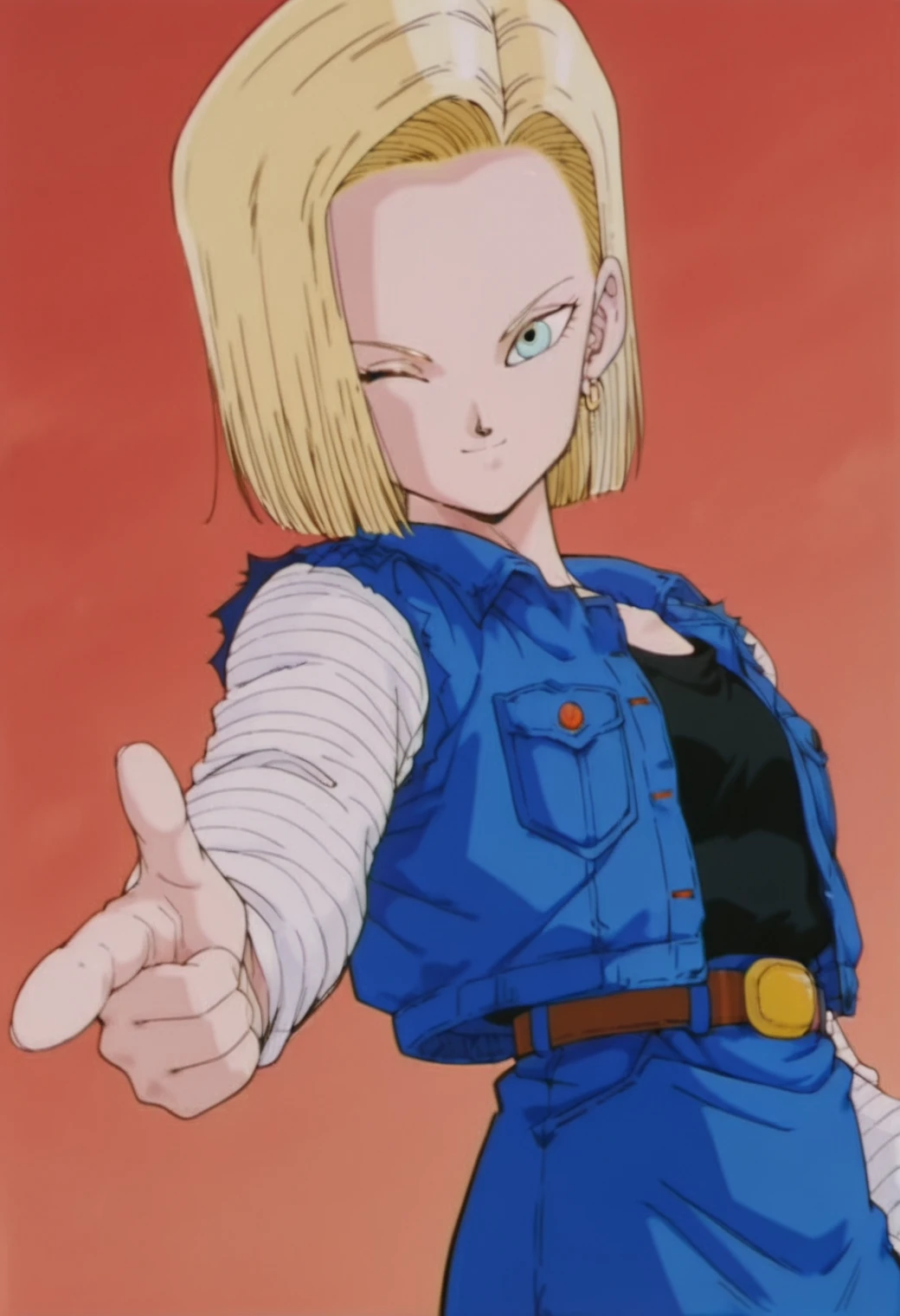 android 18, blue eyes, blonde hair, short hair, hair behind ear,