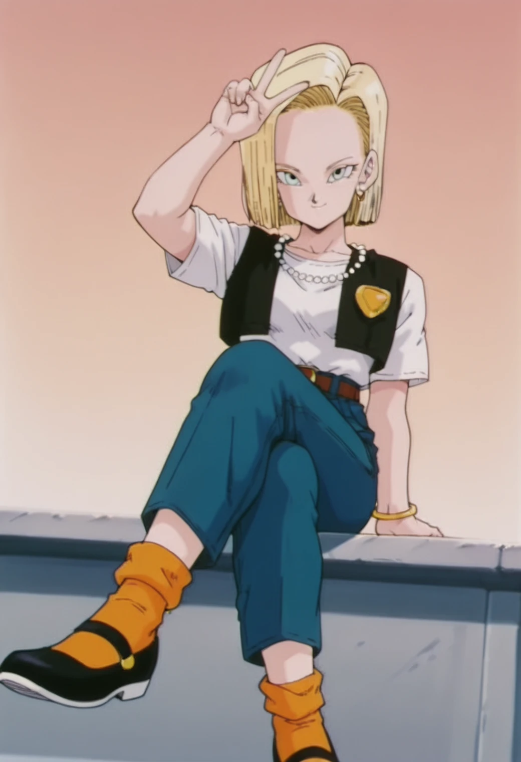 hoop earrings, pearl necklace, black vest,open vest, white shirt, brooch, gold bracelet, black goves, jeans, orange socks, mary janes,