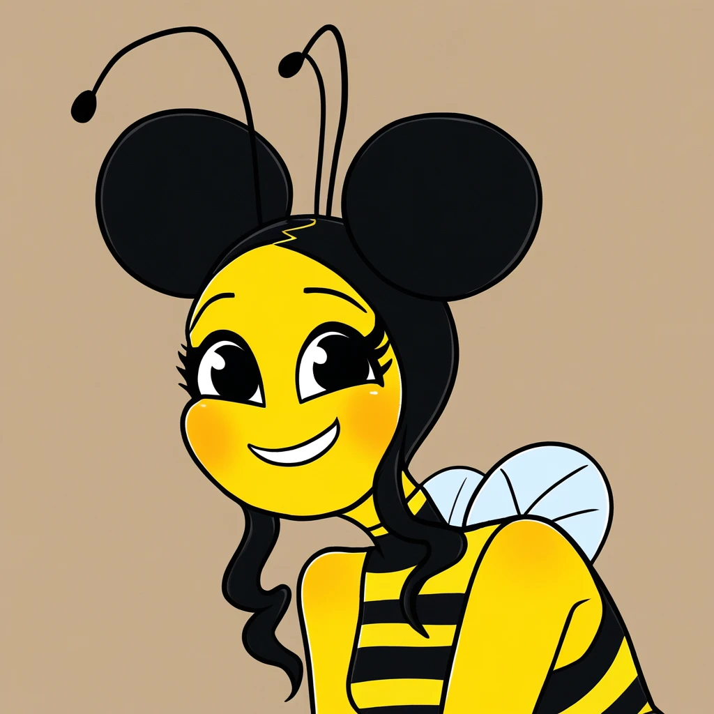bee girl, yellow skin, black hair, hairbun, double bun, antennae,