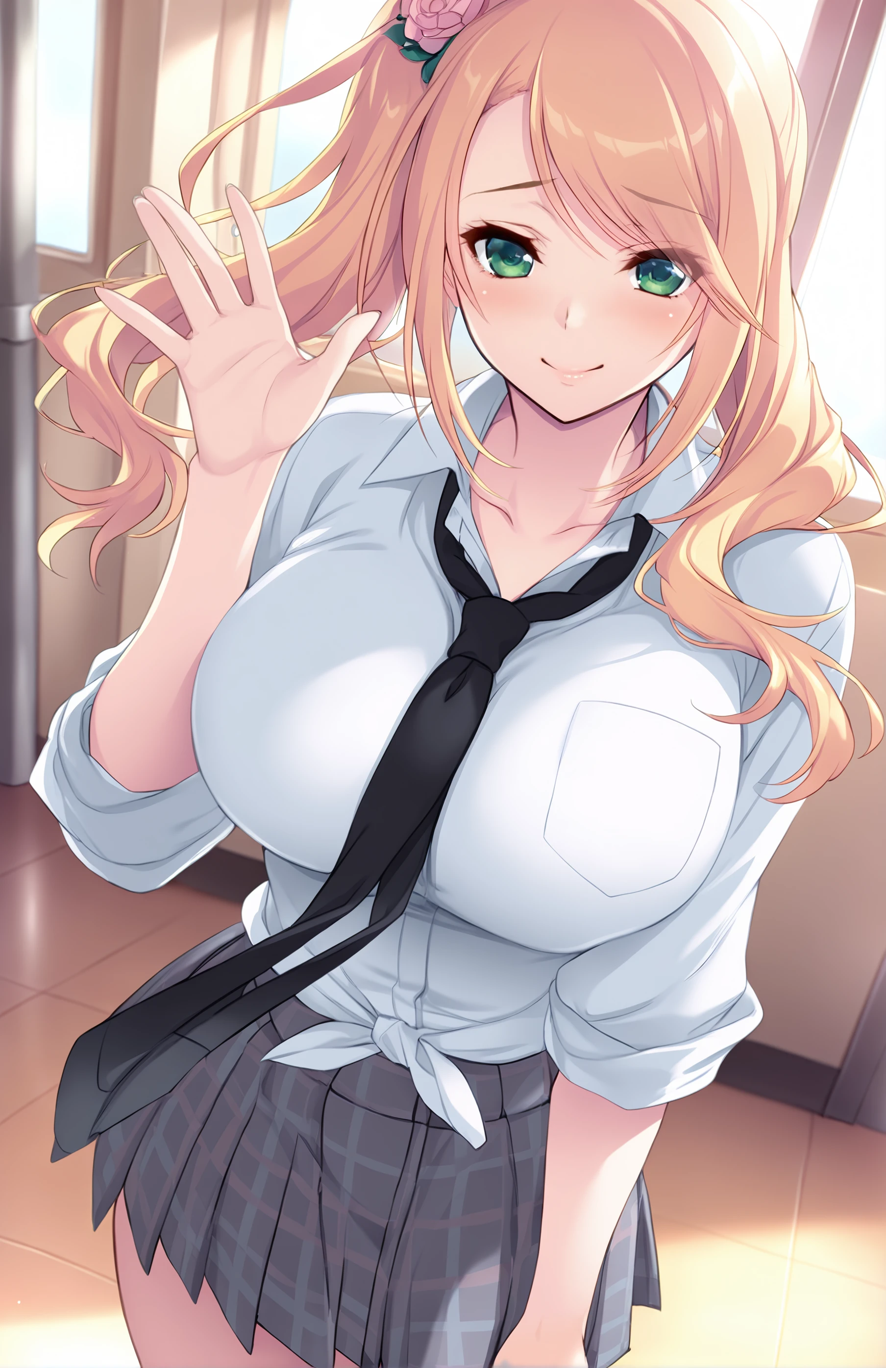 SasashimaYuuka, long hair, breasts, bangs, grey skirt, blonde hair, large breasts, shirt, hair ornament, school uniform, green eyes, white shirt, pleated skirt, necktie, collared shirt, hair flower, side ponytail, plaid, plaid skirt, black necktie, rolled up sleeves