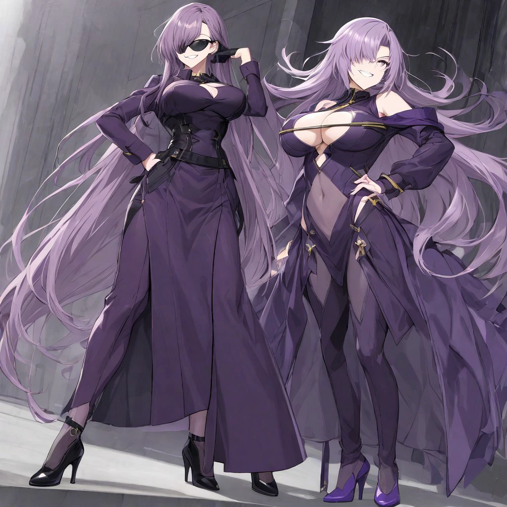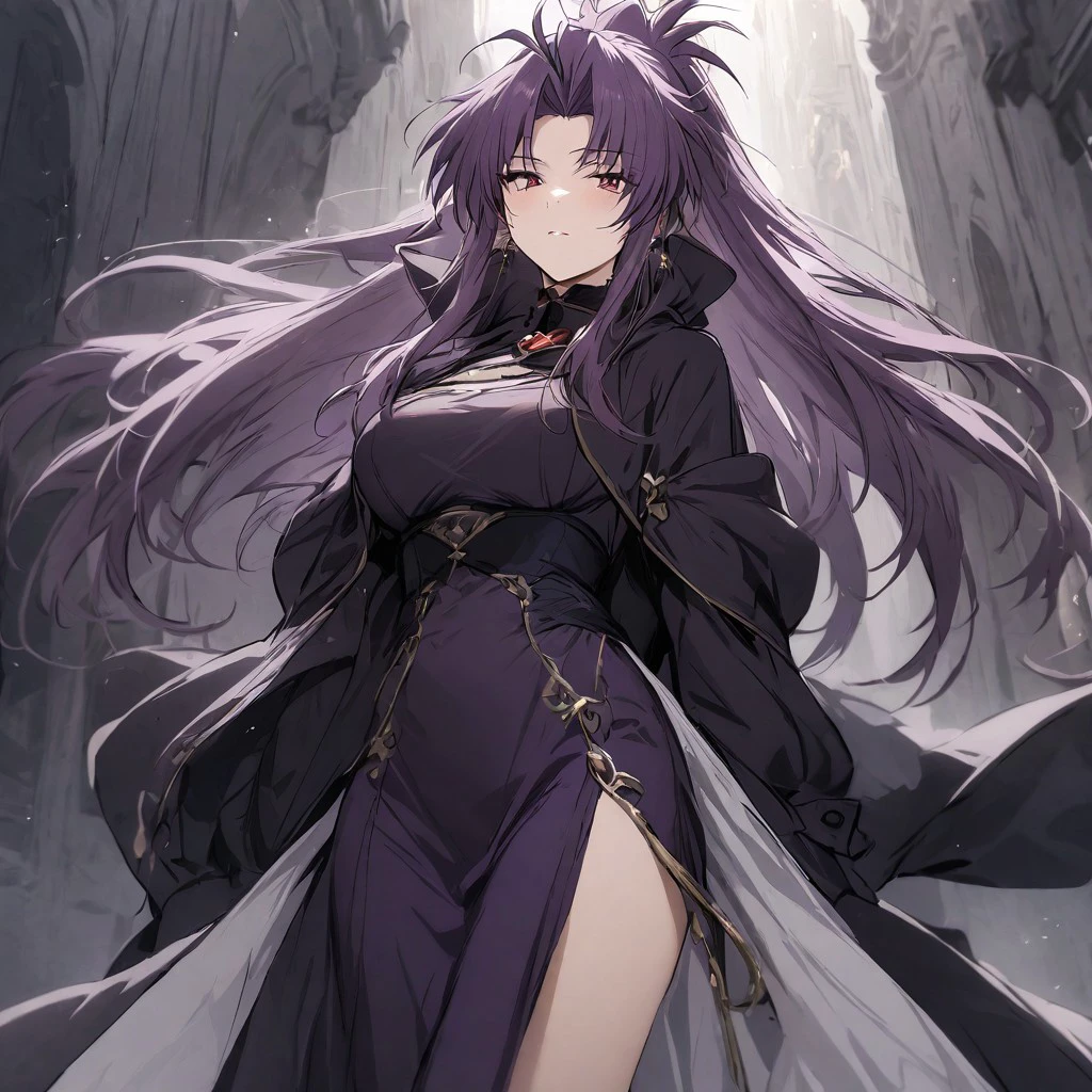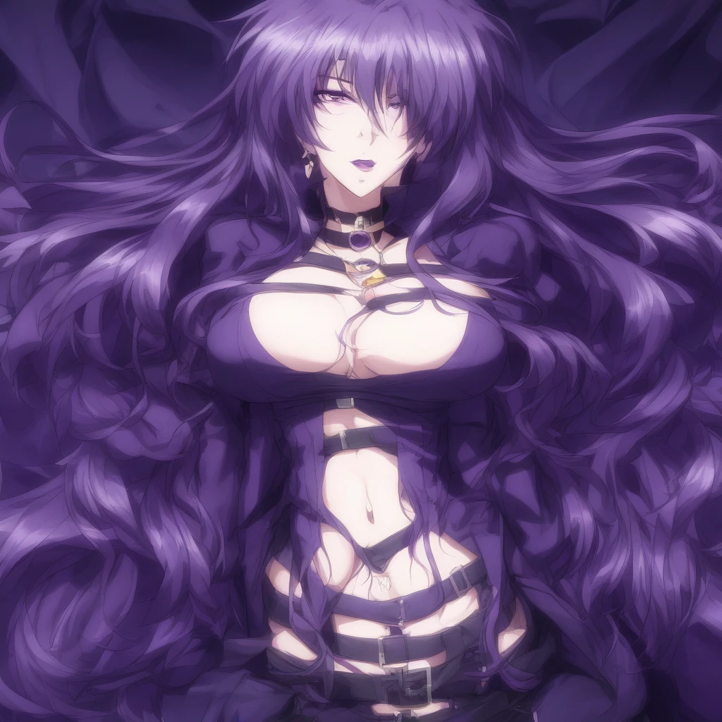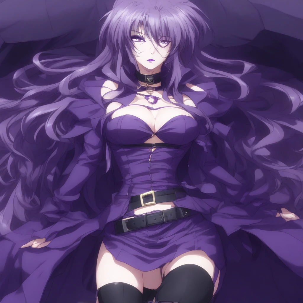 precia testarossa, 1 girl, purple eyes, purple lips, long hair, breasts, choker, purple dress, cleavage, hair over one eye,