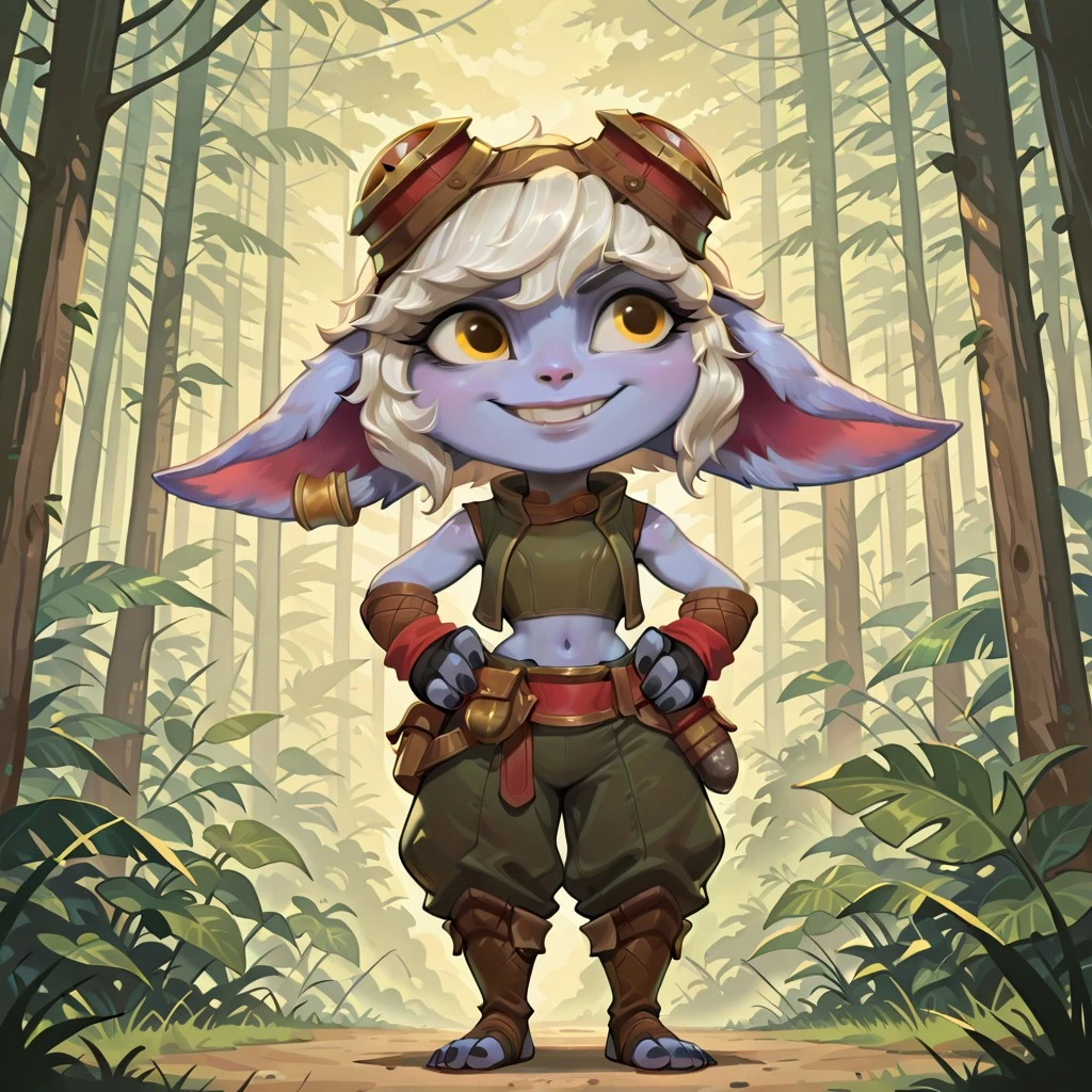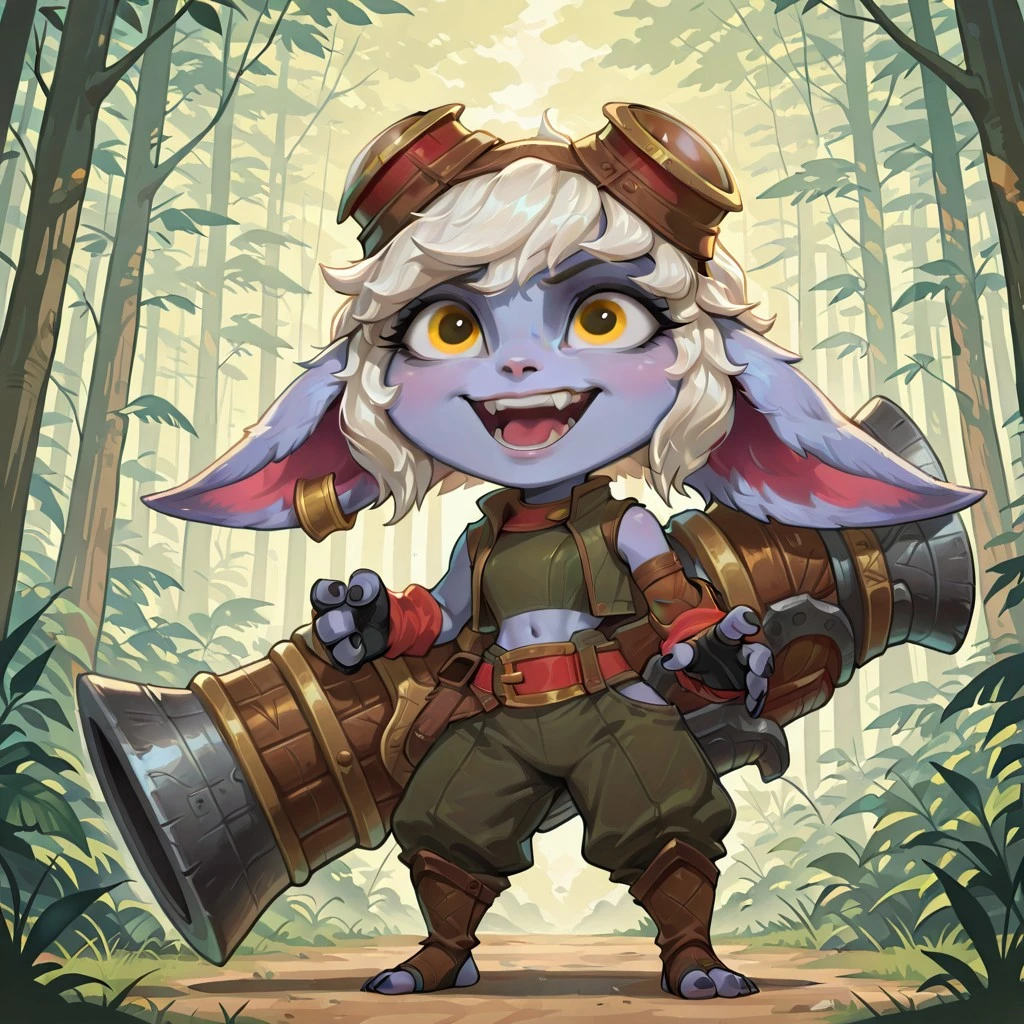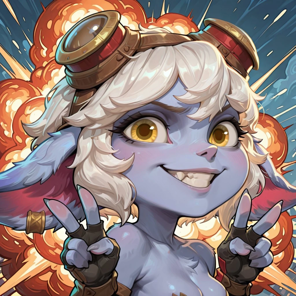 yordle female, solo, curvy, light blue fur, light blue skin, large ears, one gold earring in one ear, white wavy hair, short white wavy hair, yellow eyes, blue ears with pink accent, dark green top, dark green vest with brown accent, midriff, baggy dark green pants with brown leg guards, brown toeless boots, black nails, grenades on red belt, brown armguards, black fingerless gloves, one red wrist wrap, large brown goggles,