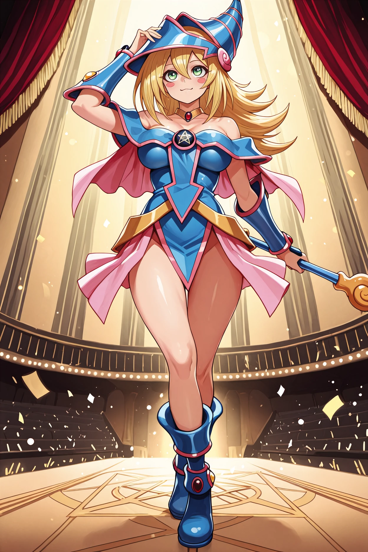 pentagram, collarbone, boots, blue footwear, pentacle, choker, wizard hat, showgirl skirt, pink skirt, blue dress, off-shoulder dress, cleavage, detached sleeves