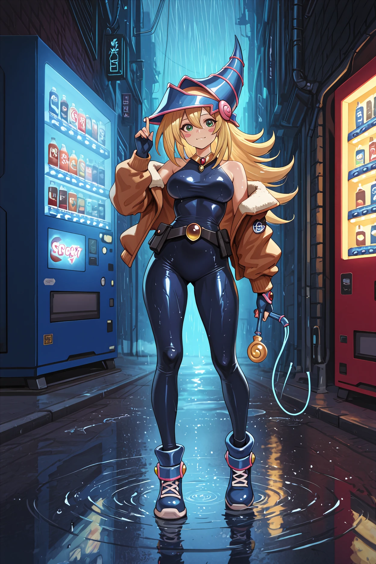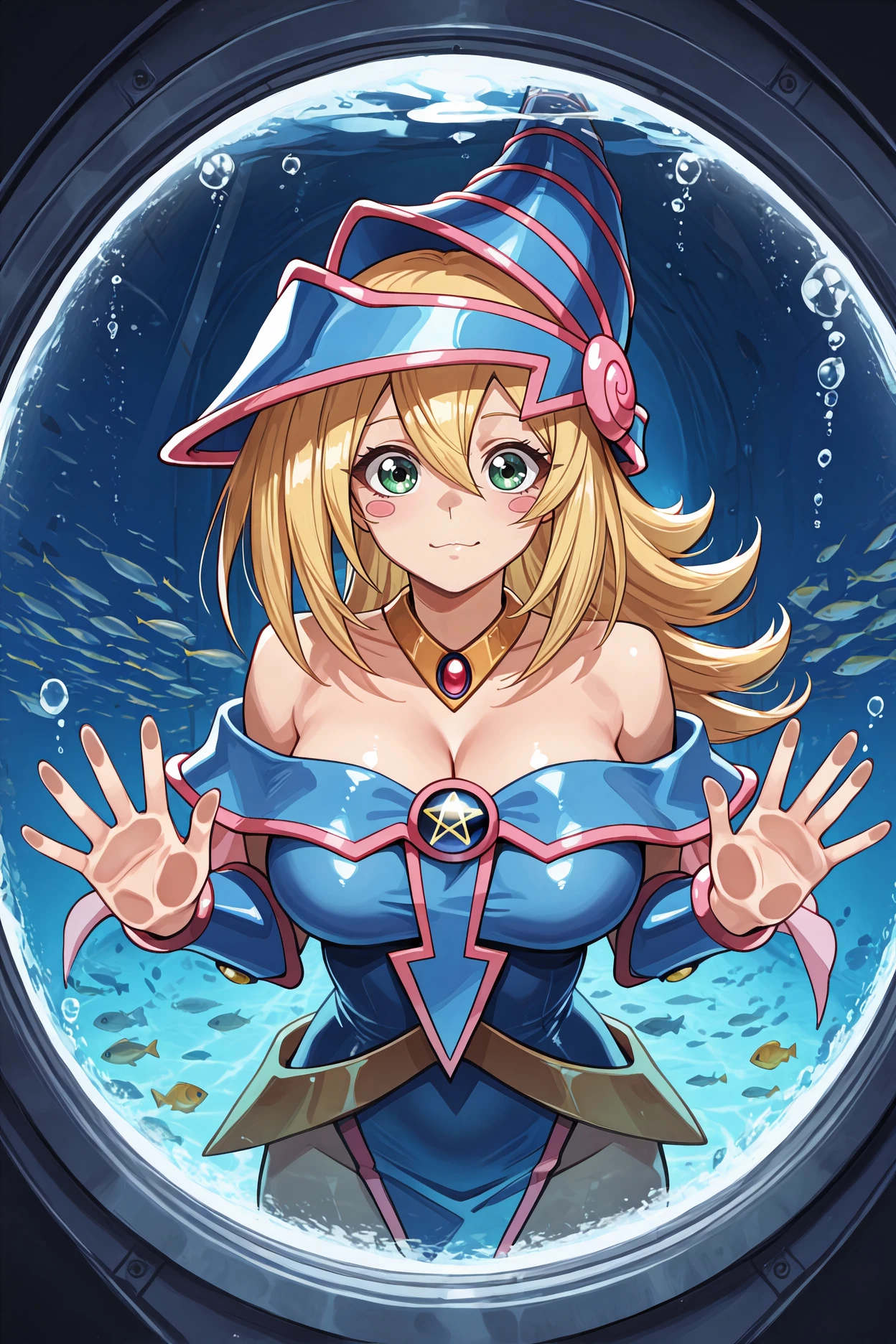 dark magician girl, hair between eyes, green eyes, long hair, blush stickers