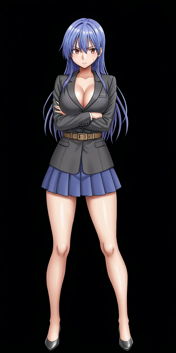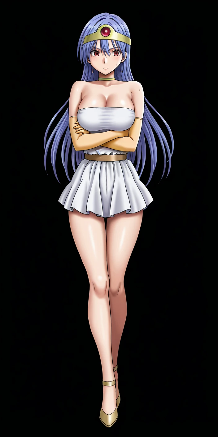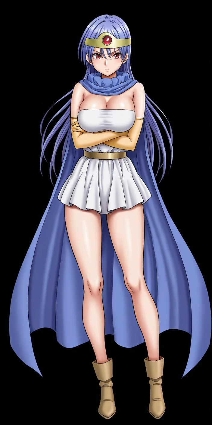 Kenja,long hair,blue hair,red eyes,circlet,cape,elbow gloves,large breasts,white dress,belt,miniskirt