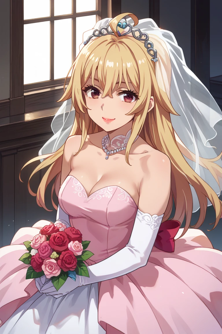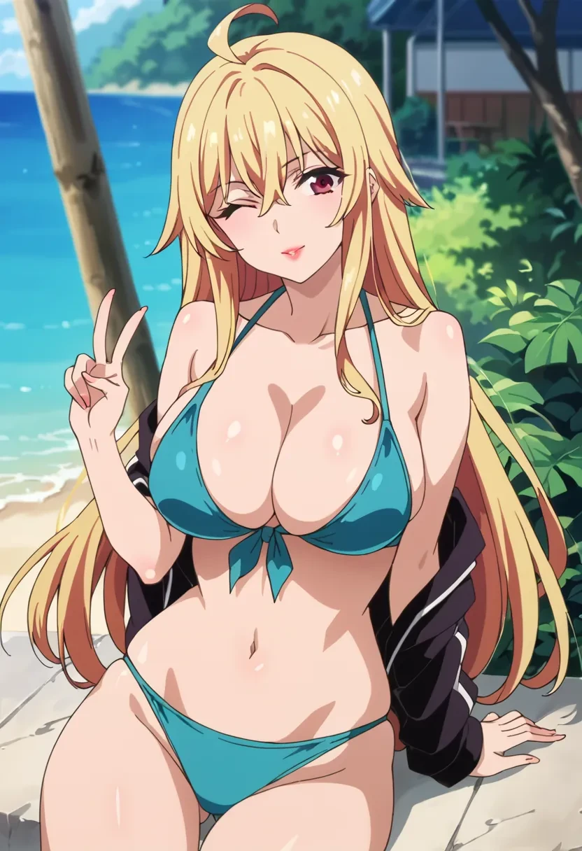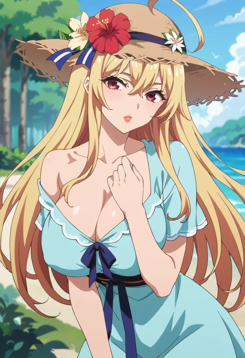 Shikishima Mirei, red eyes, blonde hair, long hair, large breasts, lipstick, ahoge