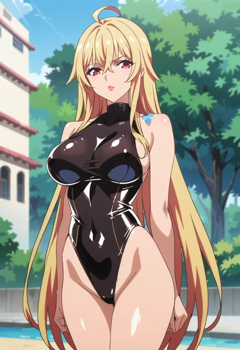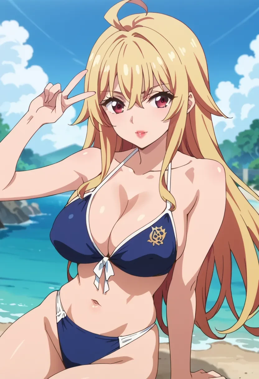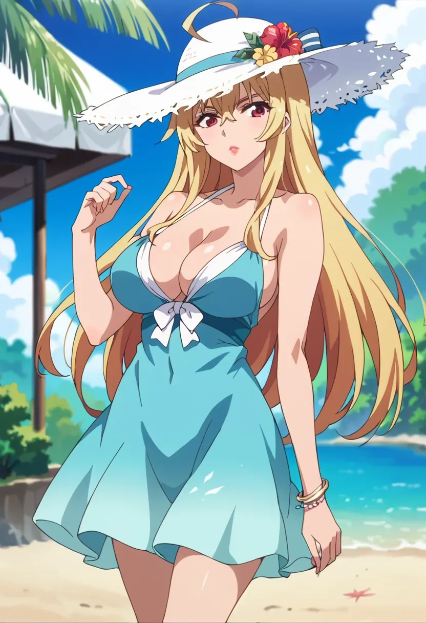 Shikishima Mirei, red eyes, blonde hair, long hair, large breasts, lipstick, ahoge, red skirt, plaid skirt, necktie between breasts, white shirt, school uniform, no braFeel free to give me feedback. I can always improve :)