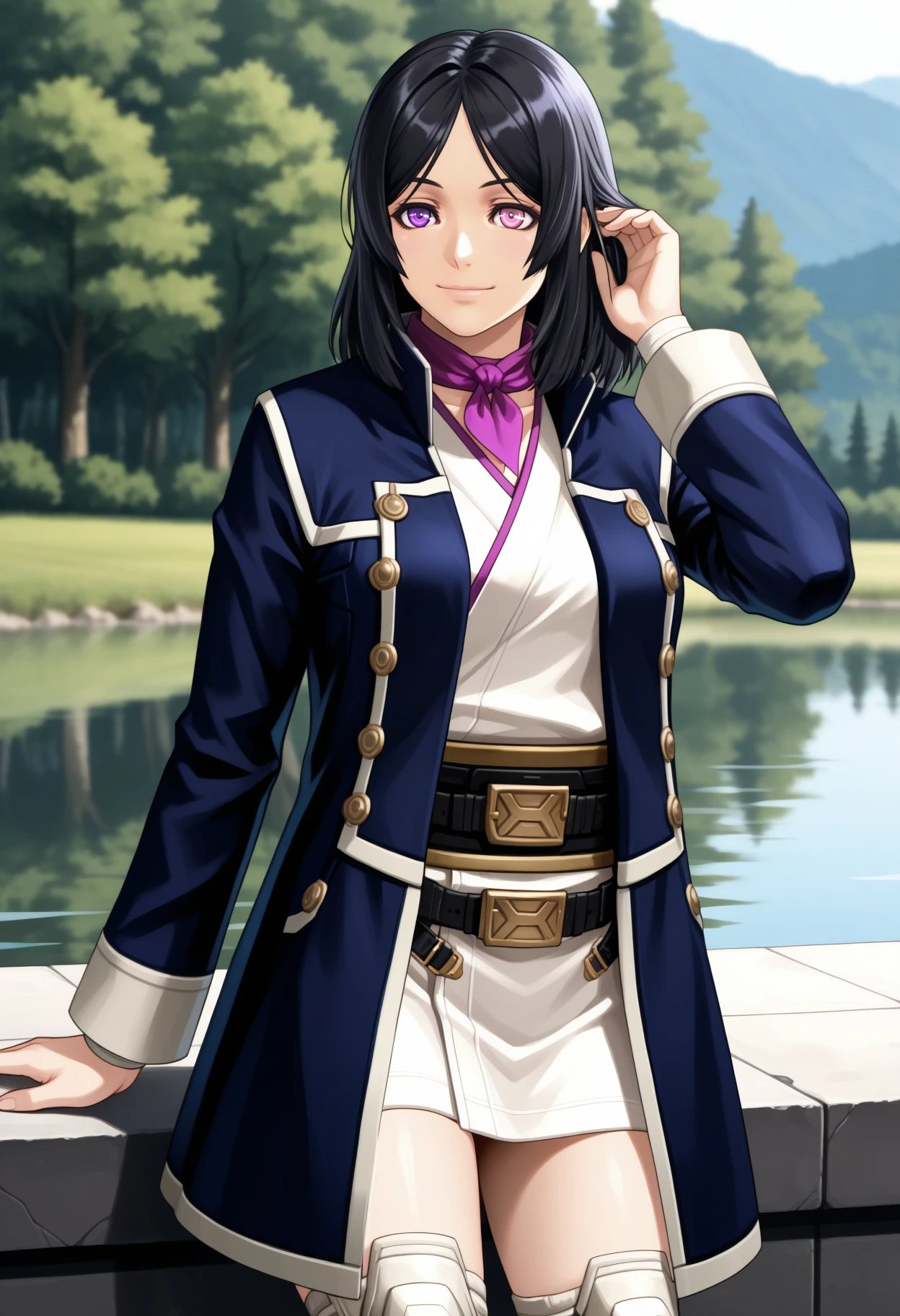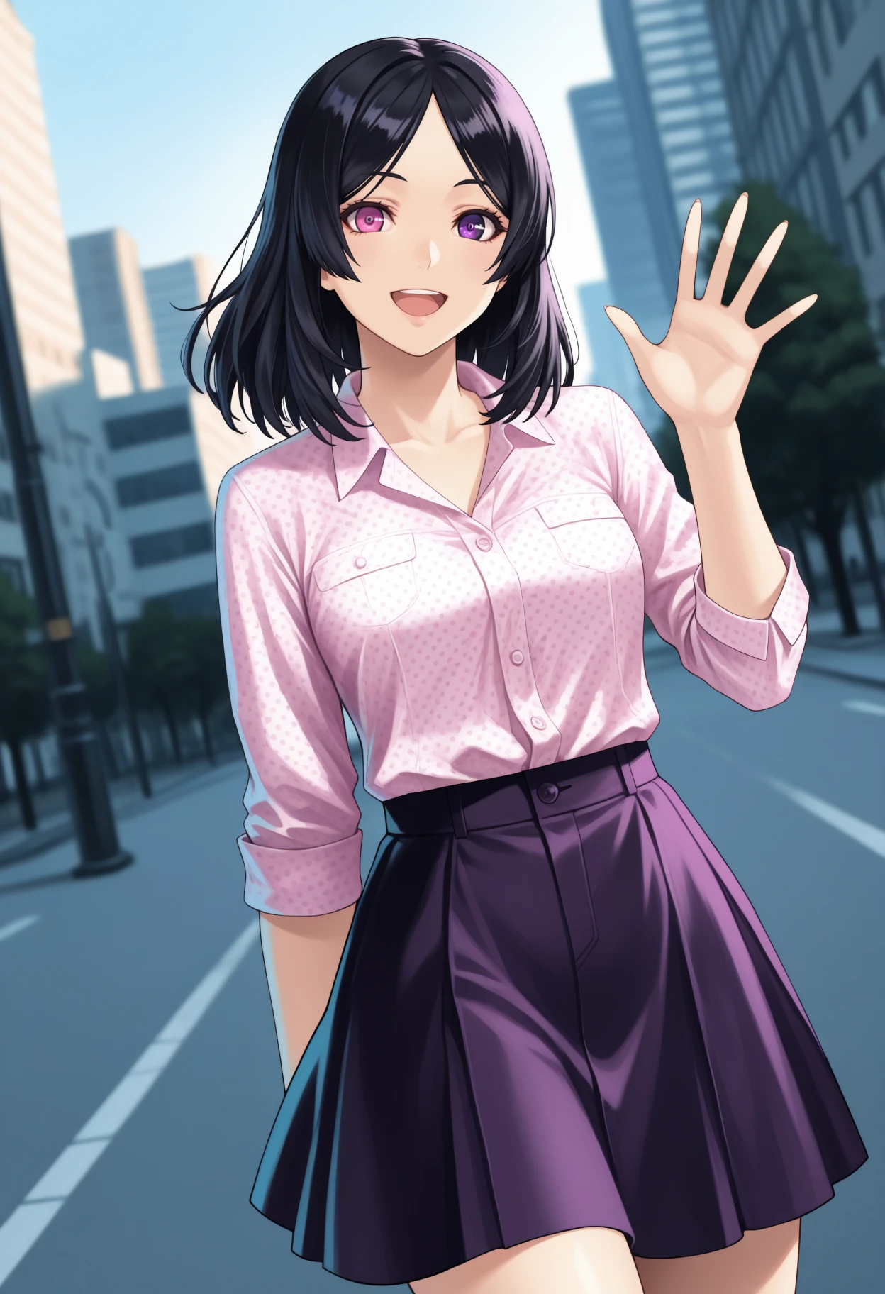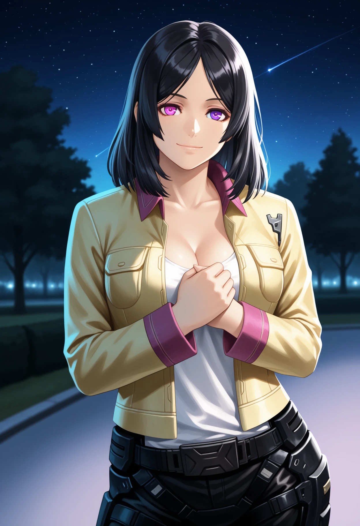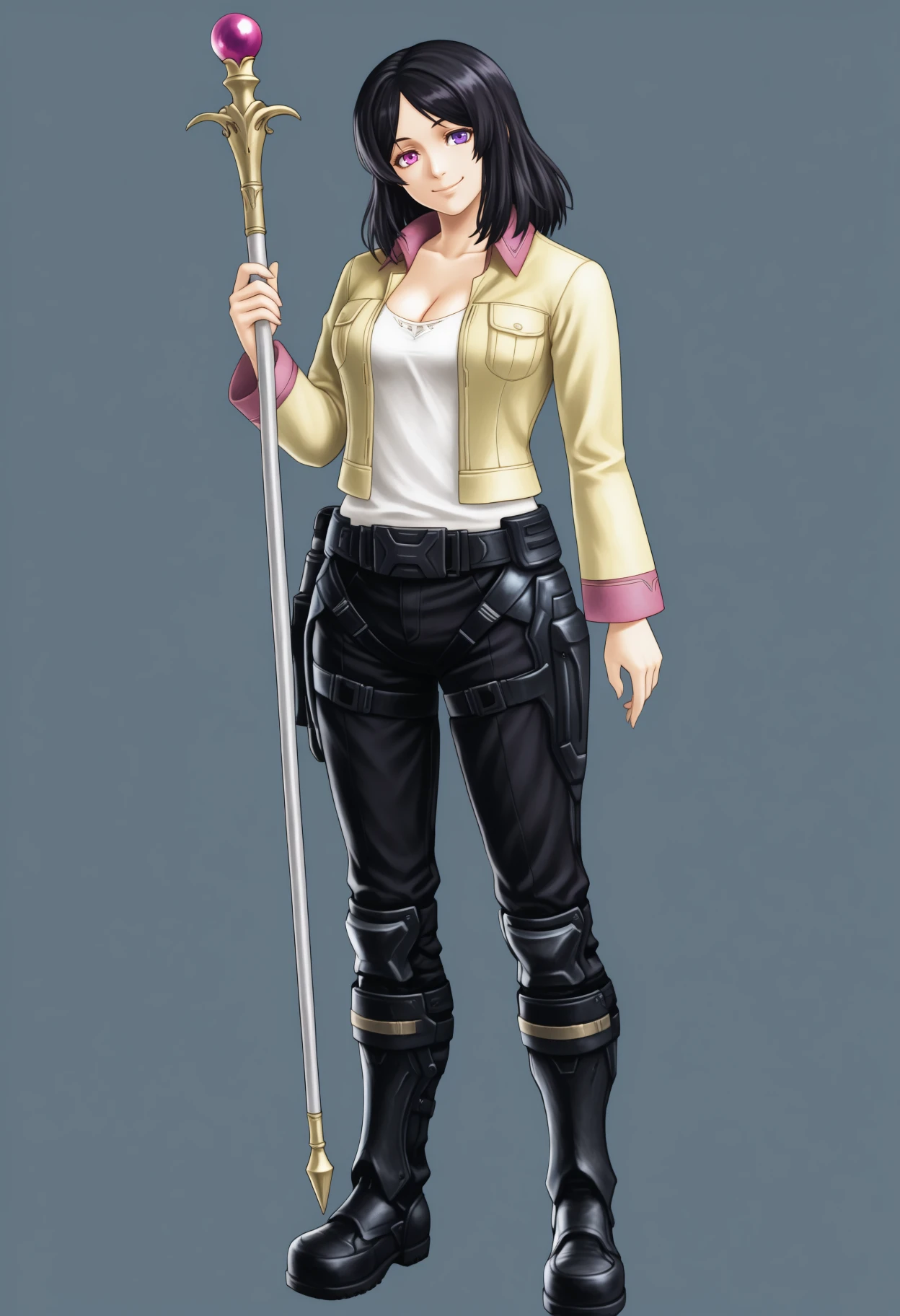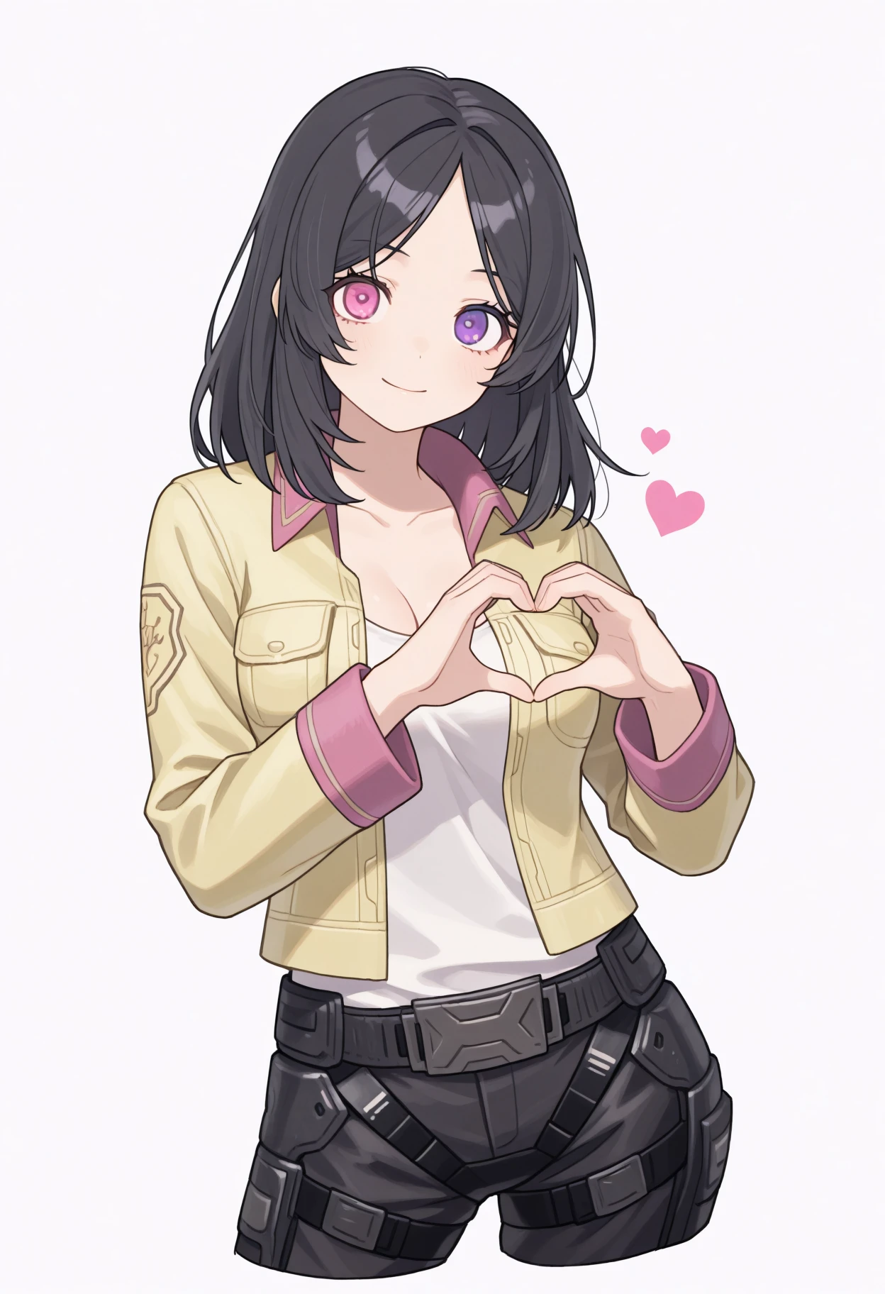 hopeXCX, medium hair, parted bangs, black hair, heterochromia, pink eye, purple eye, collared jacket, yellow jacket, pink trim, open jacket, white top, cleavage, combat pants, belt, combat bootsDescription