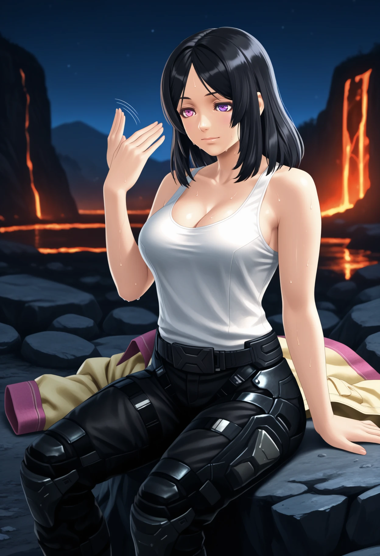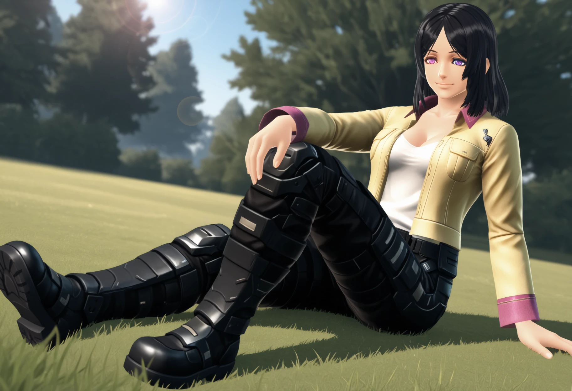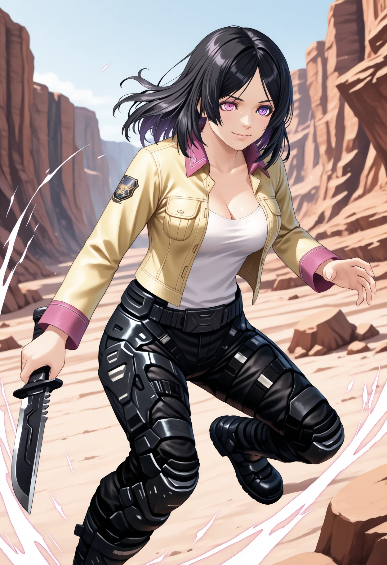 hopeXCX, medium hair, parted bangs, black hair, heterochromia, pink eye, purple eye, collared jacket, yellow jacket, pink trim, open jacket, white top, cleavage, combat pants, belt, combat boots