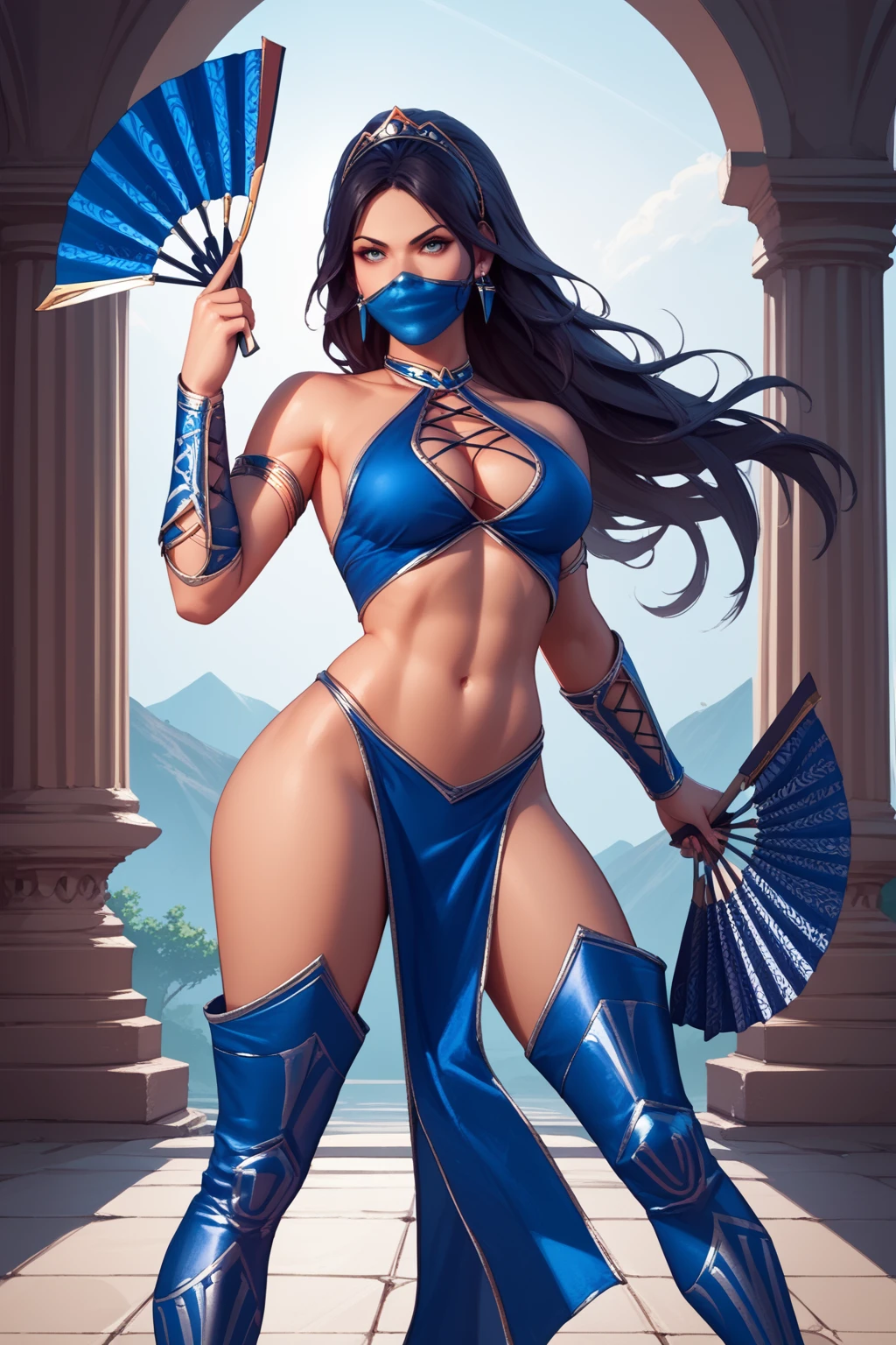 Ktana, long hair, tiara, earrings, mouth mask, halterneck, cleavage, clothing cutout, cross-laced clothes, armlet, vambraces, midriff, pelvic curtain, thigh boots