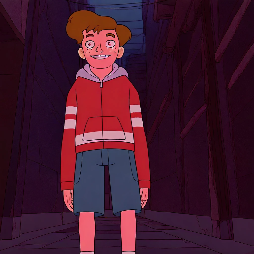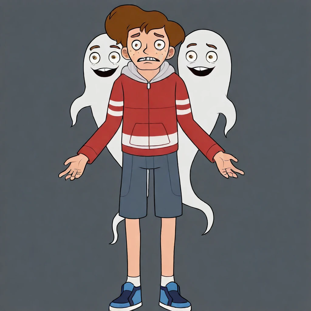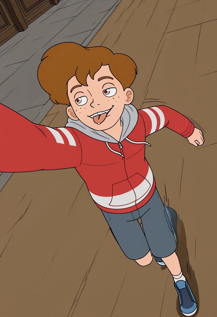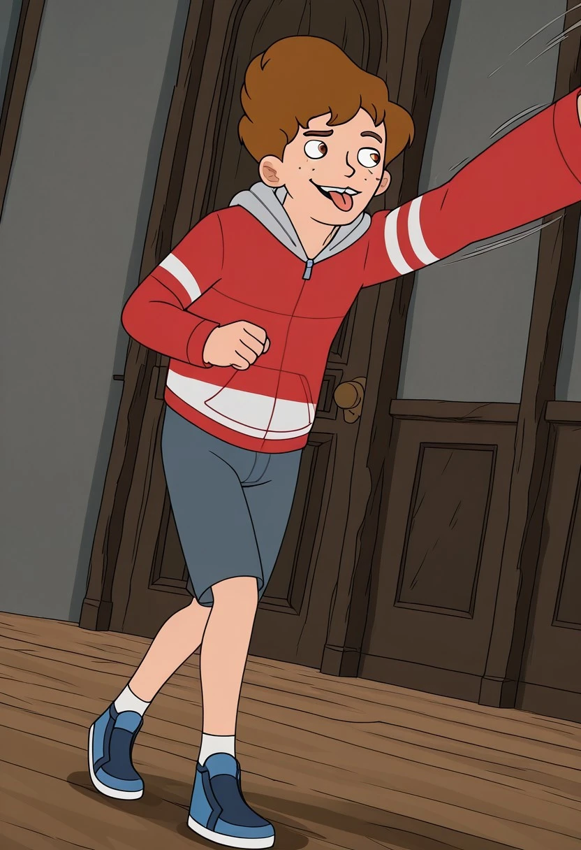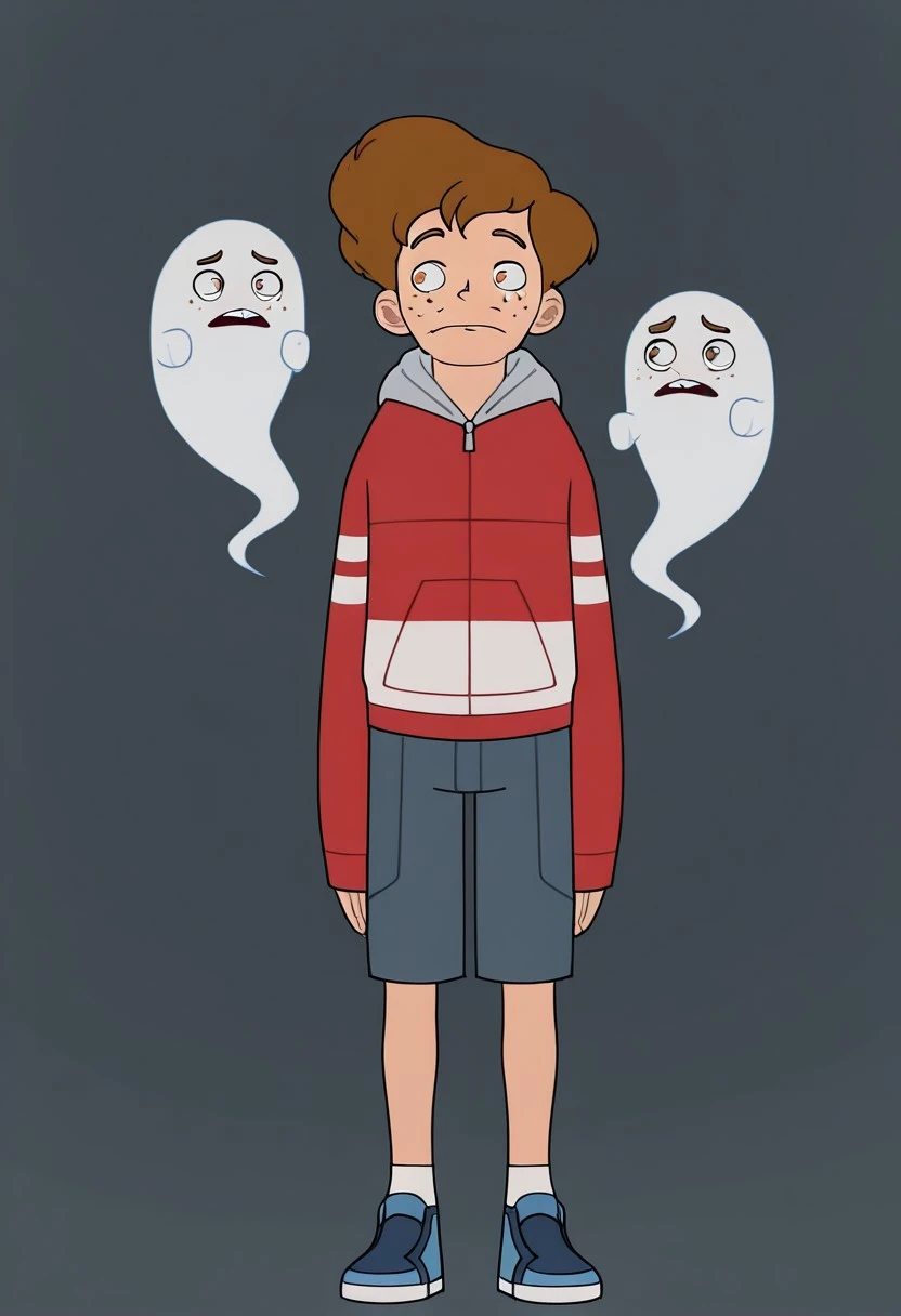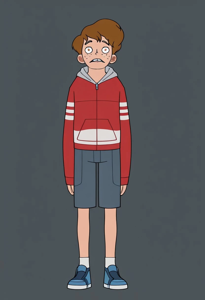 BenFreeling, 1boy, solo, male teen, Ben hair Style, brown hair, fair skin, brown eyes, freckles, gap tooth, thin and tall body, red zip hoodie, light gray hood, blue shorts, white socks, blue sneakers,
