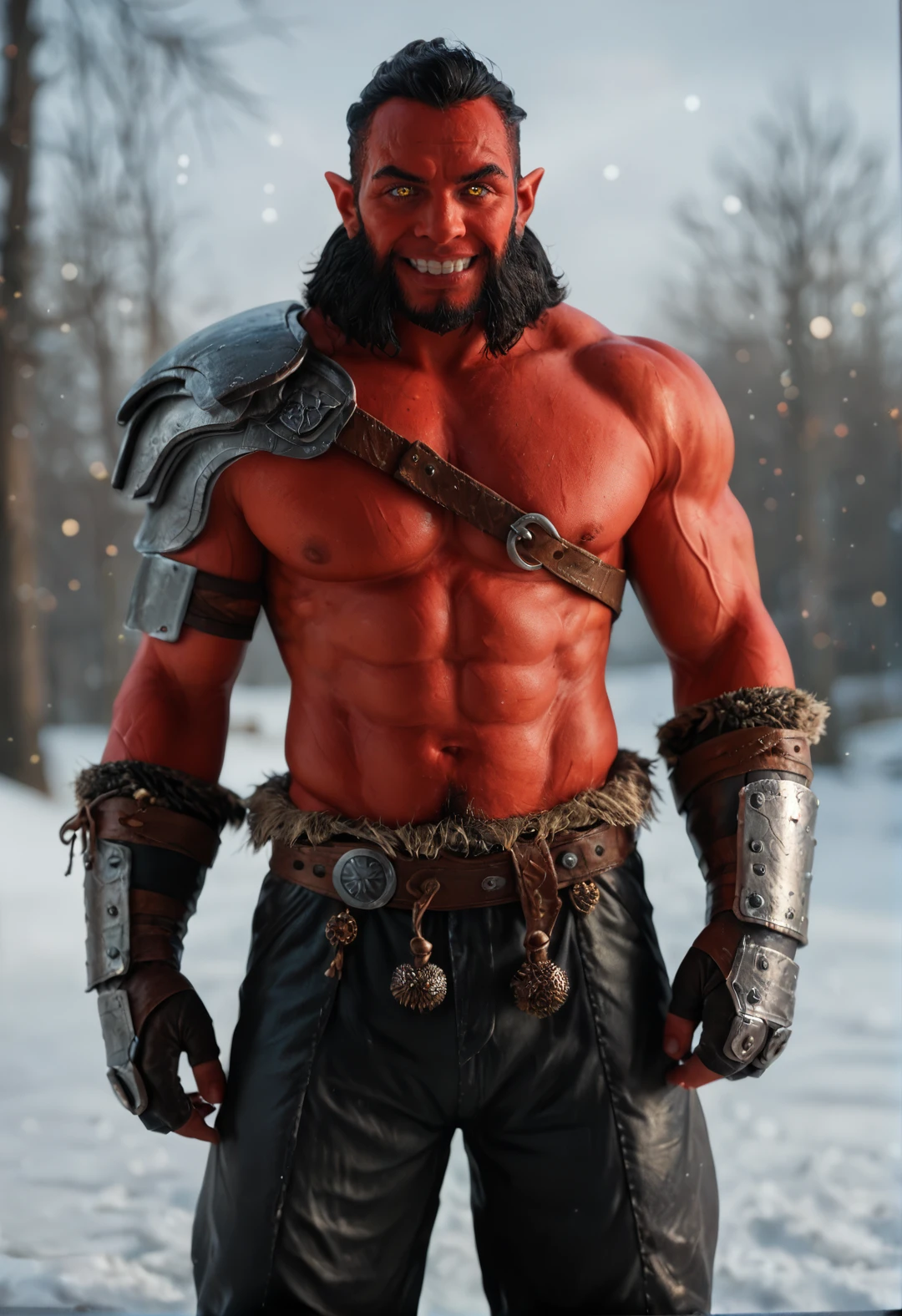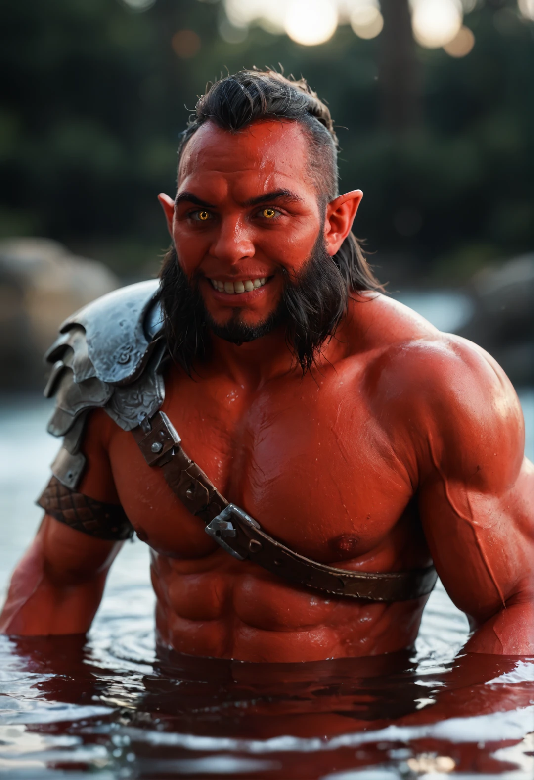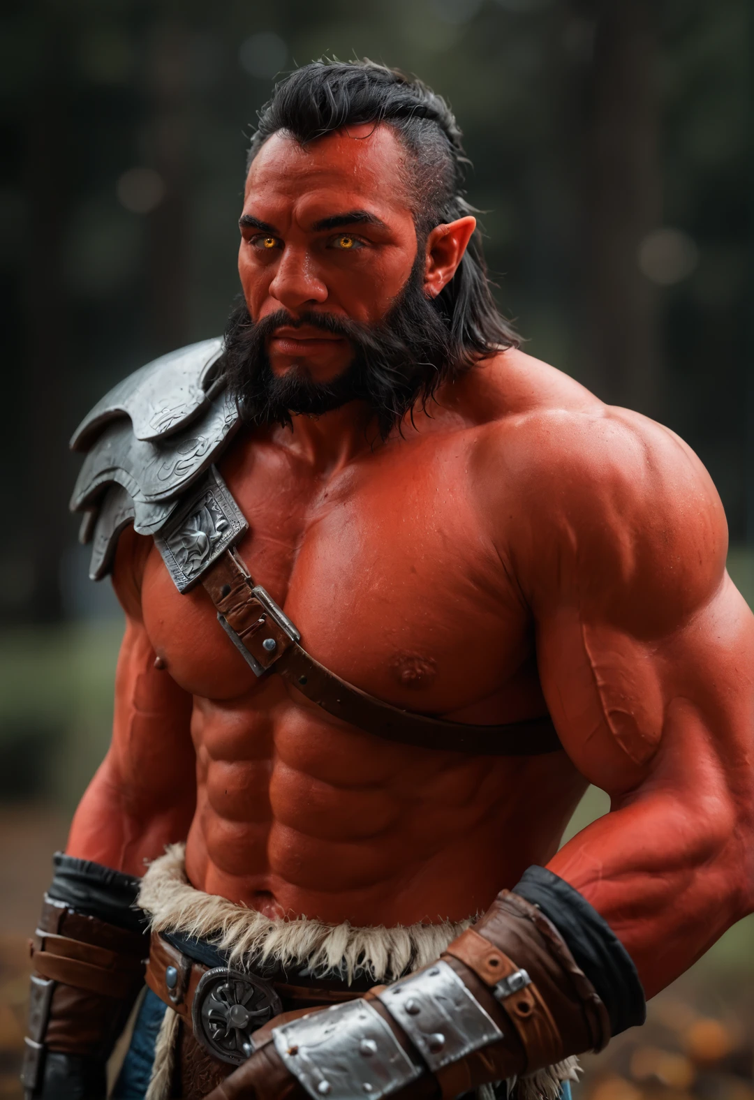 1boy, colored skin, red skin, black hair, facial hair, beard, muscular, muscular male,pectorals, yellow eyes, pointy ears,