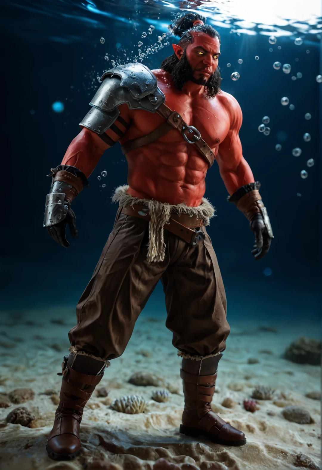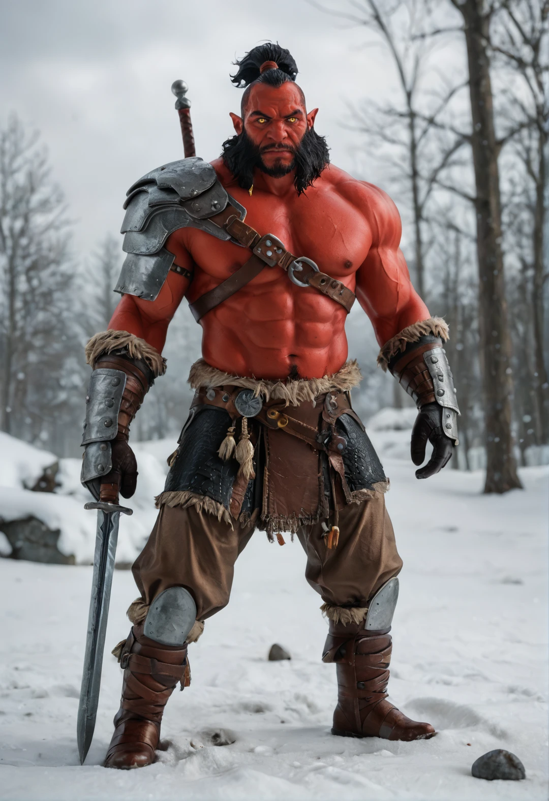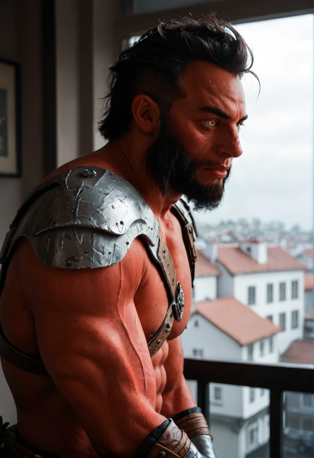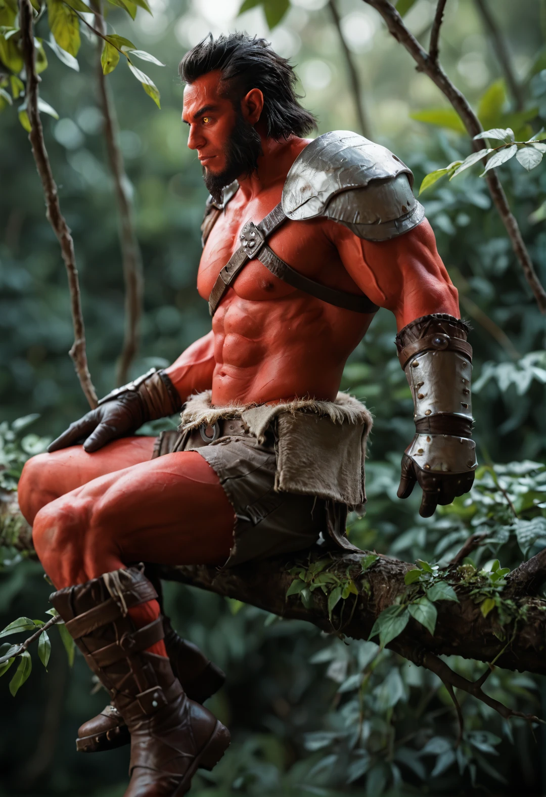 1boy, colored skin, red skin, black hair, facial hair, beard, muscular, muscular male,pectorals, yellow eyes, pointy ears,