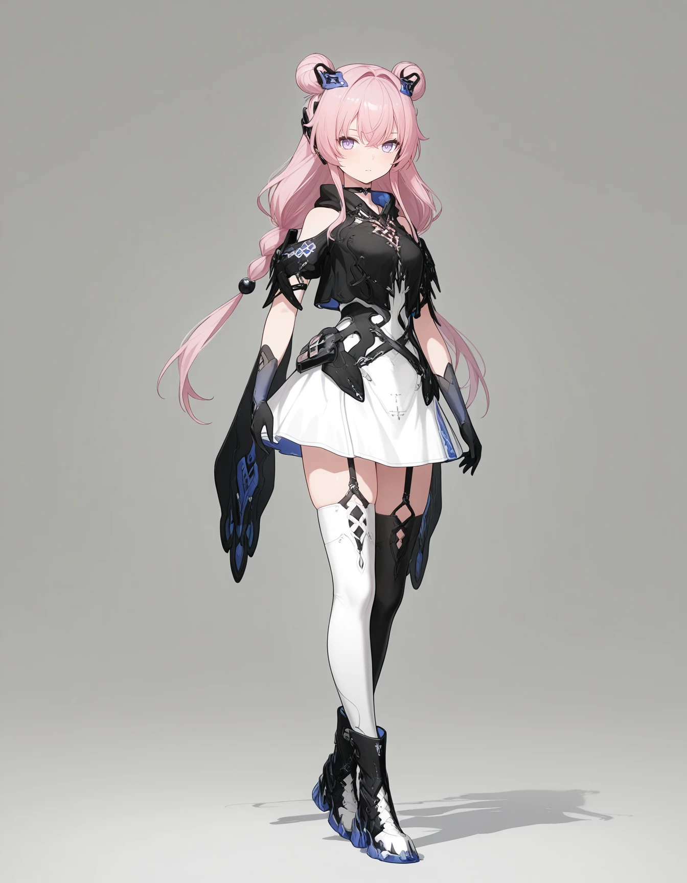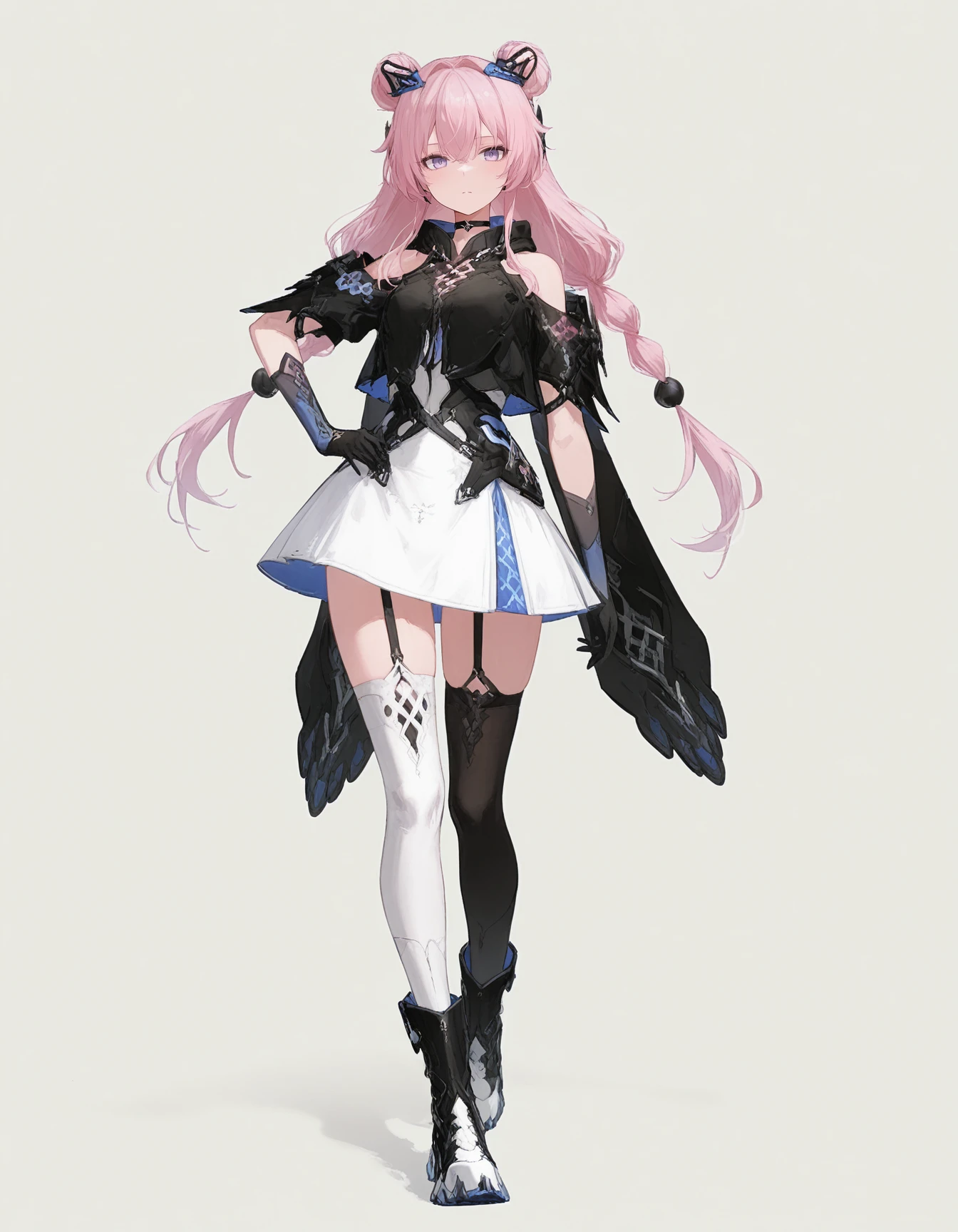 mai_pgr_teddyhy,long_hair,double_bun,twintails,pink_hair,hair_between_eyes,purple_eyes,headgear,shoulder_cutout,black_jacket,white_dress,black_gloves,asymmetrical_legwear,black_footwear,garter_straps,boots