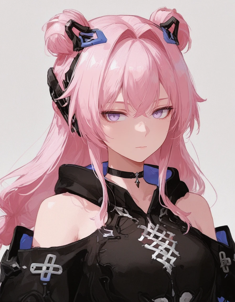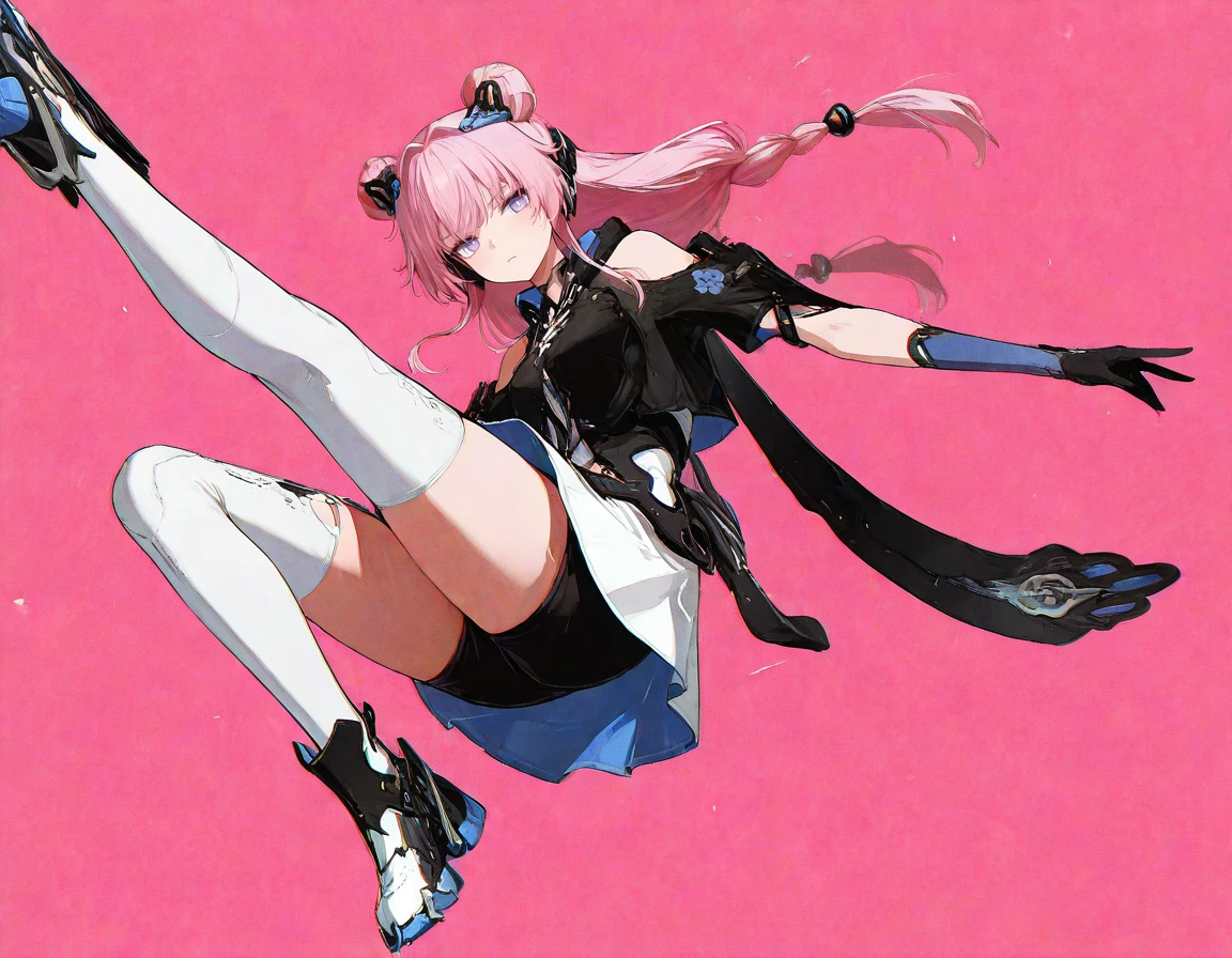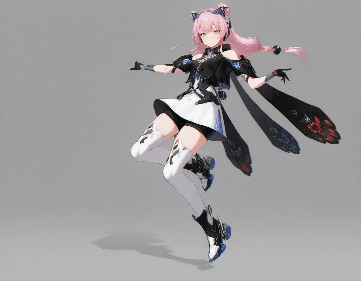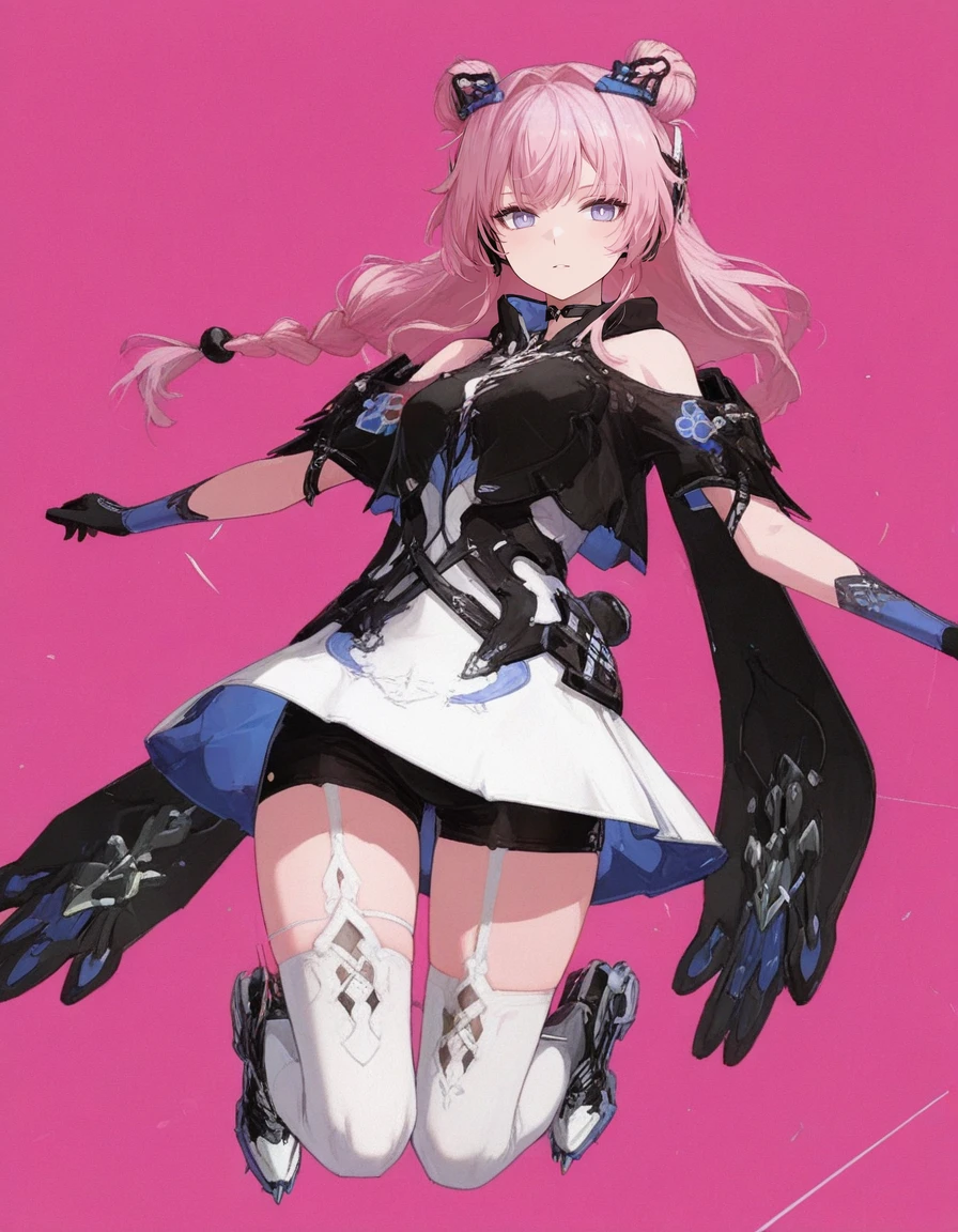 mai_pgr_teddyhy,long_hair,double_bun,twintails,pink_hair,hair_between_eyes,purple_eyes,headgear,shoulder_cutout,black_jacket,white_dress,black_gloves,asymmetrical_legwear,black_footwear,garter_straps,bootsRecommend preferred Strength: 0.7~1.