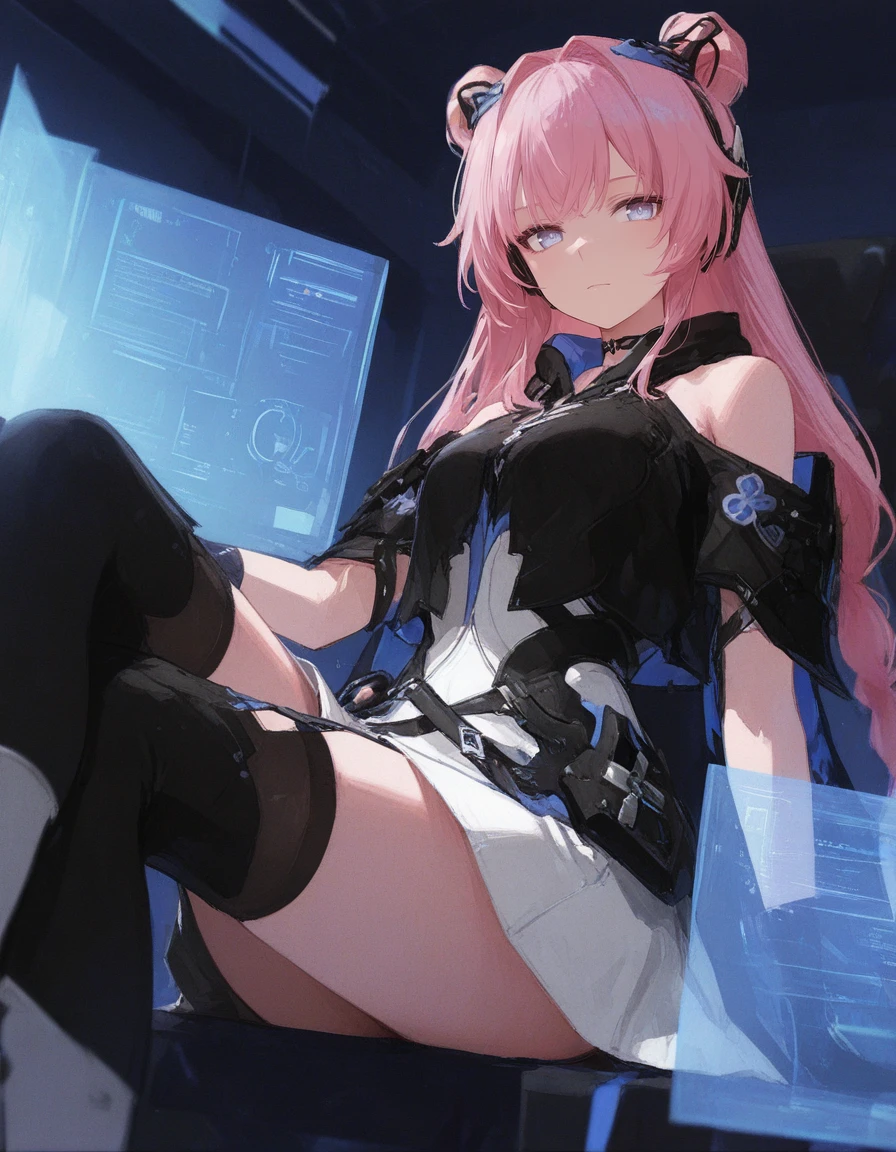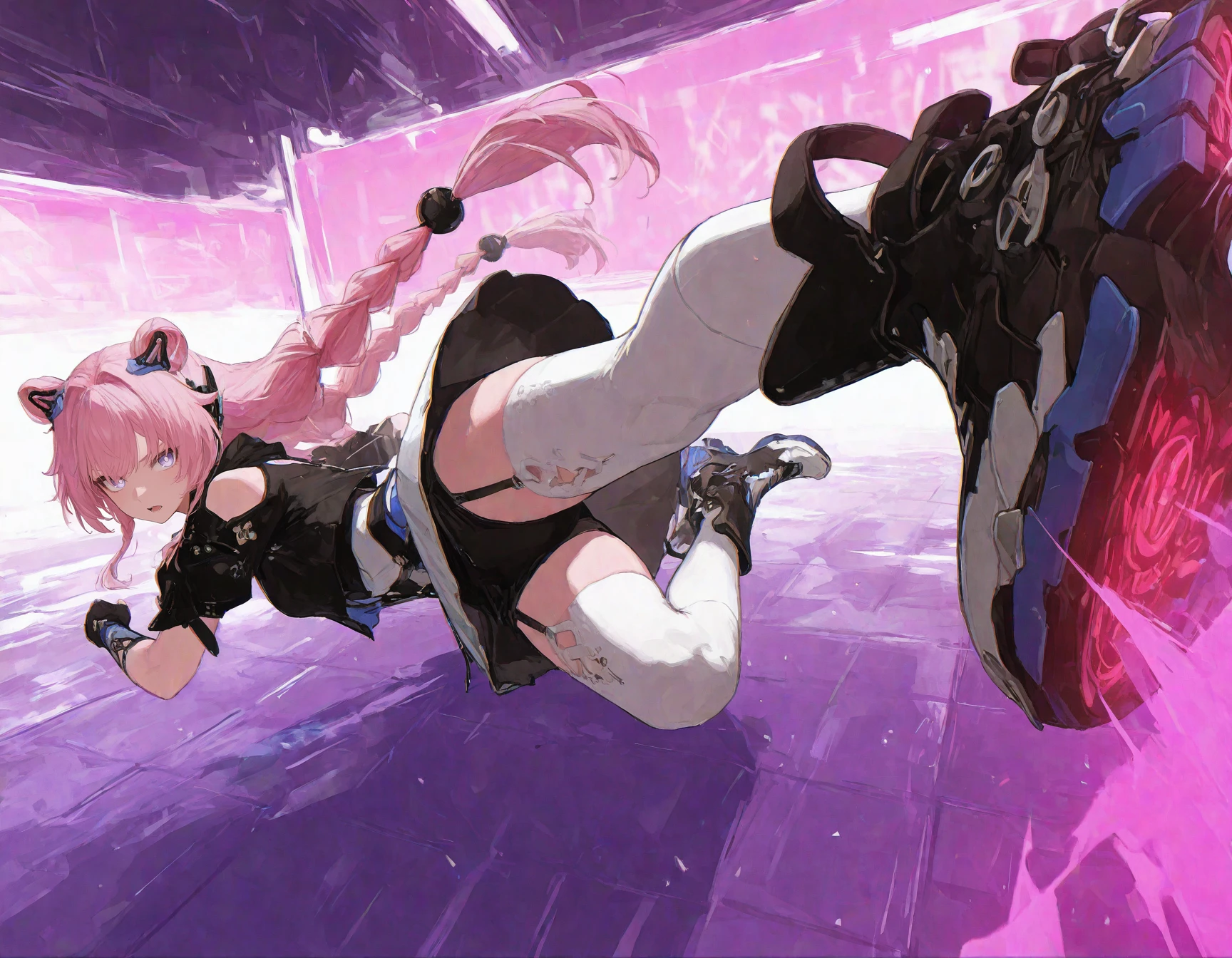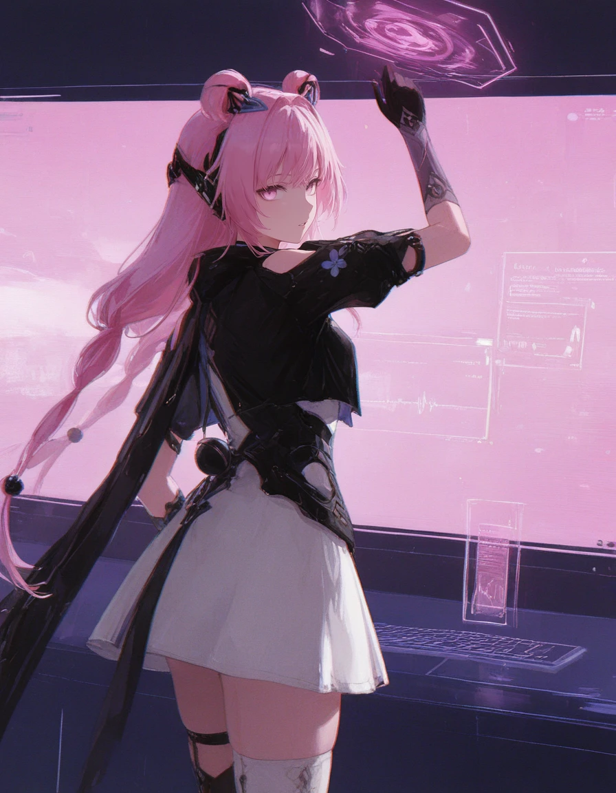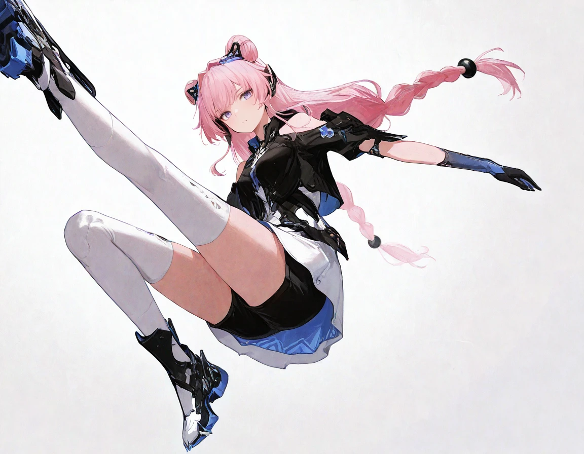 mai_pgr_teddyhy,long_hair,double_bun,twintails,pink_hair,hair_between_eyes,purple_eyes,headgear,shoulder_cutout,black_jacket,white_dress,black_gloves,asymmetrical_legwear,black_footwear,garter_straps,bootsRecommend preferred Strength: 0.7~1.