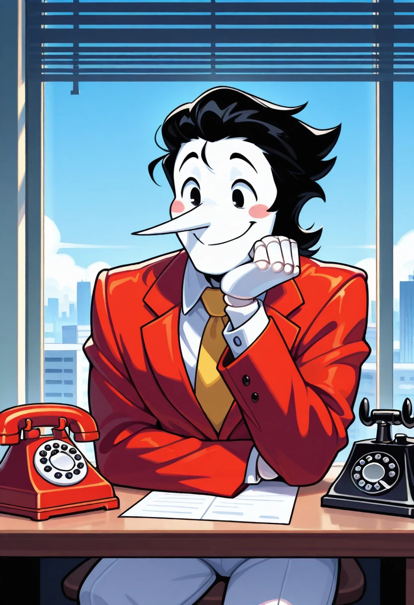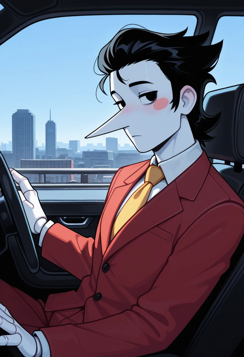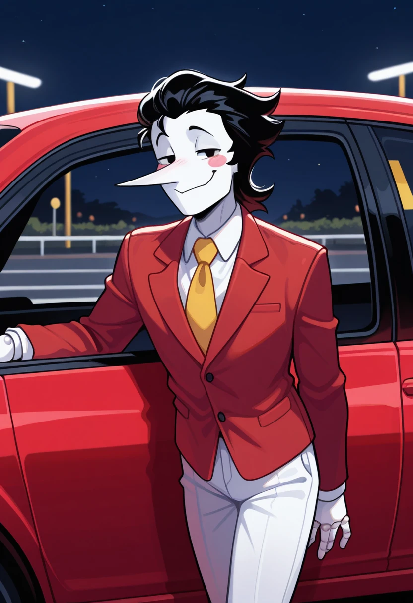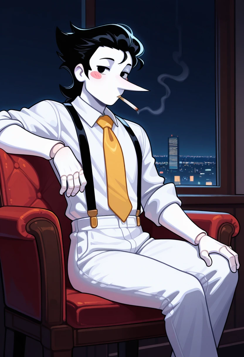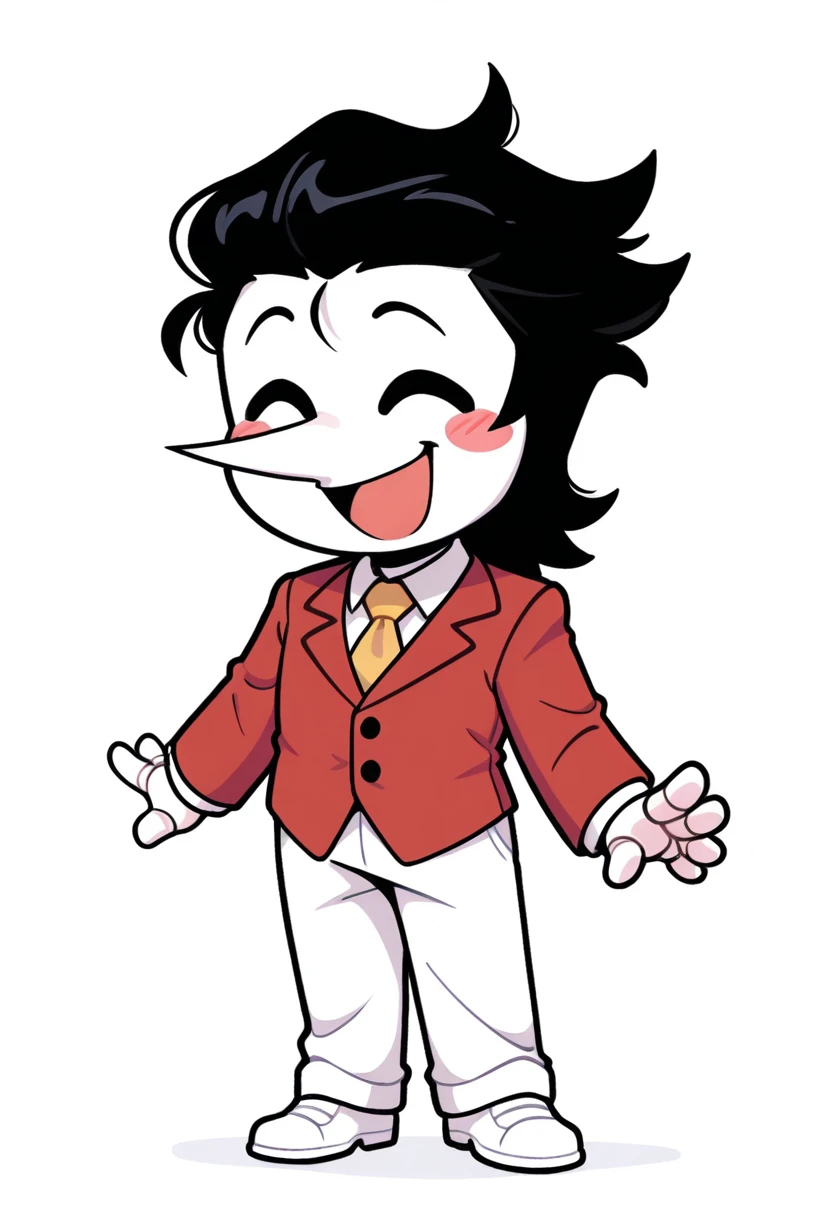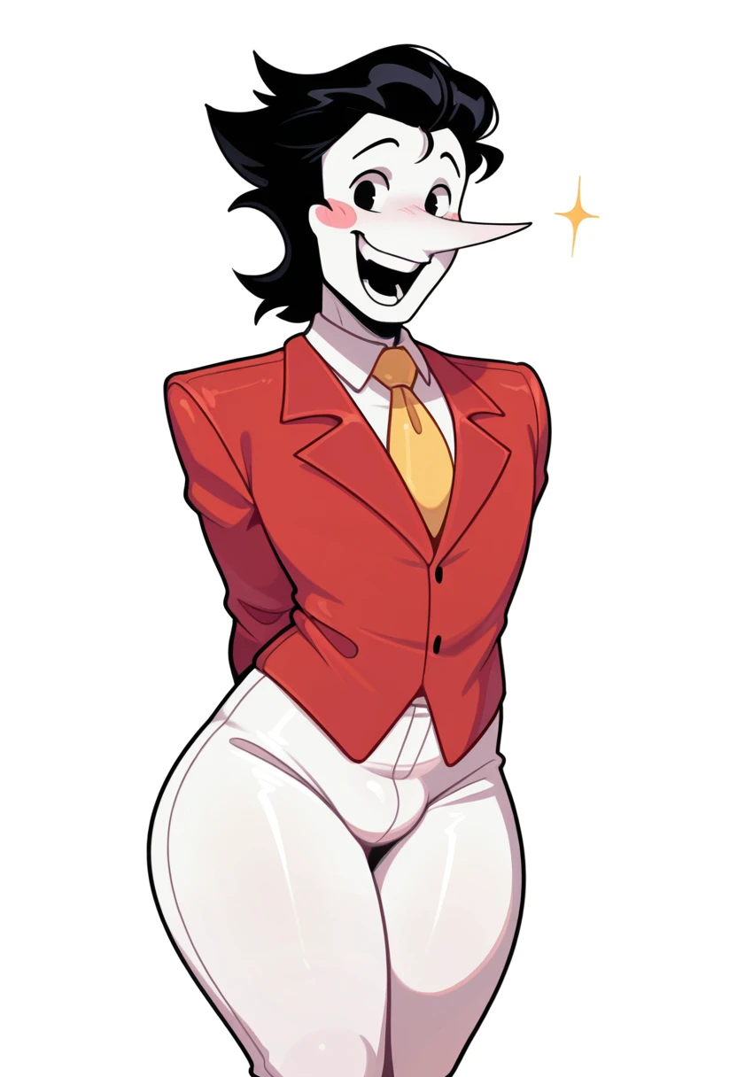 Trigger word(s) are BS_Spamton, black eyes, colored skin, white skin, long nose, pointy nose, blush stickers, no ears, black hair, hair slicked back, doll joints