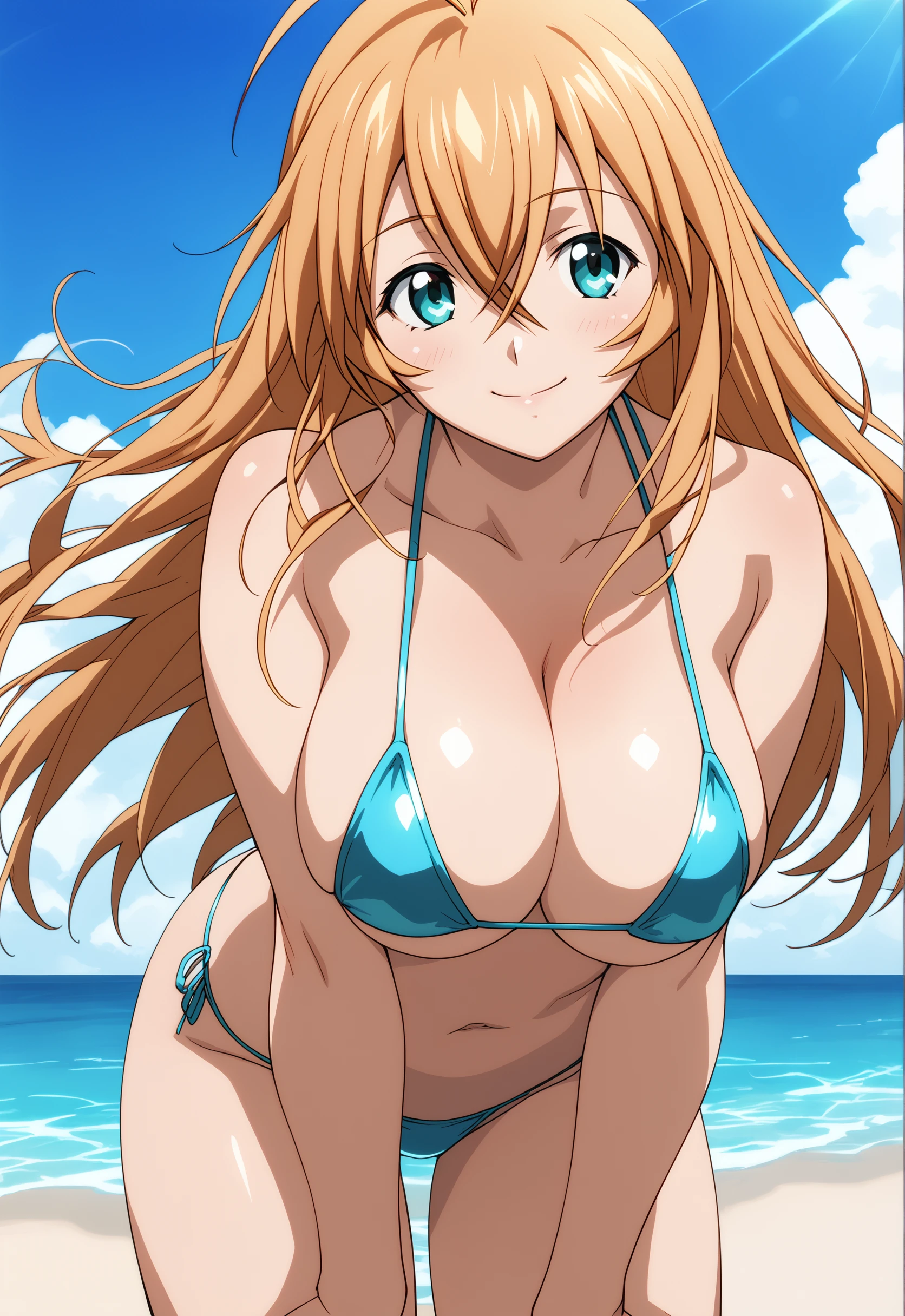 sonsakuhakufupony, long hair, orange hair, aqua eyes, hair between eyes, antenna hair, large breasts,