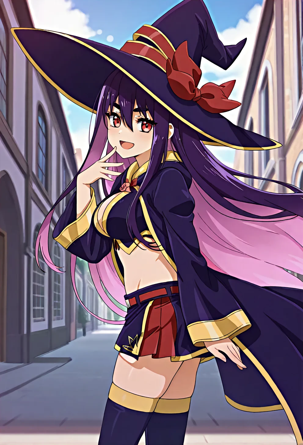 idola-default,idola avorn,red eyes,purple hair, long hair,witch hat, black robe, crop top, layered skirt,thighboots