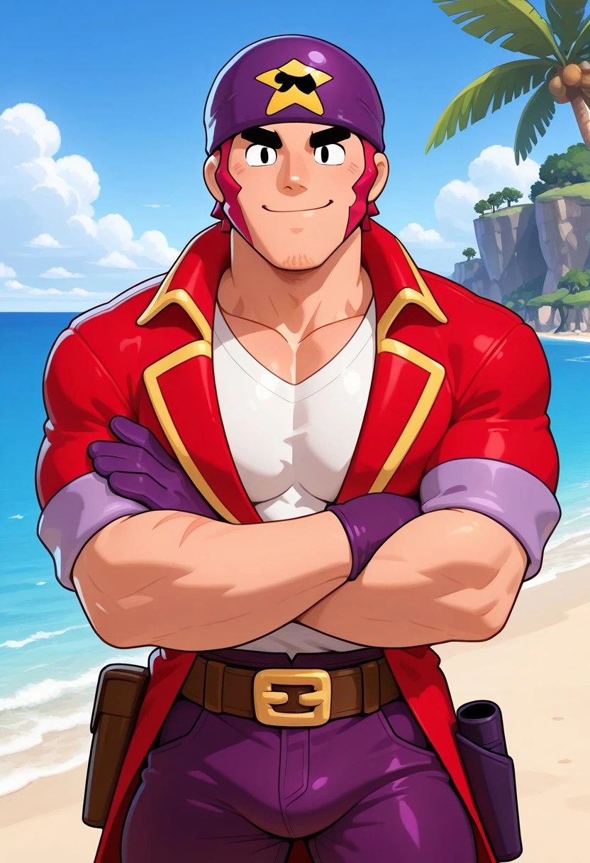 C0rs41r_C0lt, purple corsair headband, magenta sidebuns, covered hair, long sidebuns, scar "x" on chin, black eyes, black eyebrows, thick eyebrows, red collared coat, belt, white shirt, purple gloves, purple pants, grey corsair boots