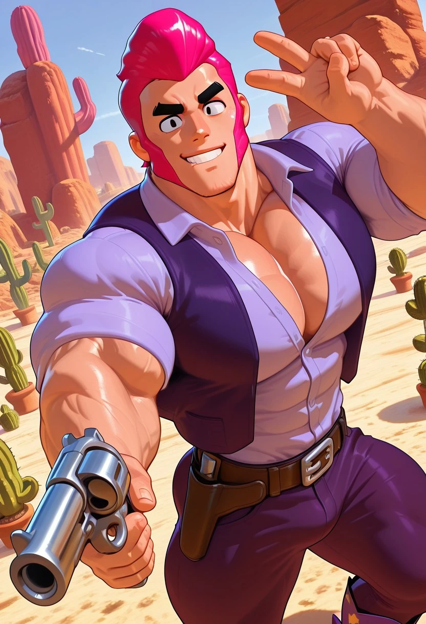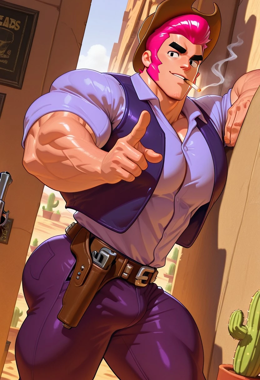 C0ltBS, magenta hair, long sideburns, pompadour, thick eyebrows, blavk eyebrows, black eyes, solo, wrinkles, "x" on chin, handsome, ikigao, v, lilac collared shirt, blue cowboy vest, belt, purple pants, purple cowboy boots,