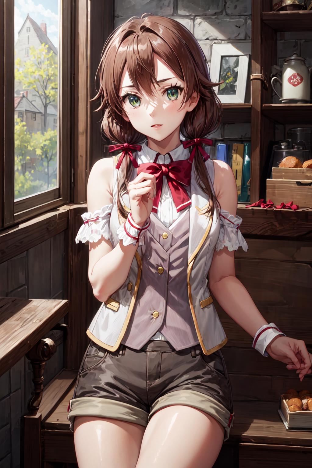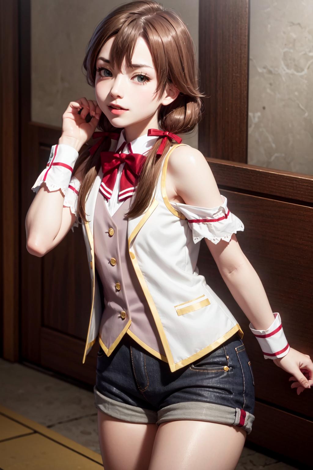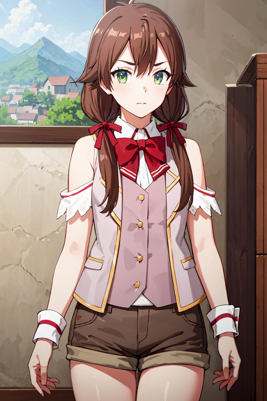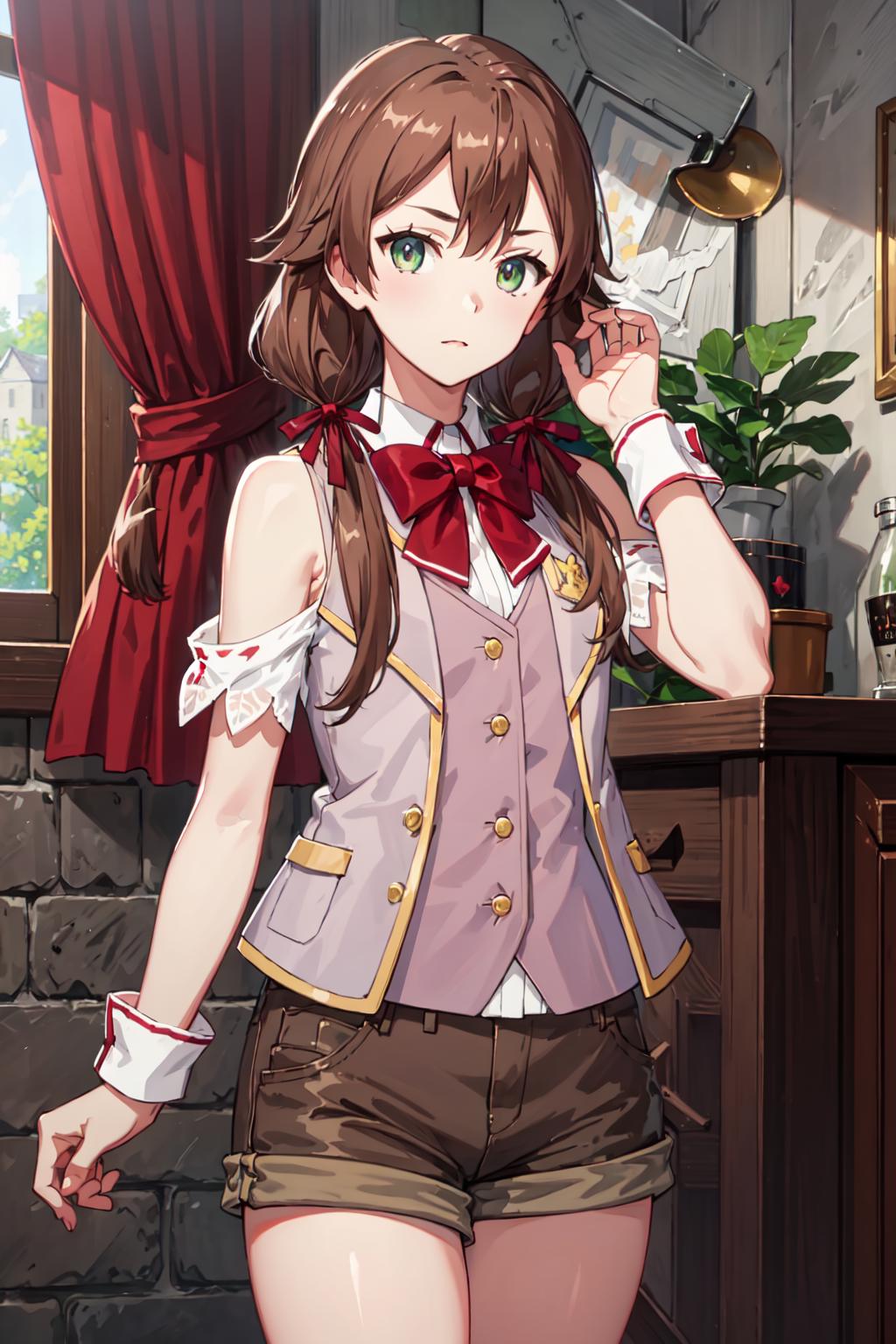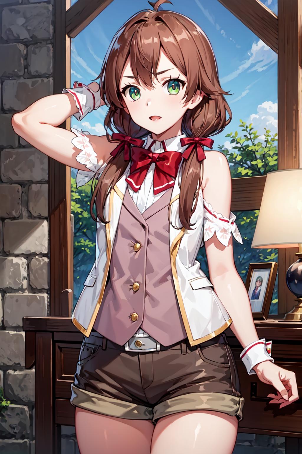 ((best quality, high quality, masterpiece, highres)), roroa amidonia, 1girl, solo, looking at viewer, red bow, red ribbon, indoors, red bowtie, wrist cuffs, vest, shorts, cowboy shot